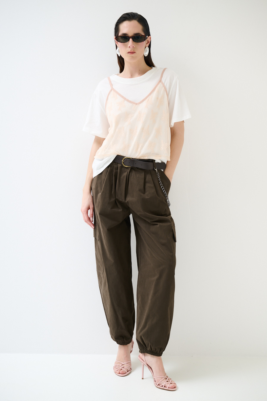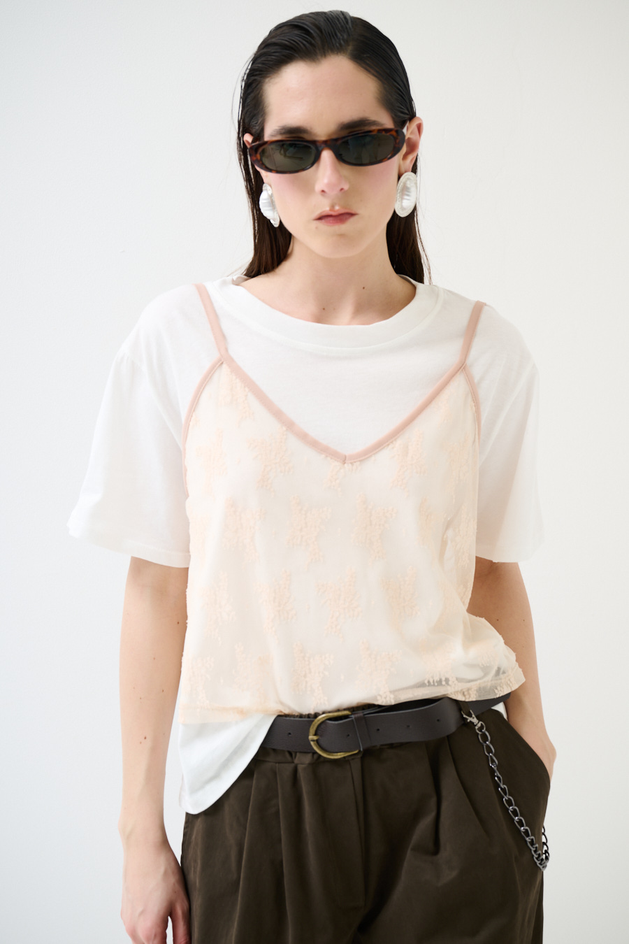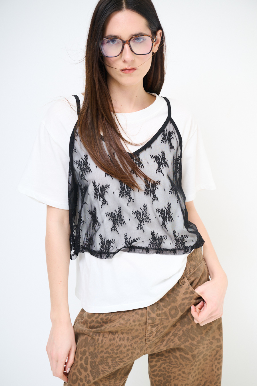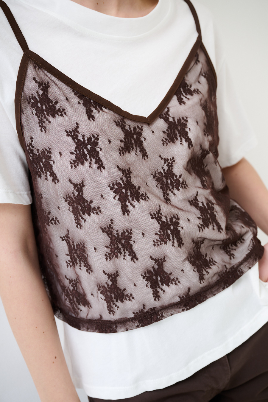 Basic crewneck T-shirt with lace top overlay and thin adjustable straps