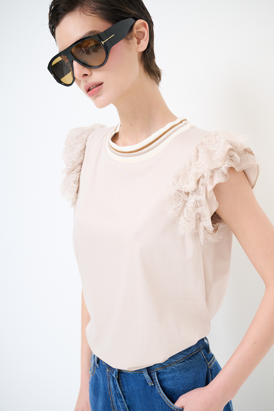 T-SHIRT CON VOLANT PIZZO MANICA + COSTINA BEIGE