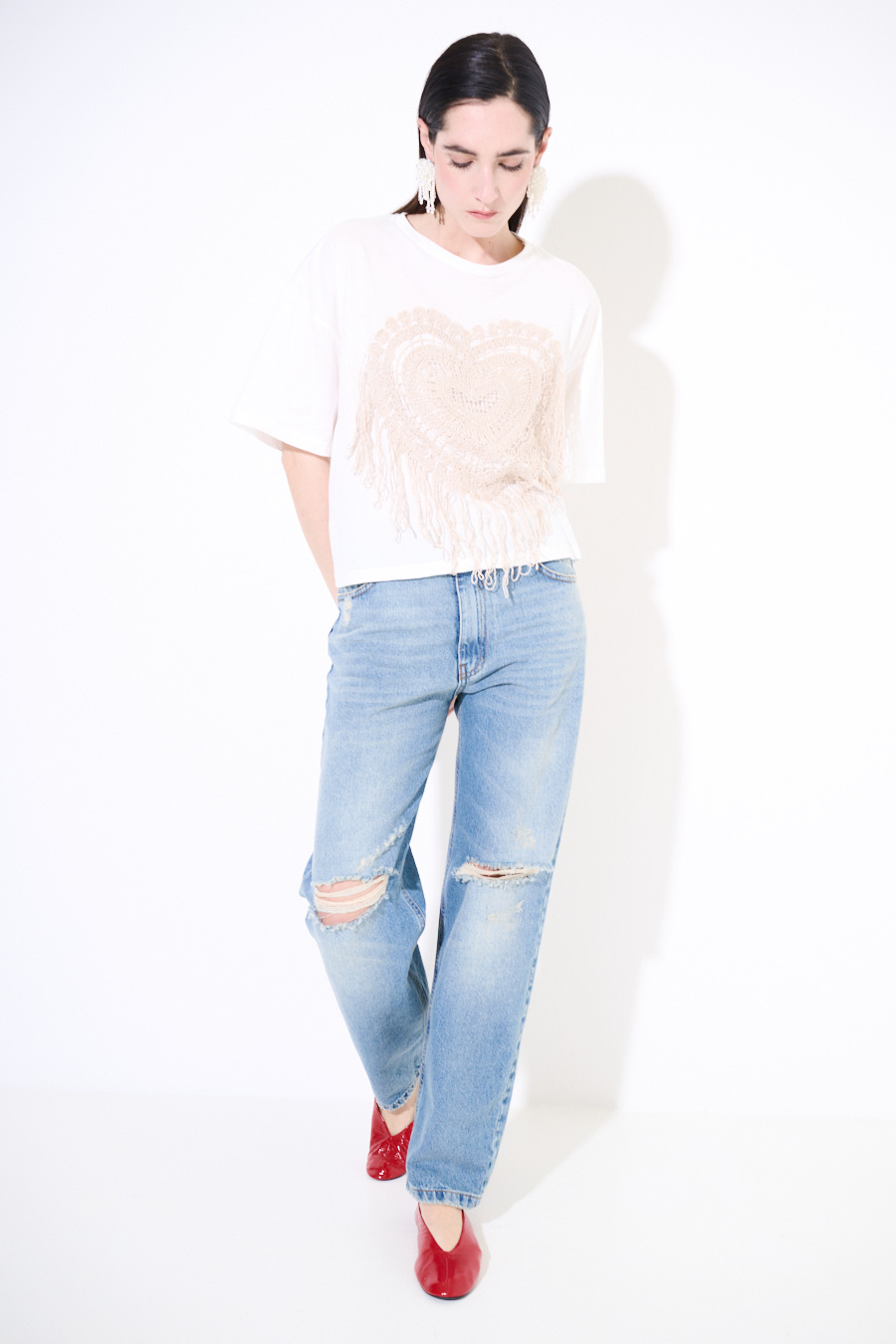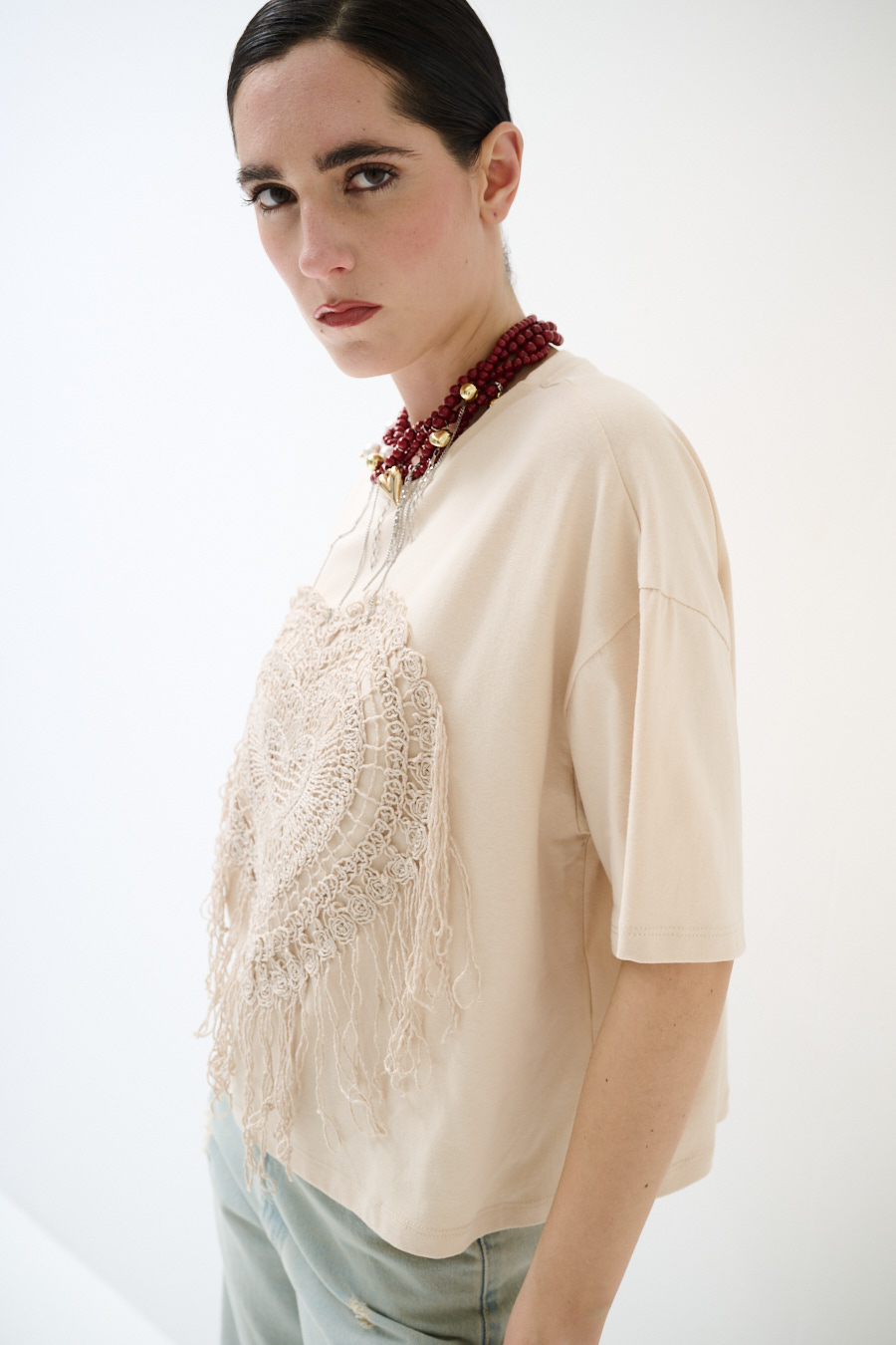 Boxy fit cropped T-shirt with macramé appliqué on the front