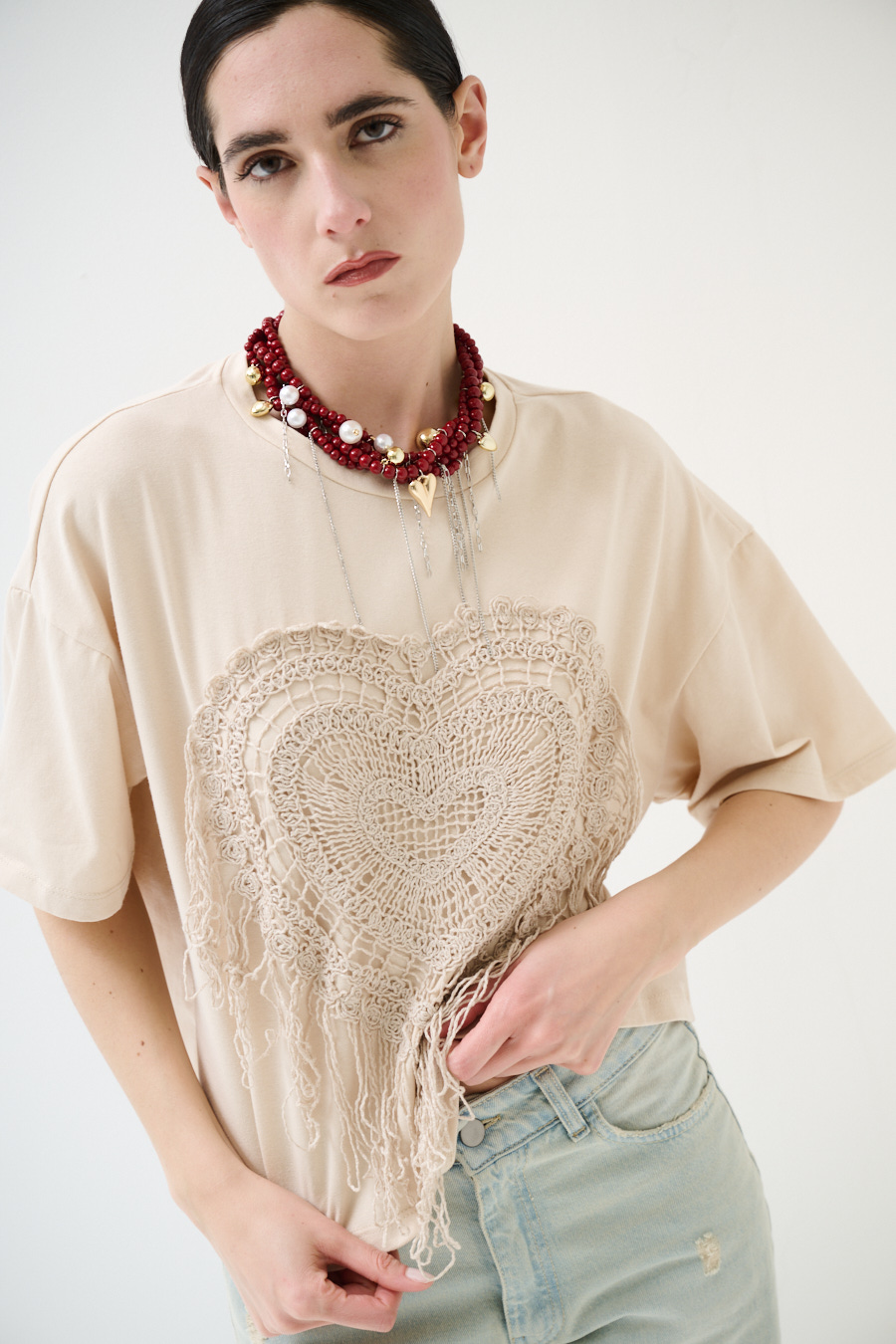 Boxy fit cropped T-shirt with macramé appliqué on the front