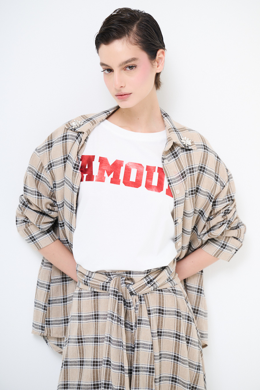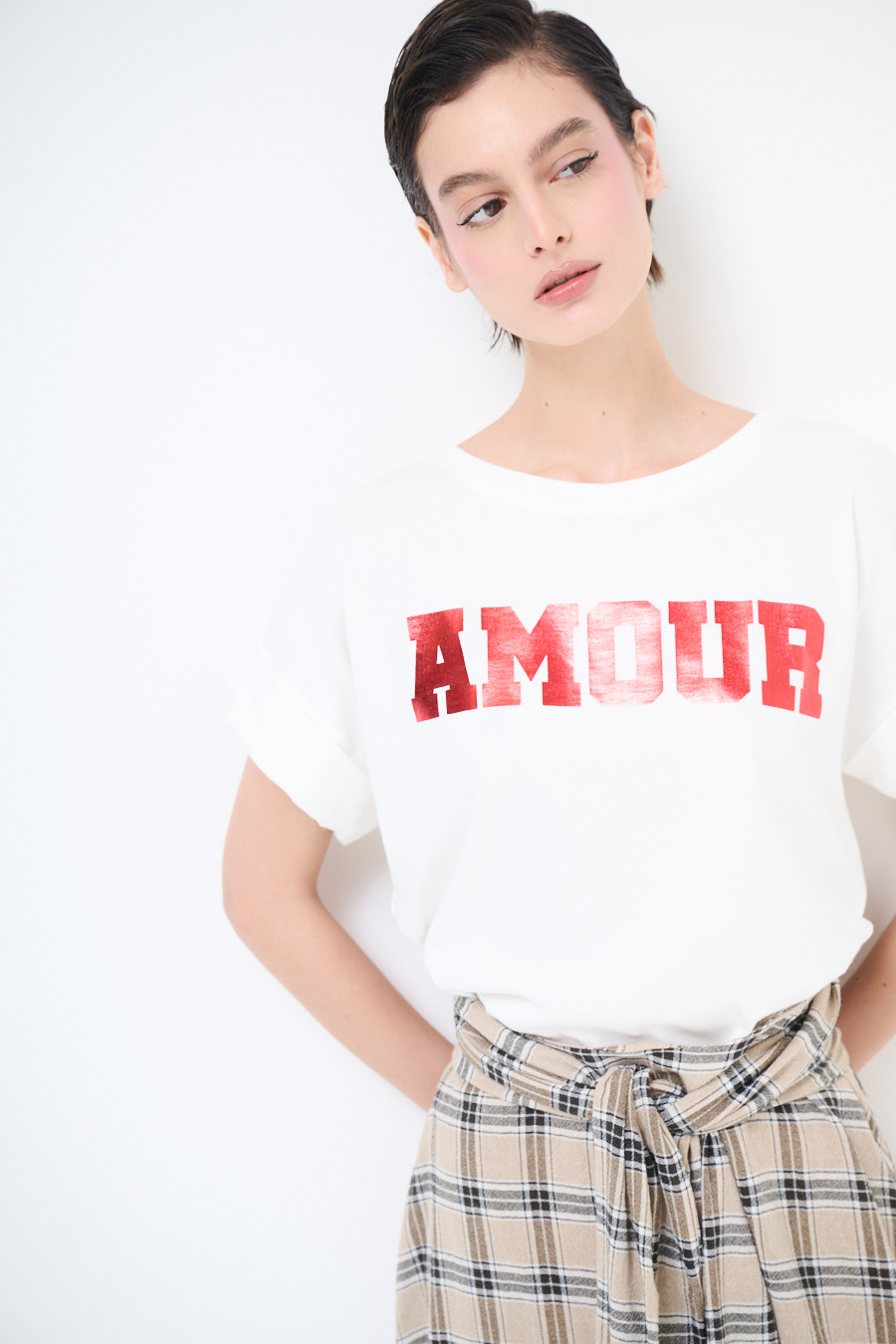 Basic T-shirt with metallic 'Amour' print and rolled sleeves