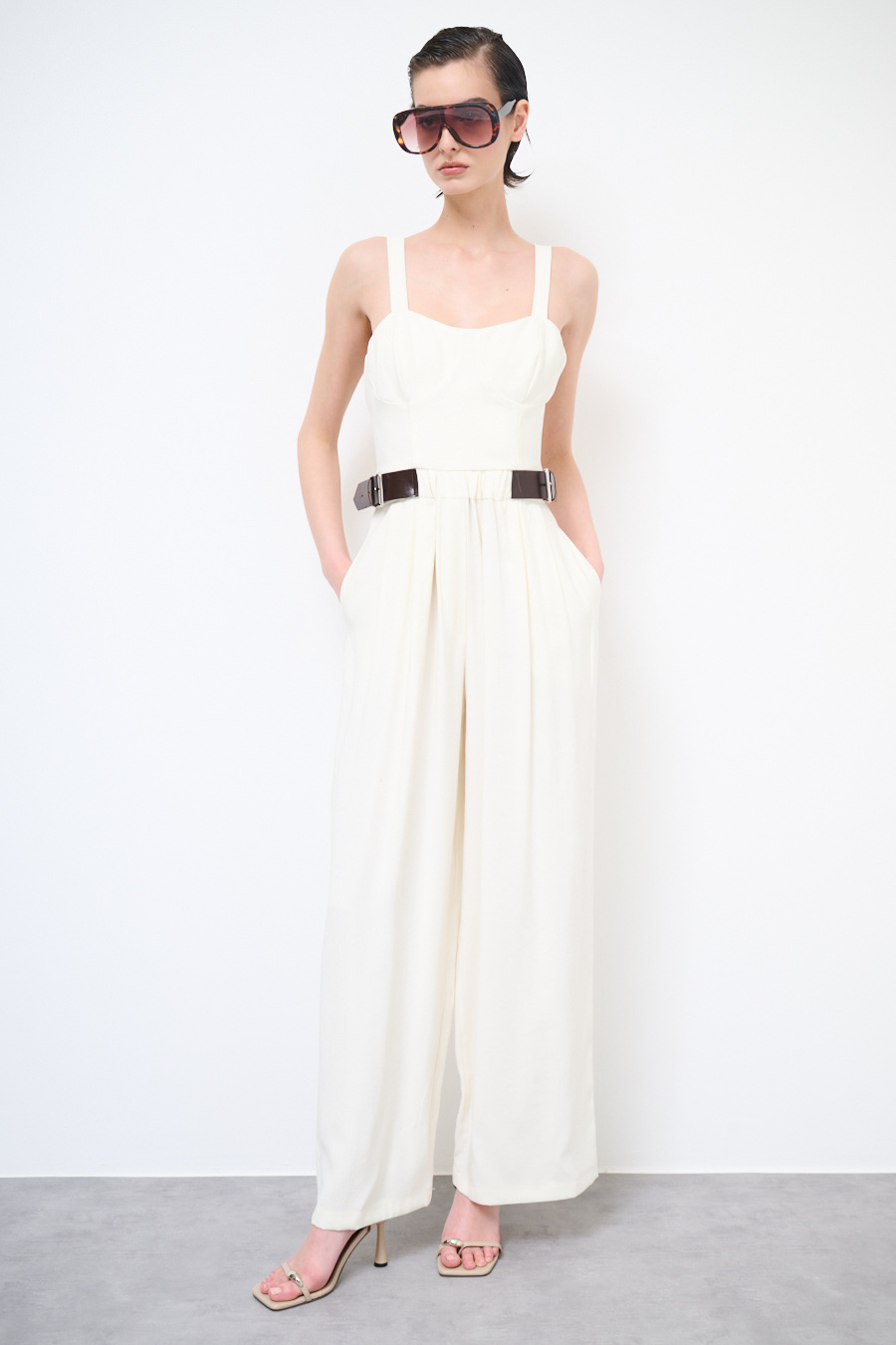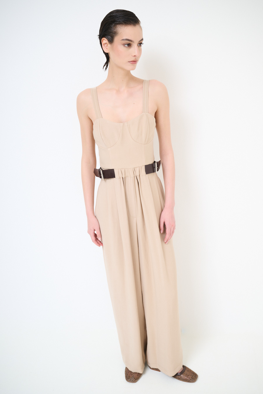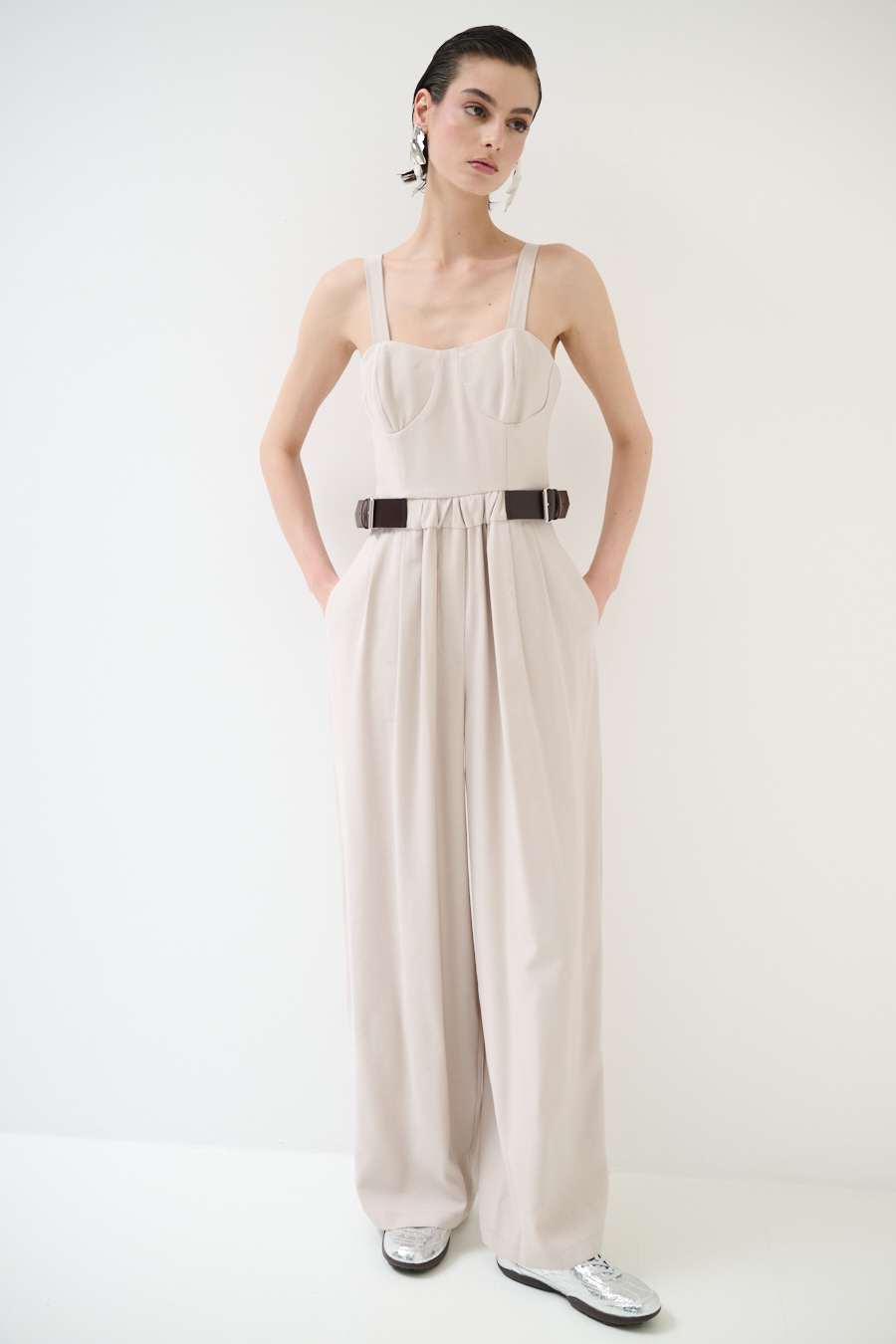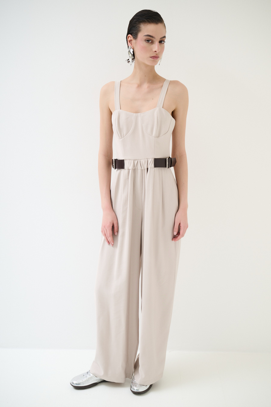 Palazzo jumpsuit with soft legs, straps, faux corset detail, gathered waist, and belt