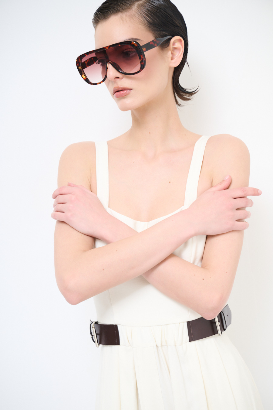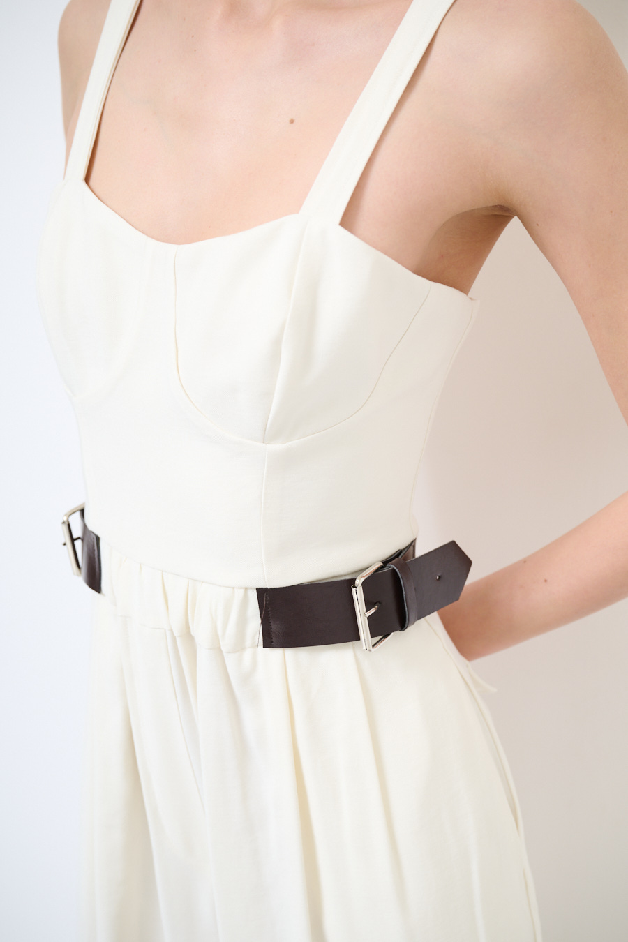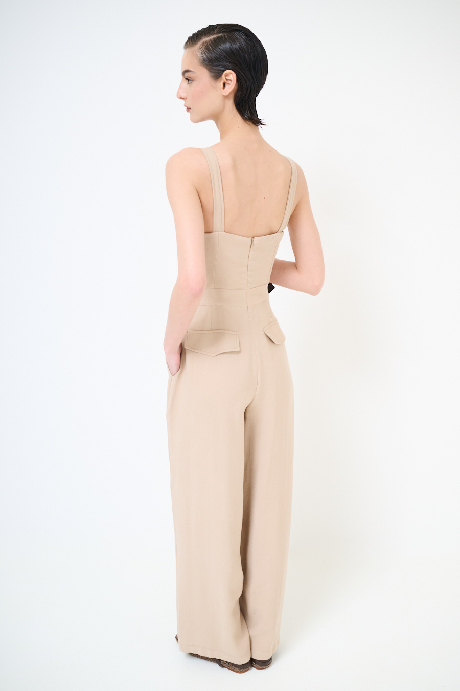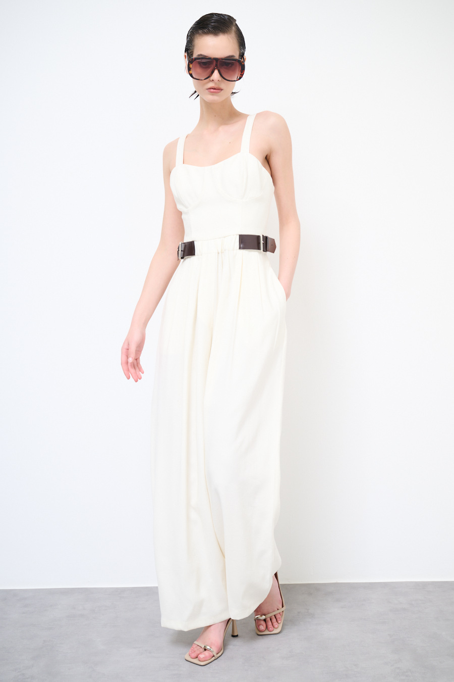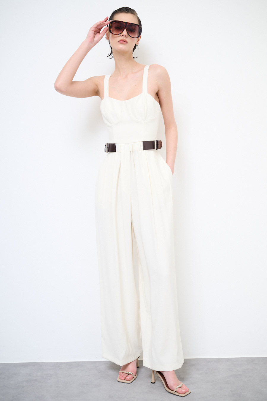 Palazzo jumpsuit with soft legs, straps, faux corset detail, gathered waist, and belt