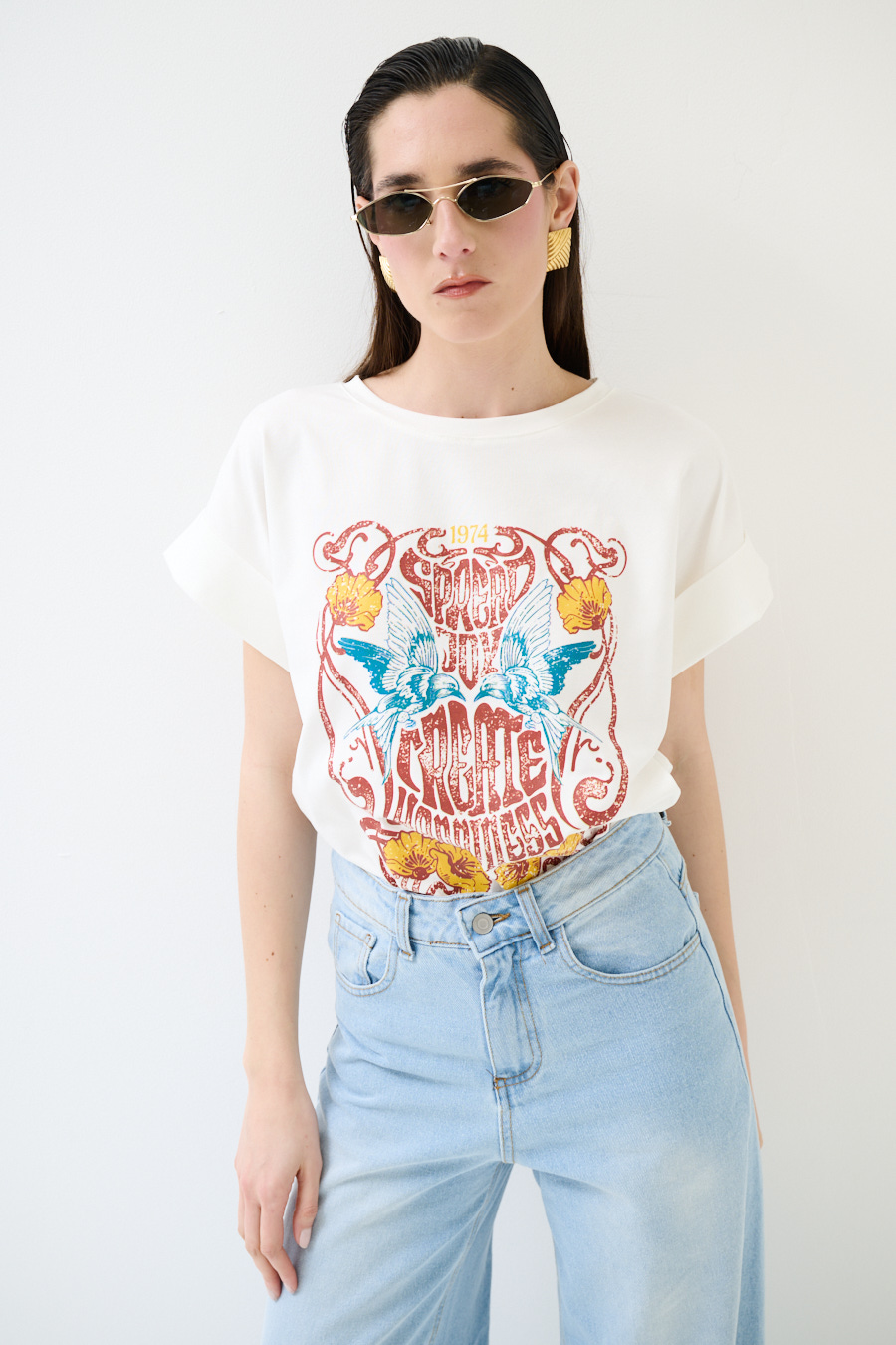 T-shirt boxy fit con stampa Happiness e maniche con risvolto