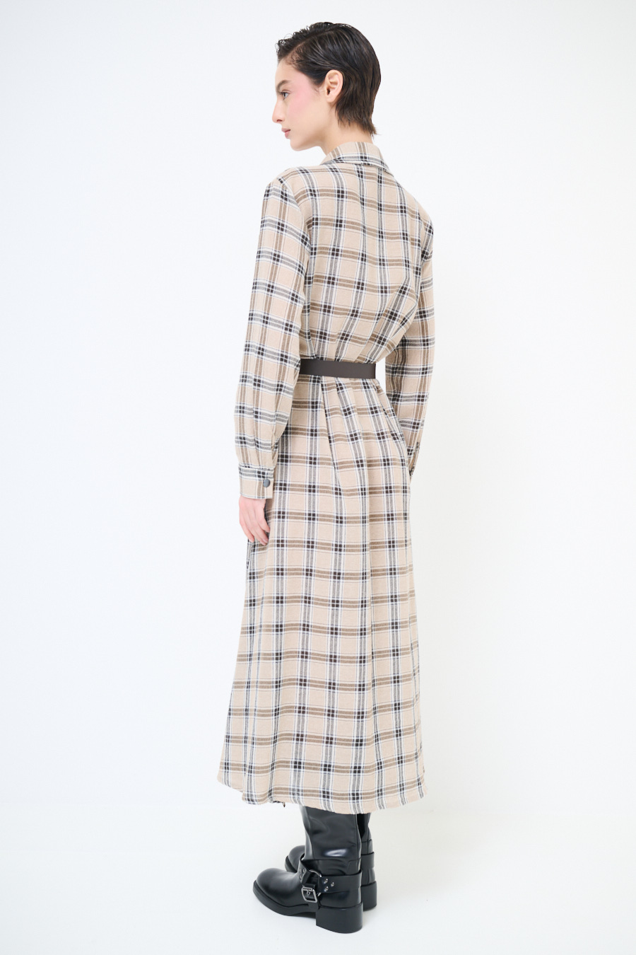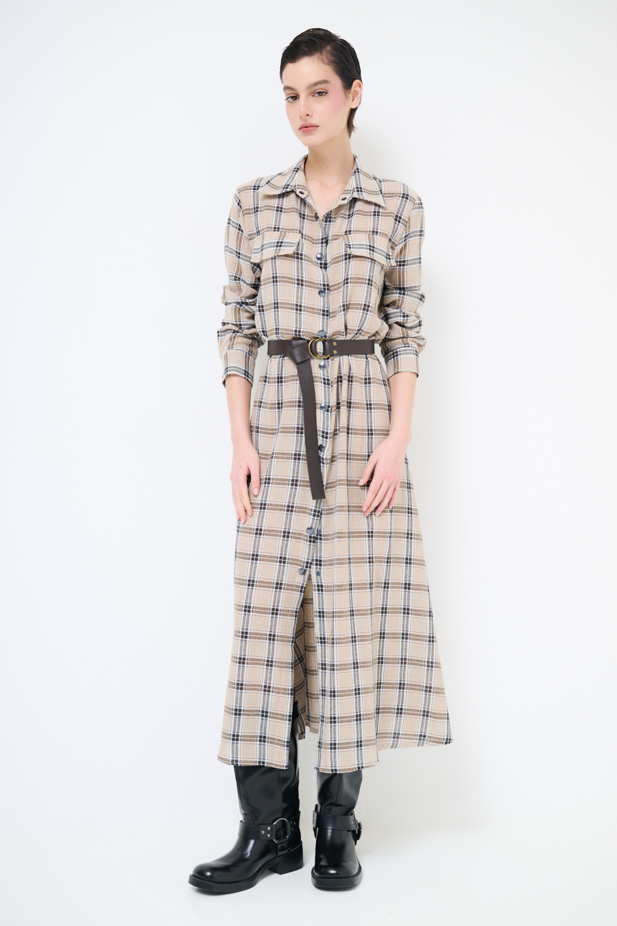 ABITO CHEMISIER A QUADRI CON CINTURA E BOTT. CAMMELLO
