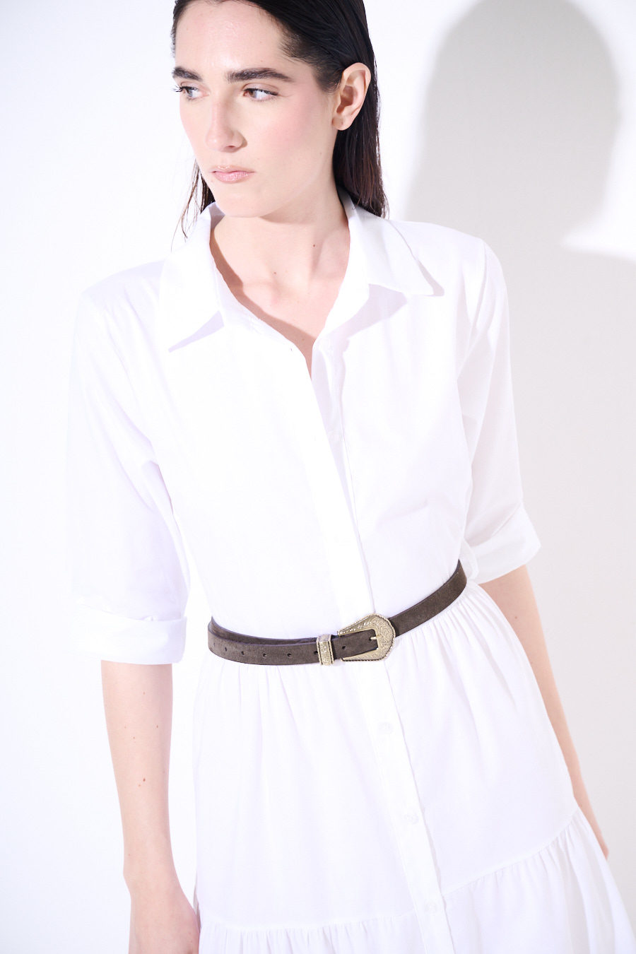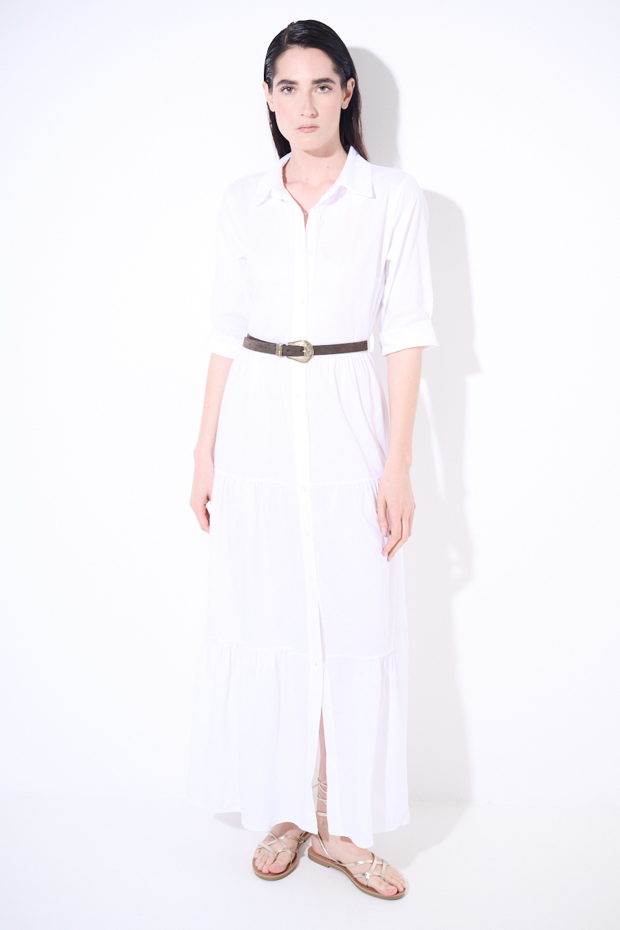 Abito chemisier lungo in popeline con manica a 3/4, abbottonatura centrale e a balze, con cintura