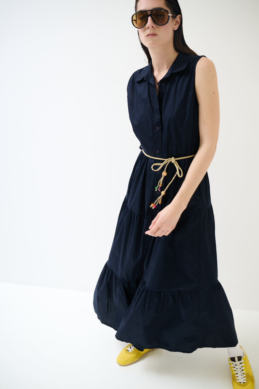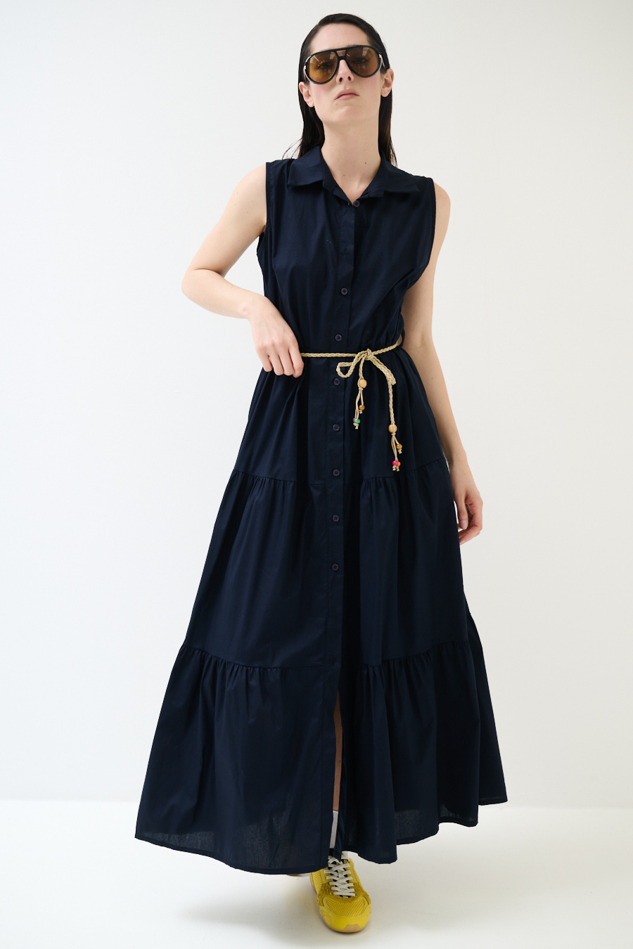 Abito chemisier a tinta unita lungo smanicato a balze con abbottonatura centrale e cintura in corda in vita