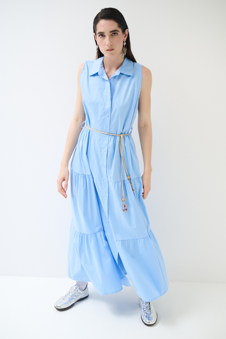 Abito chemisier a tinta unita lungo smanicato a balze con abbottonatura centrale e cintura in corda in vita