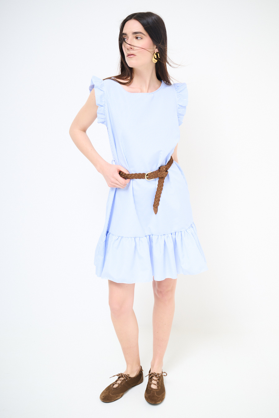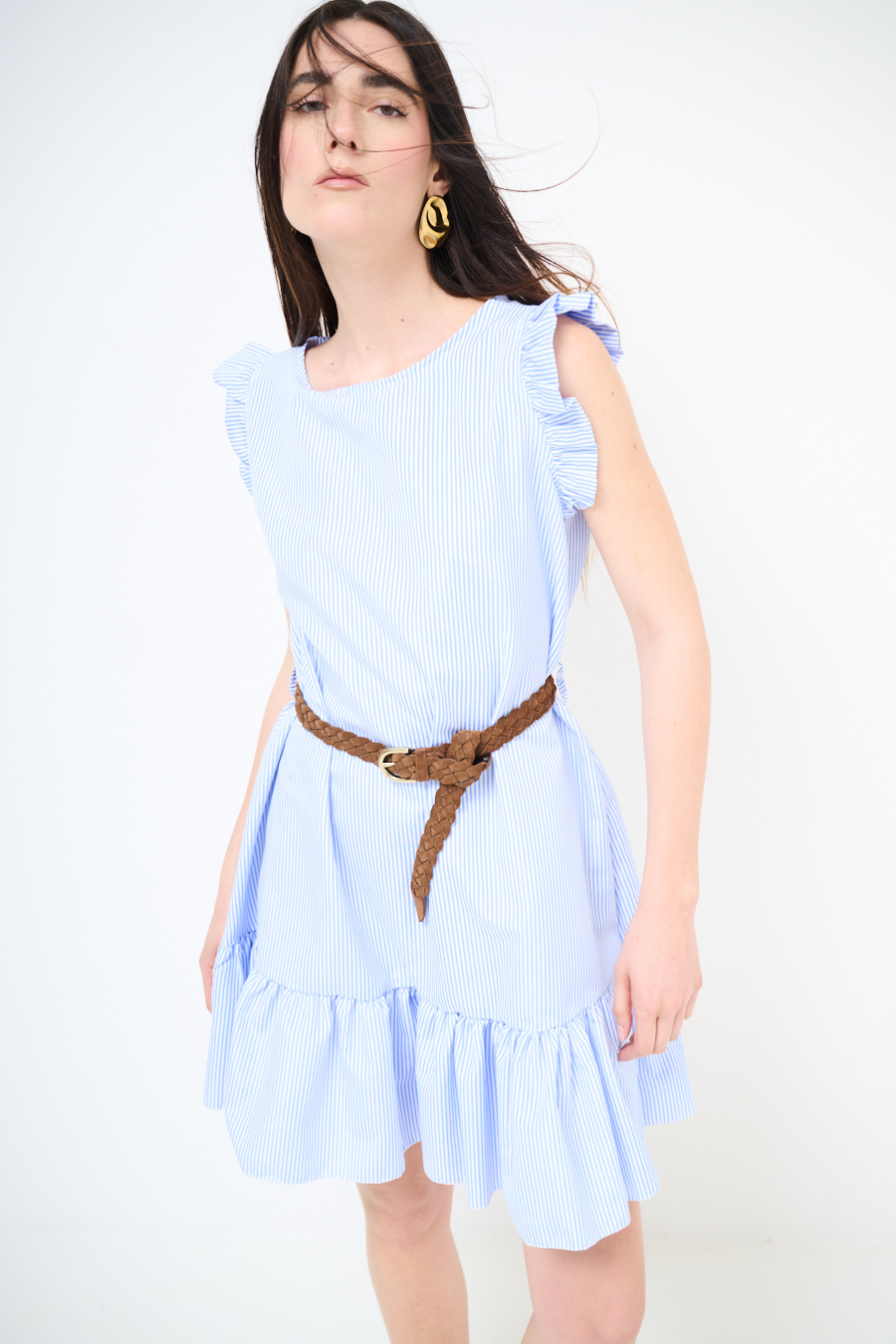Abito corto in popeline leggero a righe con balza sul fondo e aletta con gale sulle spalle, con abbottonatura centrale e cinturino in corda in vita
