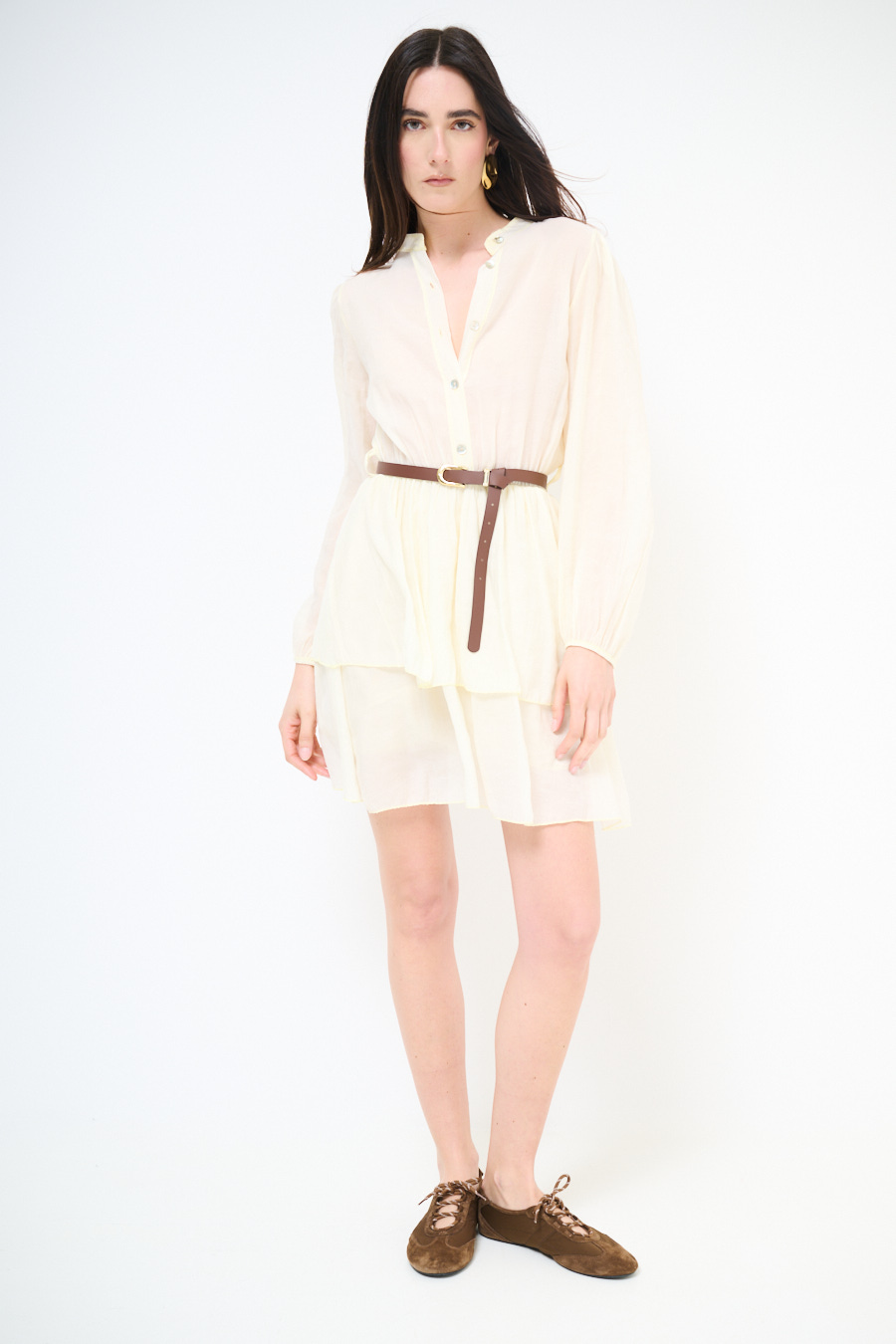 Abito corto con balza sul fondo, abbottonatura centrale fino alla vita, con cintura, colletto a coreana e manica lunga con elastico al polso