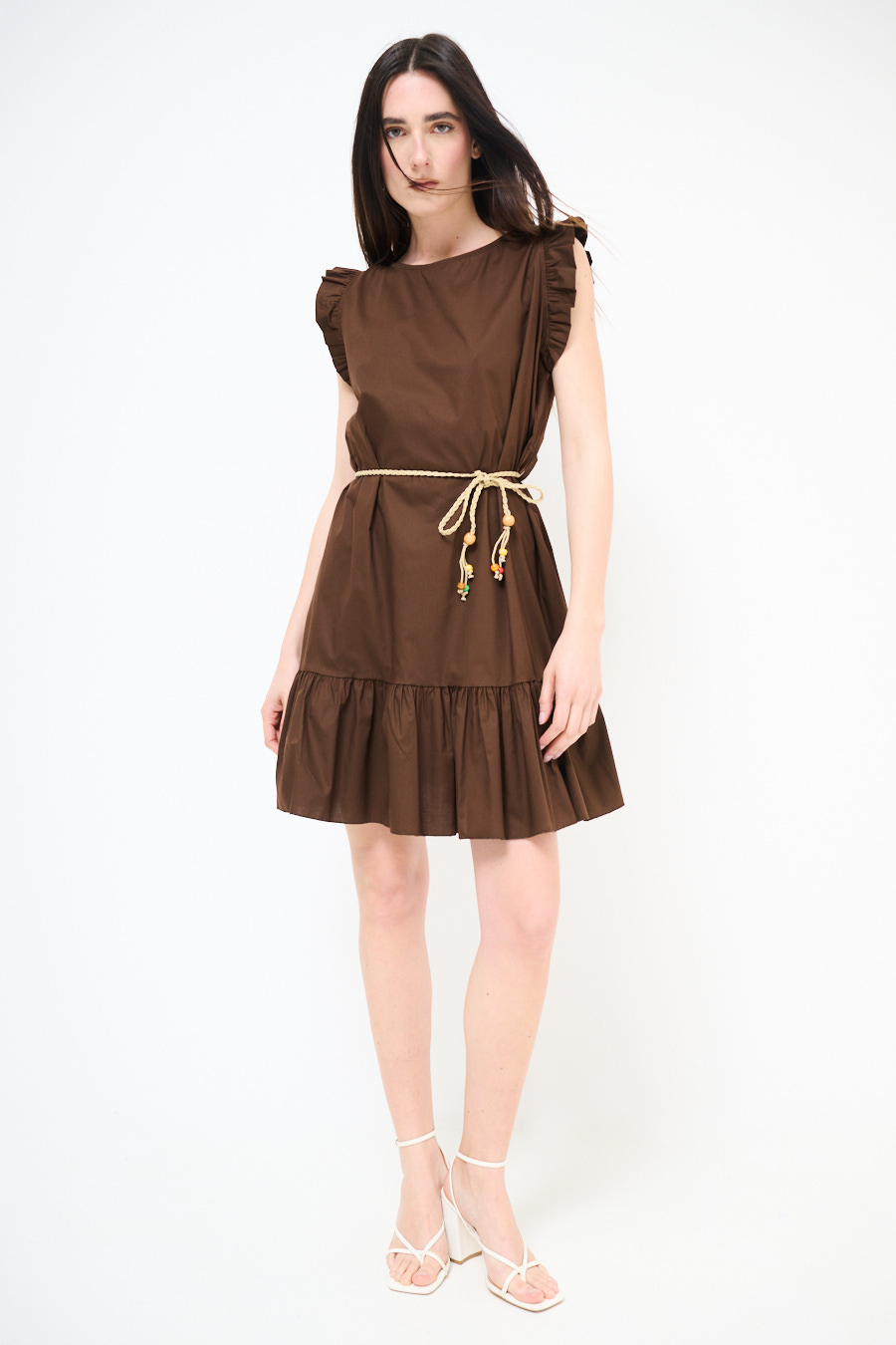 Abito corto in popeline leggero a righe con balza sul fondo e aletta con gale sulle spalle, con abbottonatura centrale e cinturino in corda in vita