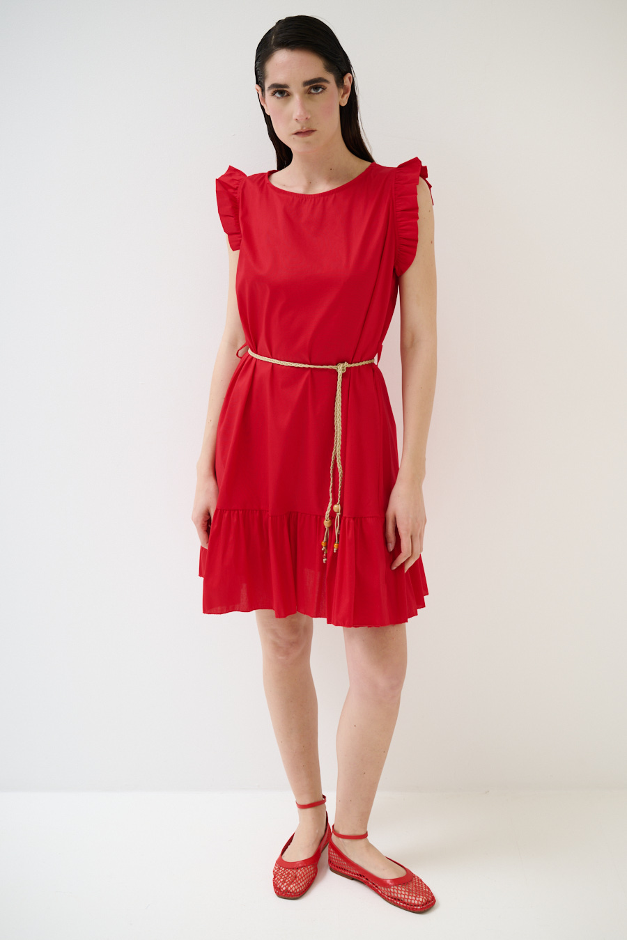Abito corto in popeline leggero a righe con balza sul fondo e aletta con gale sulle spalle, con abbottonatura centrale e cinturino in corda in vita