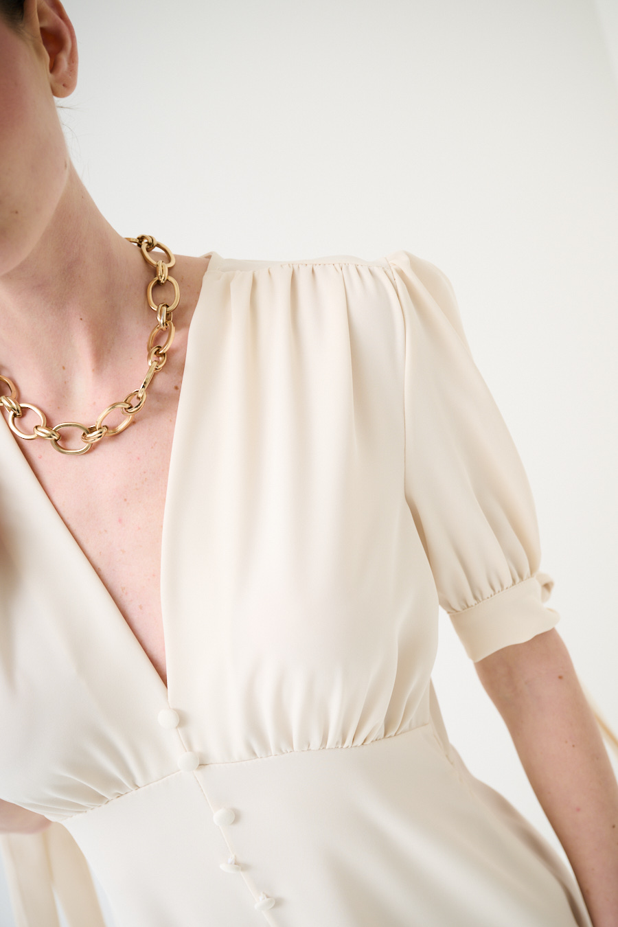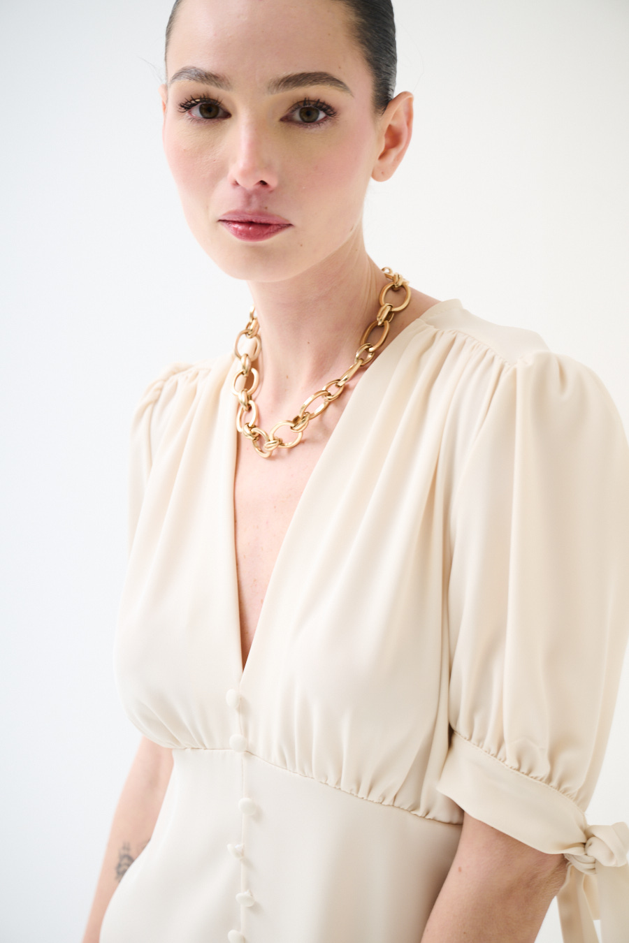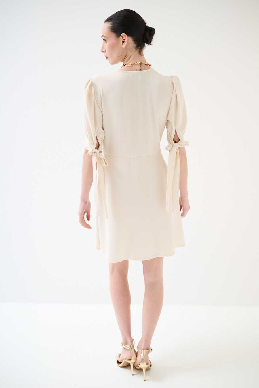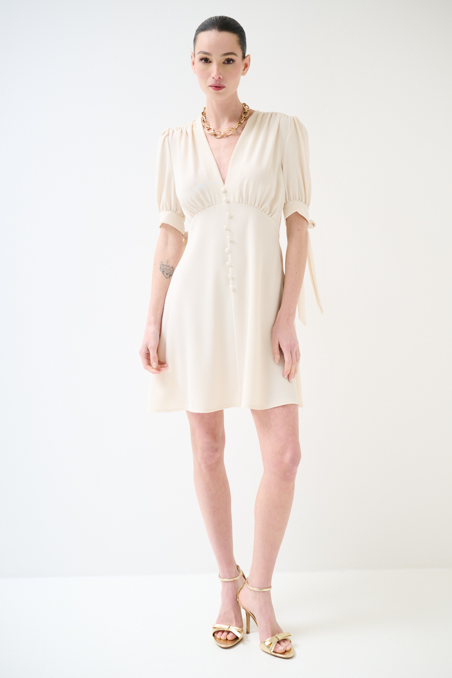 Abito corto in tessuto fluido con bottoni ricoperti frontali, manica corta a sbuffo con fiocco e scollo a v frontale