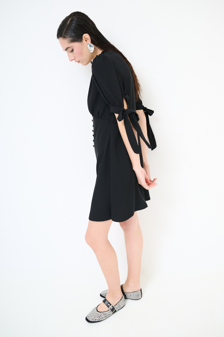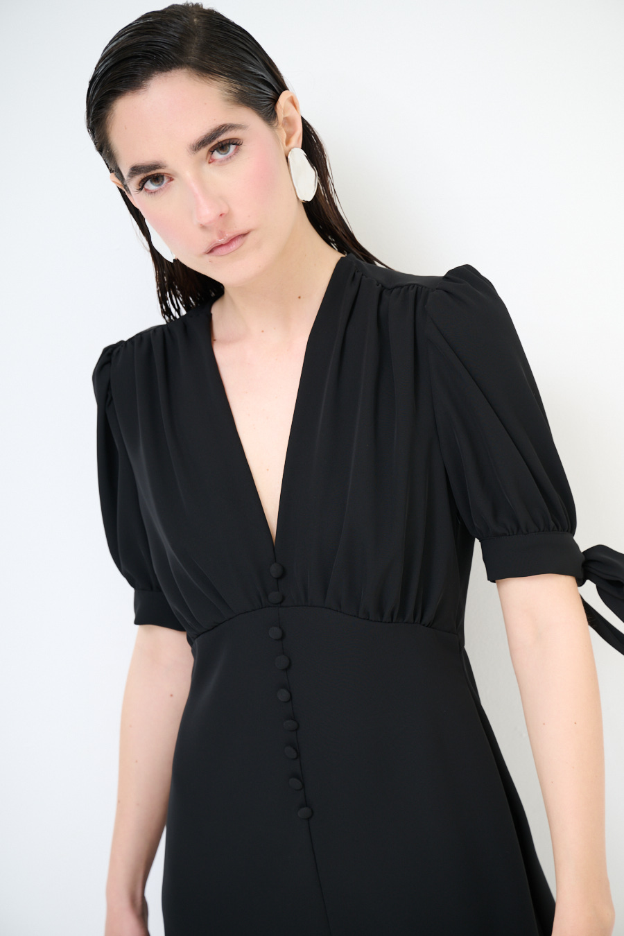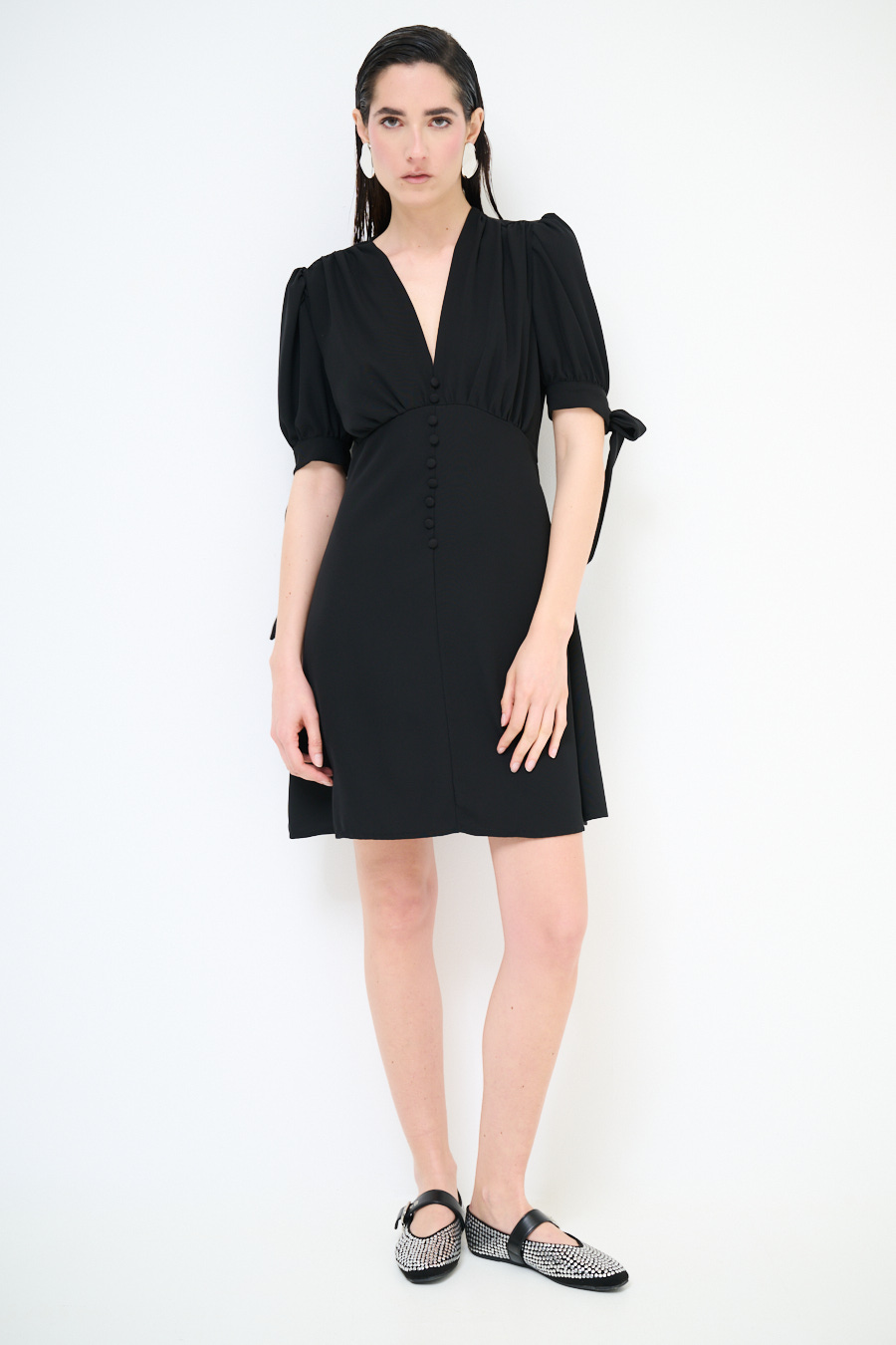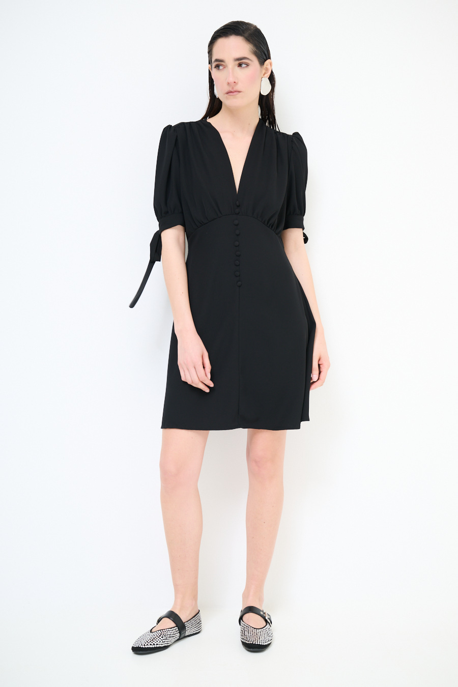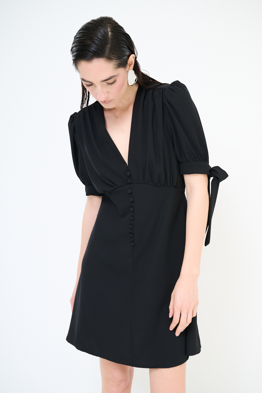 Abito corto in tessuto fluido con bottoni ricoperti frontali, manica corta a sbuffo con fiocco e scollo a v frontale