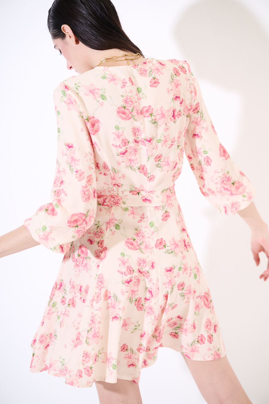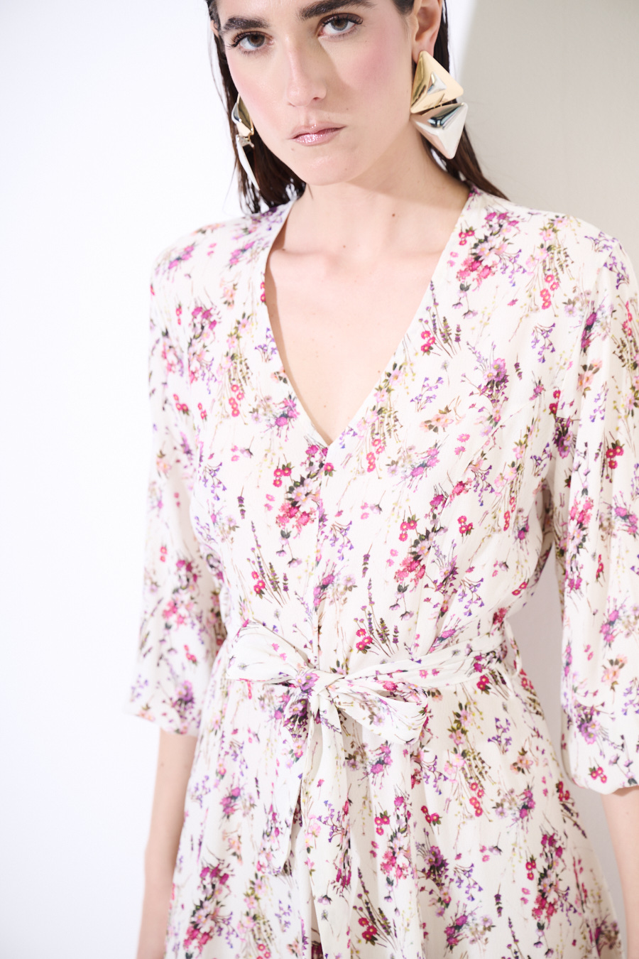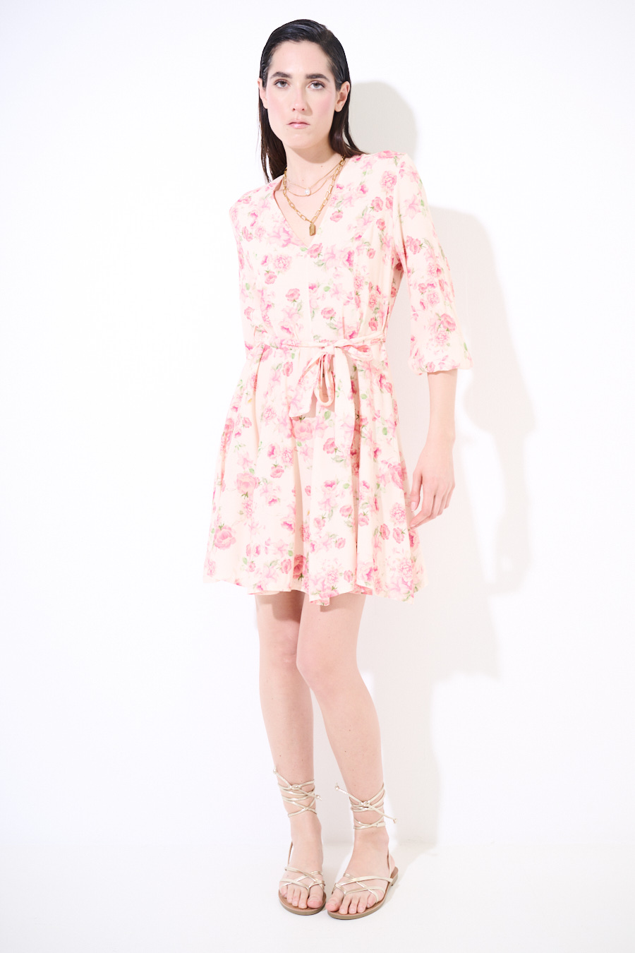 Abito corto a fantasia floreale con scollo a v e manica 3/4 con elastico, acon fusciacca in vita