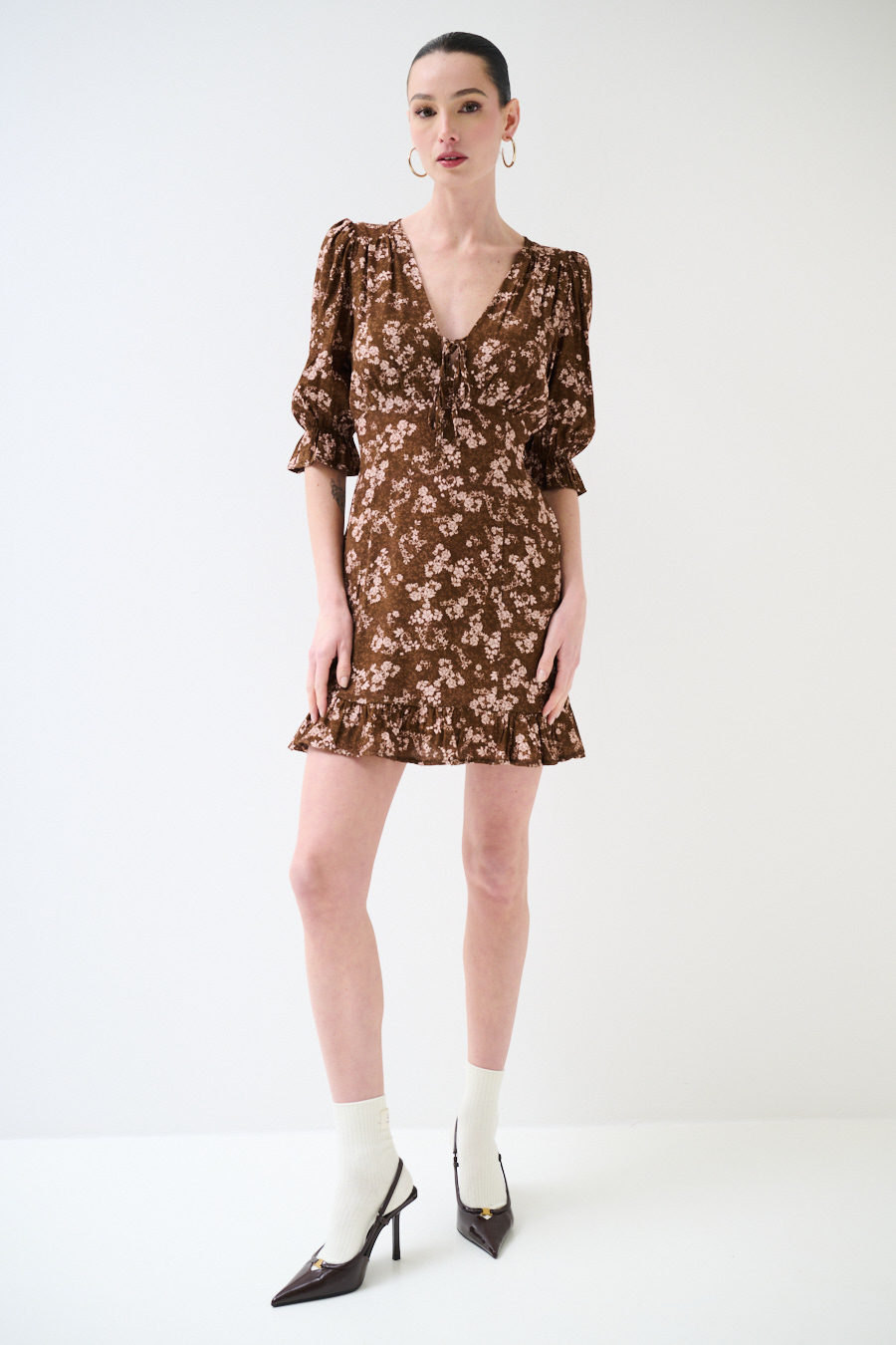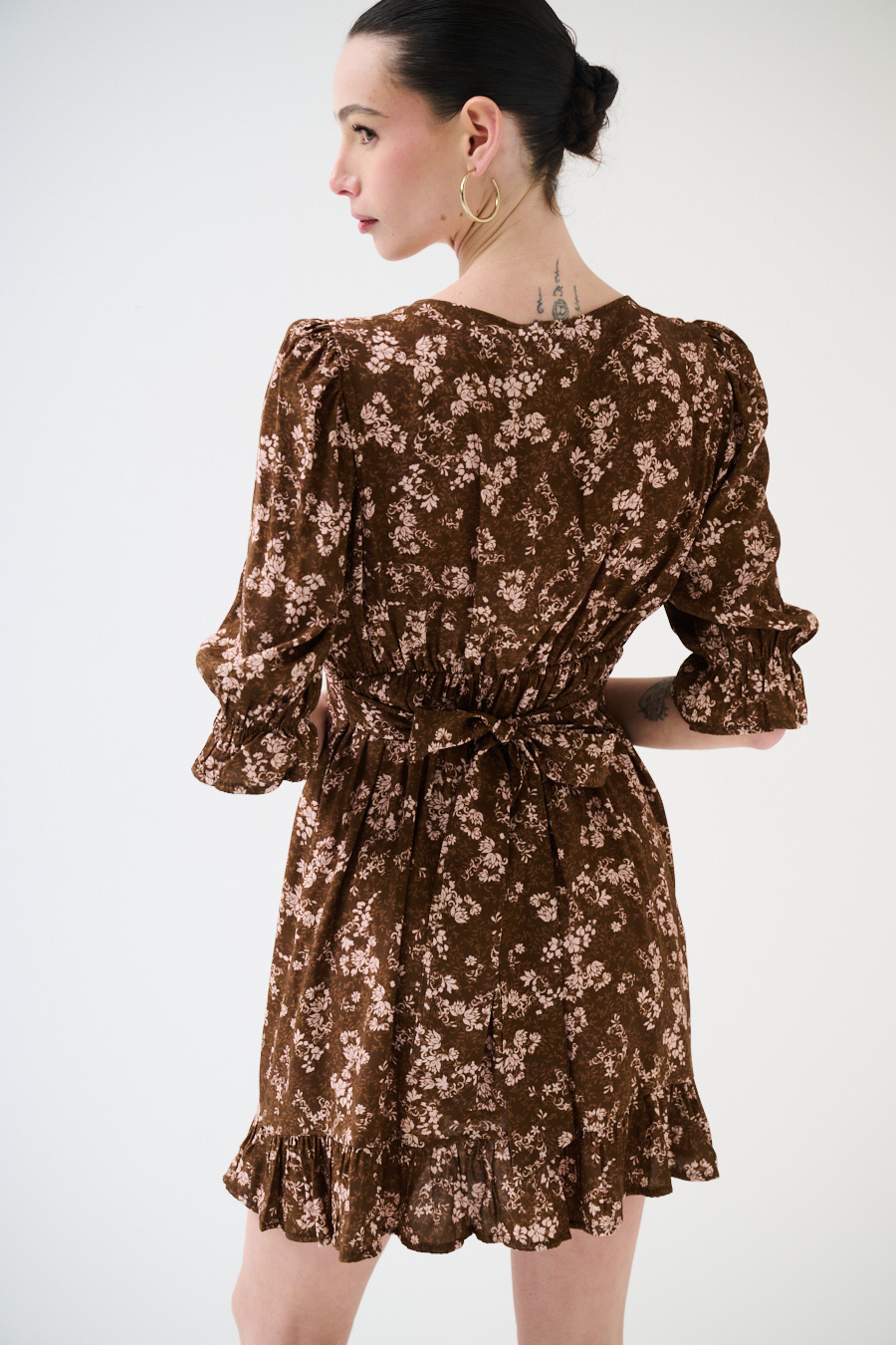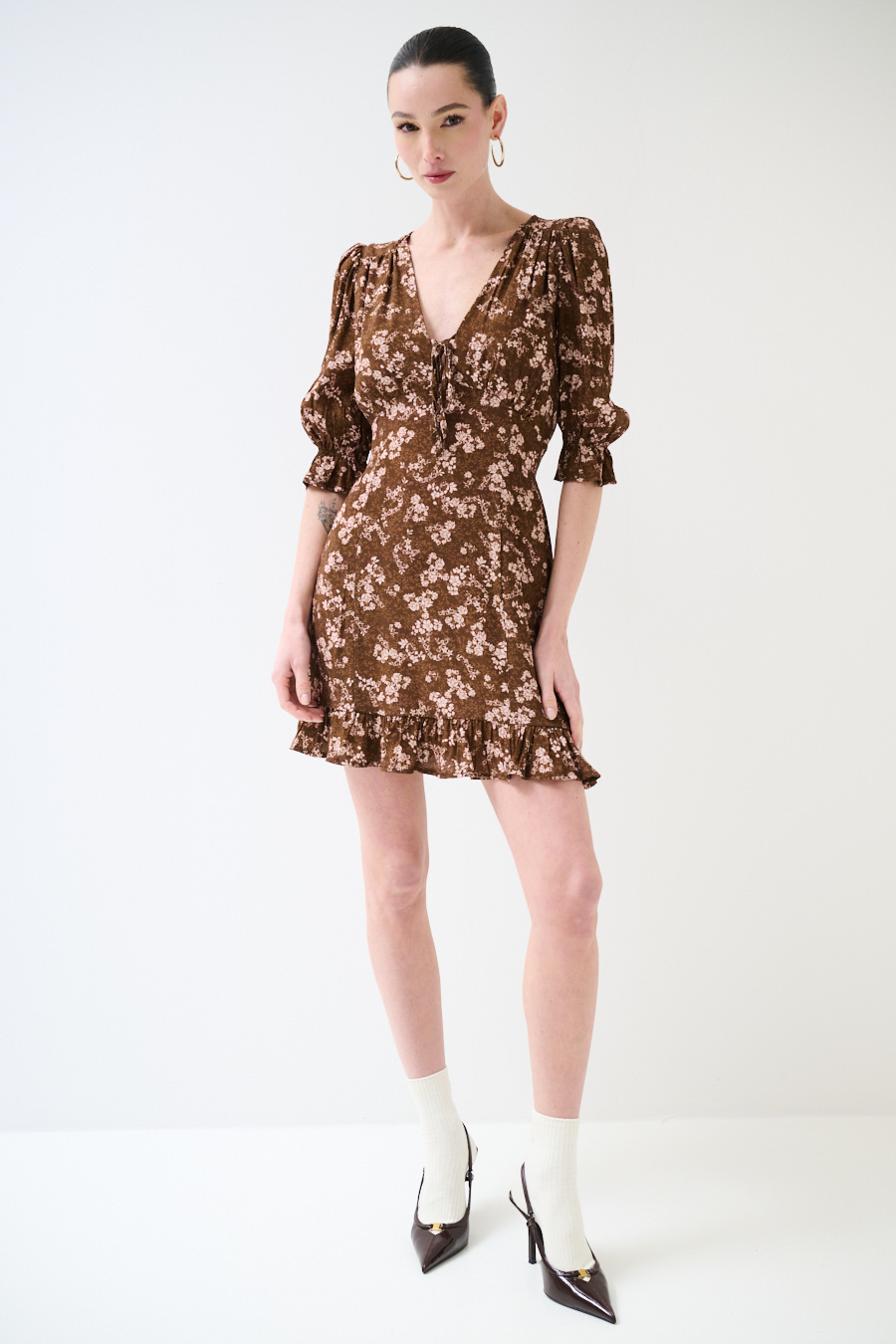 Abito corto a fantasia floreale con ampio scollo a v emanica corta arricciata. Annodato sul retro con cintura e balza sul fondo
