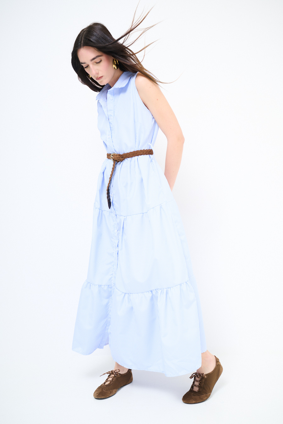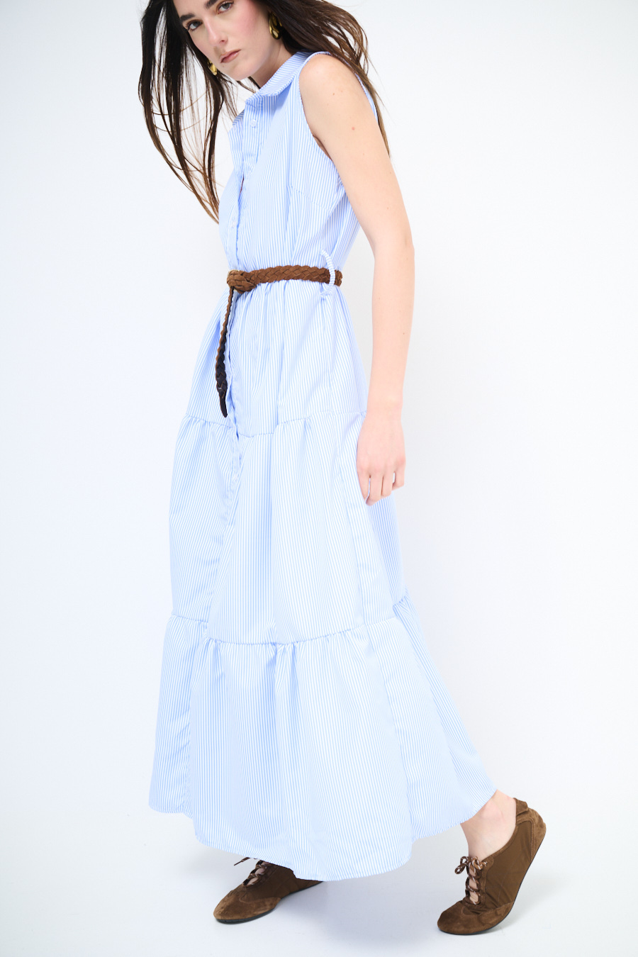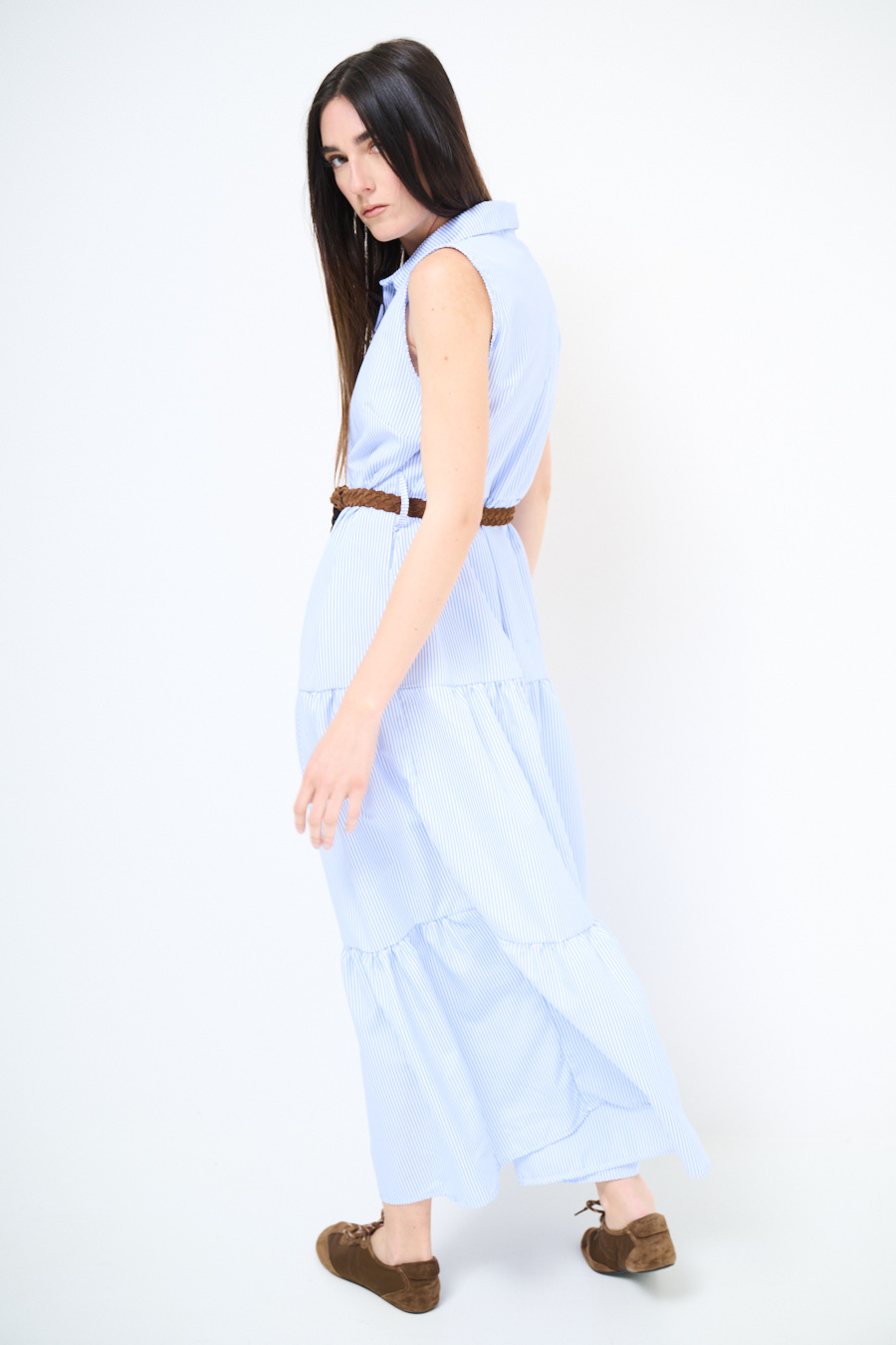 Abito chemisier a righe lungo smanicato a balze con abbottonatura centrale e cintura in corda in vita