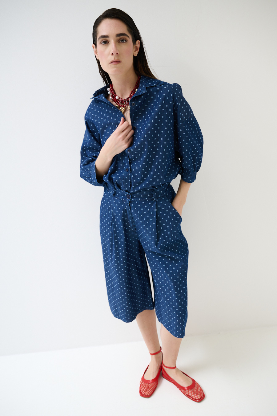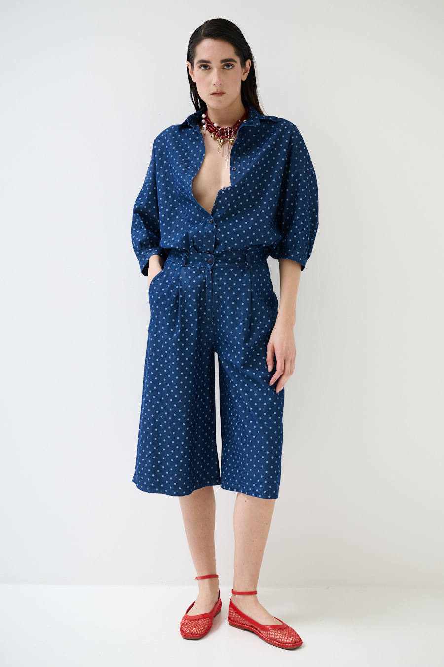 Bermuda in chambray con pois, ampio e con pinces, elasticizzato in vita sul retro