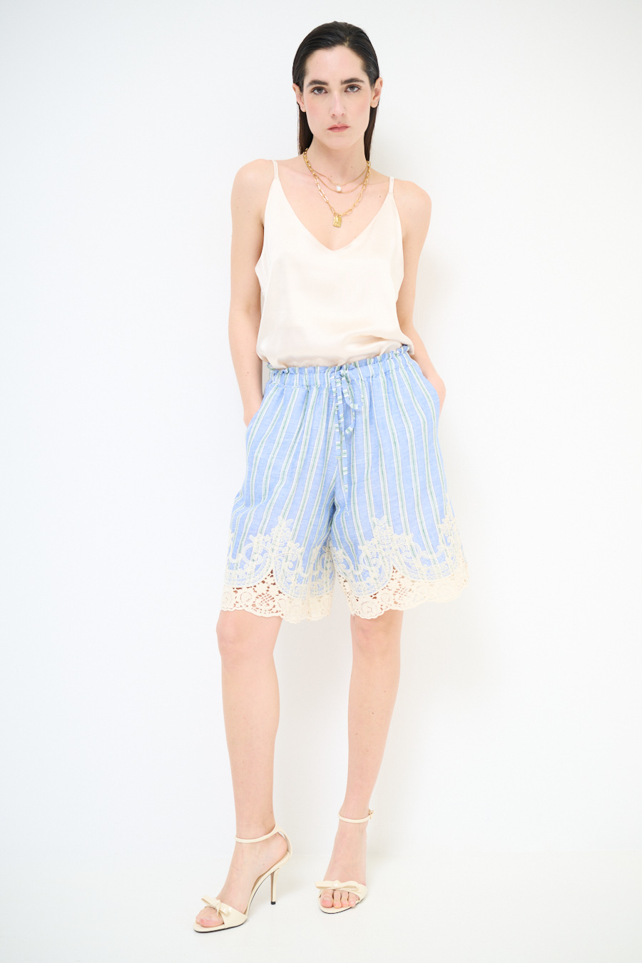 Bermuda in misto lino a righe morbido, con ricamo sul fondo e coulisse ed elastico in vita