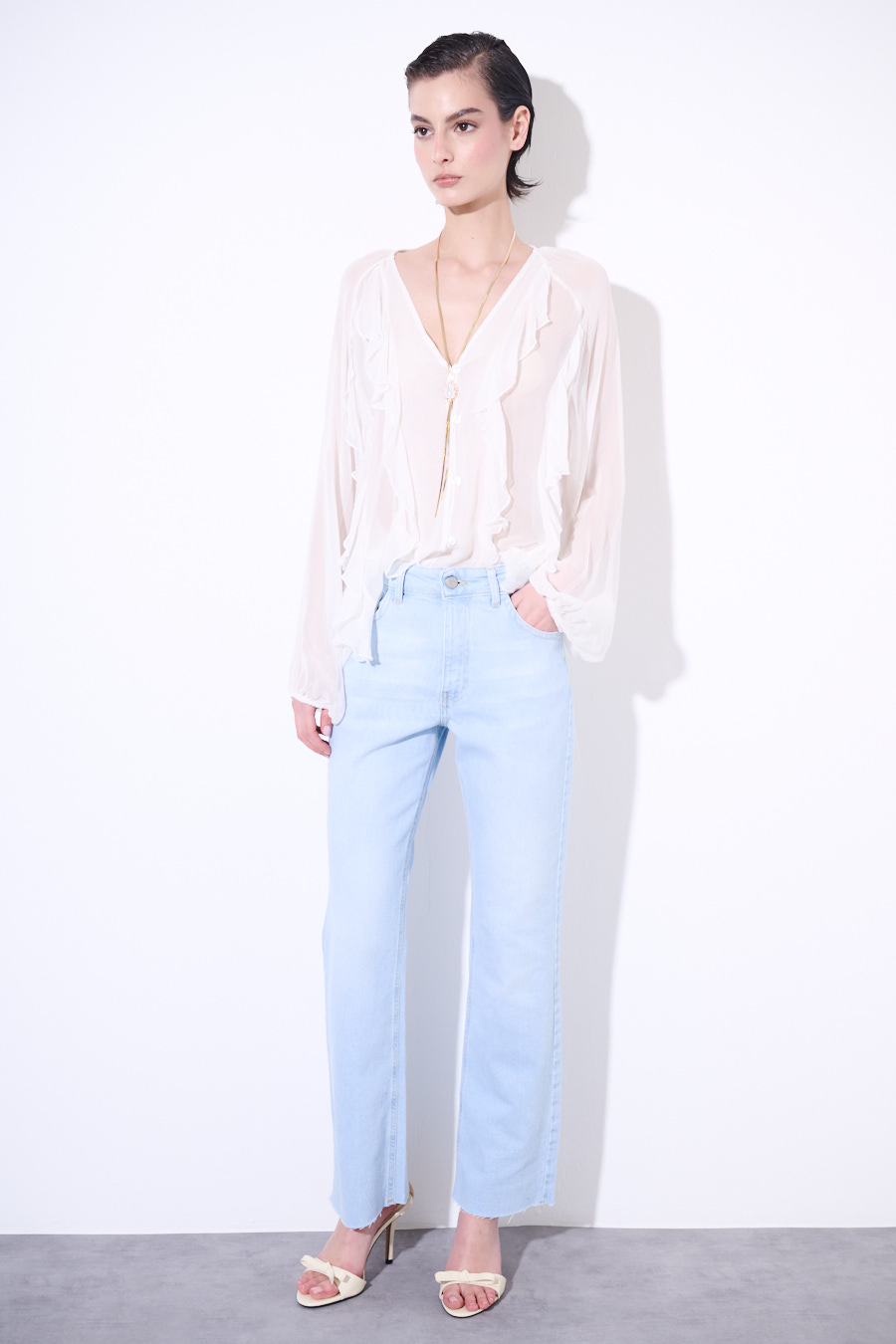 Casacca semitrsparente con scollo a v e abbottonatura centrale, volant sul fronte ed elasticizzata al polsino