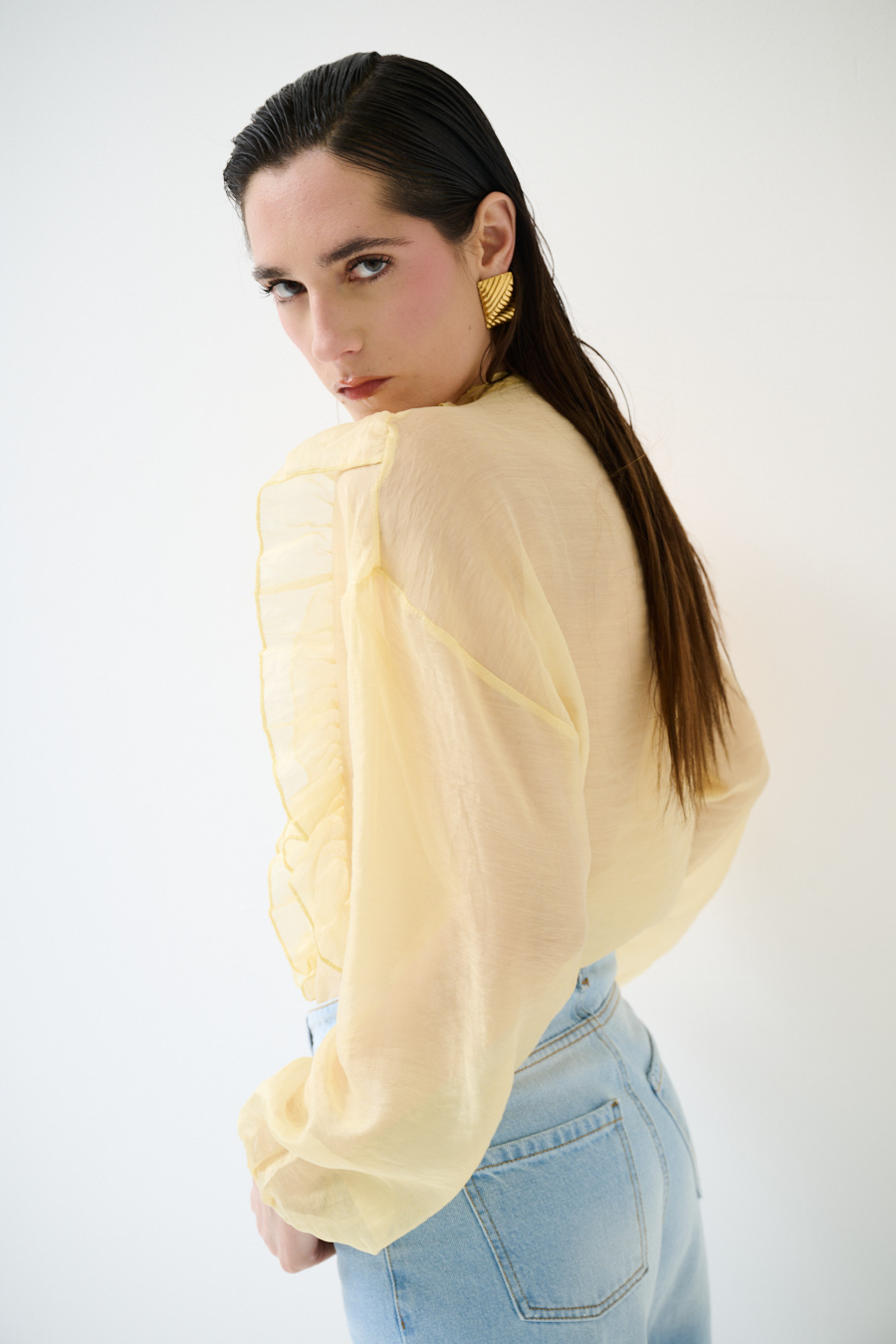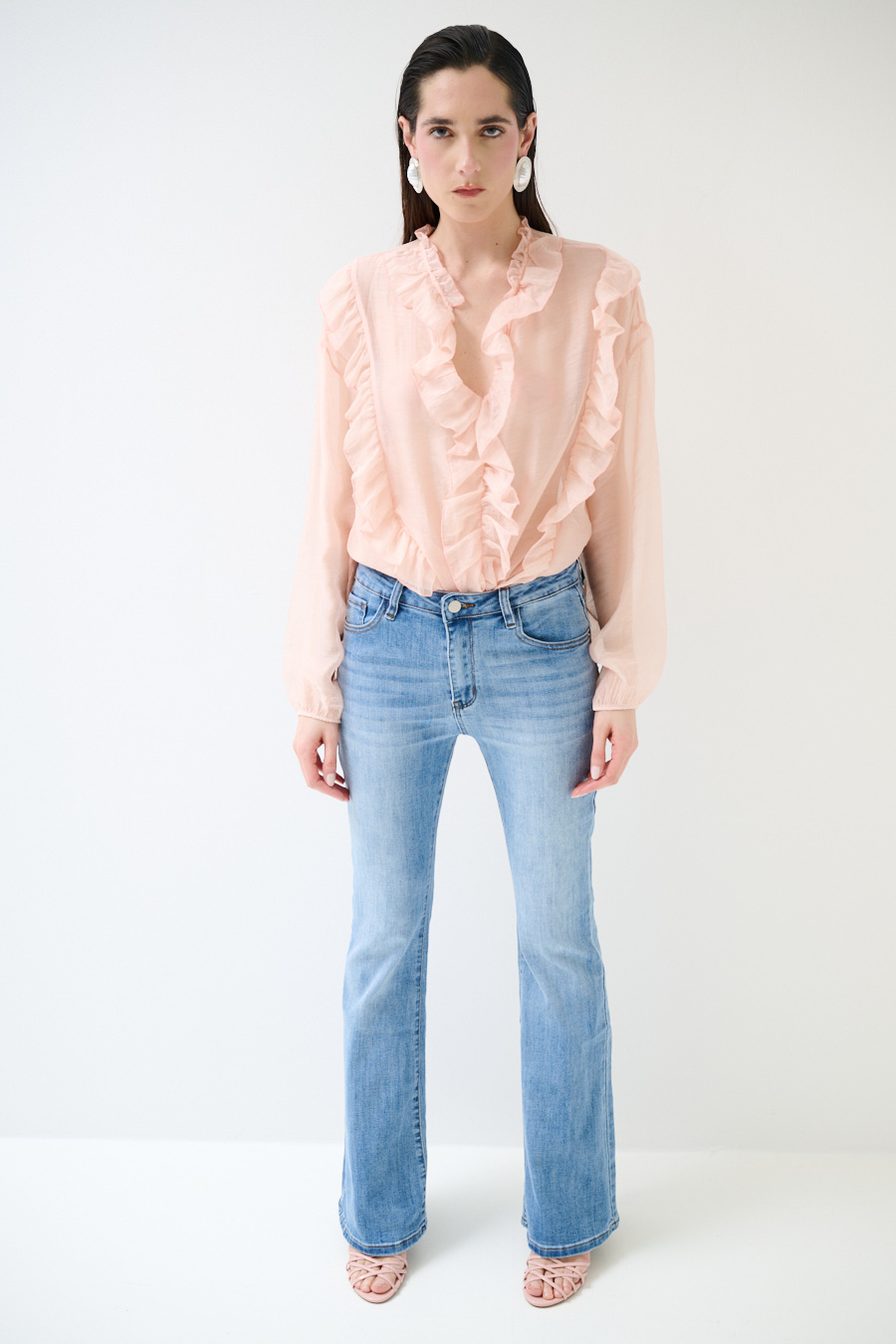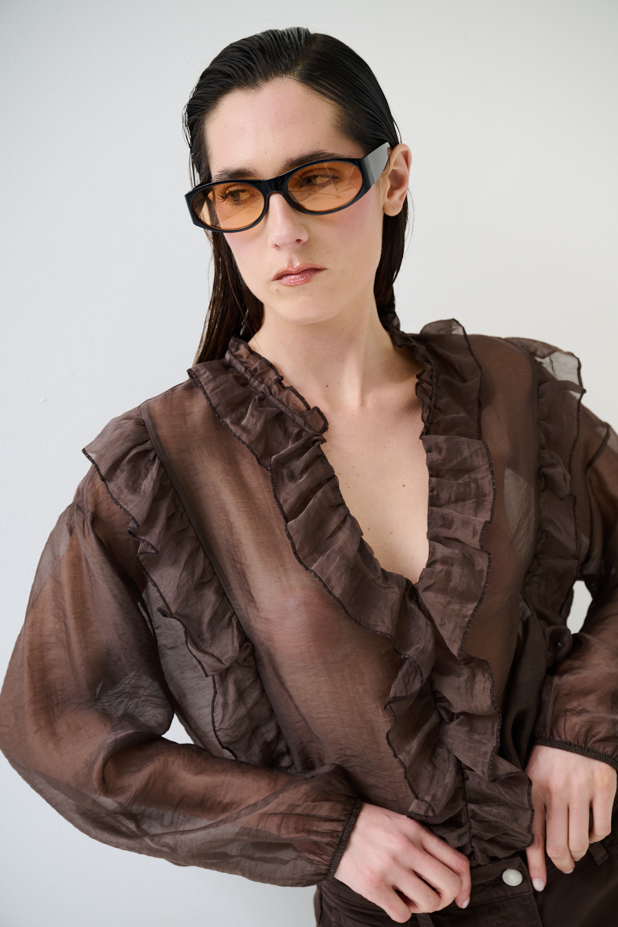 Casacca semi trasparente con doppia rouches sul fronte, ampio scollo a v ed elastico al polsino
