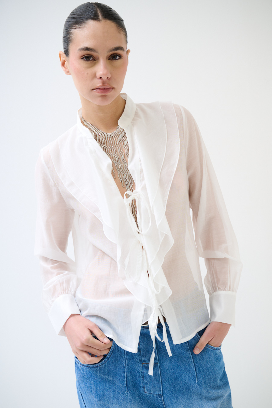Tunica with semi-sheer ties and wide galettes on the neckline