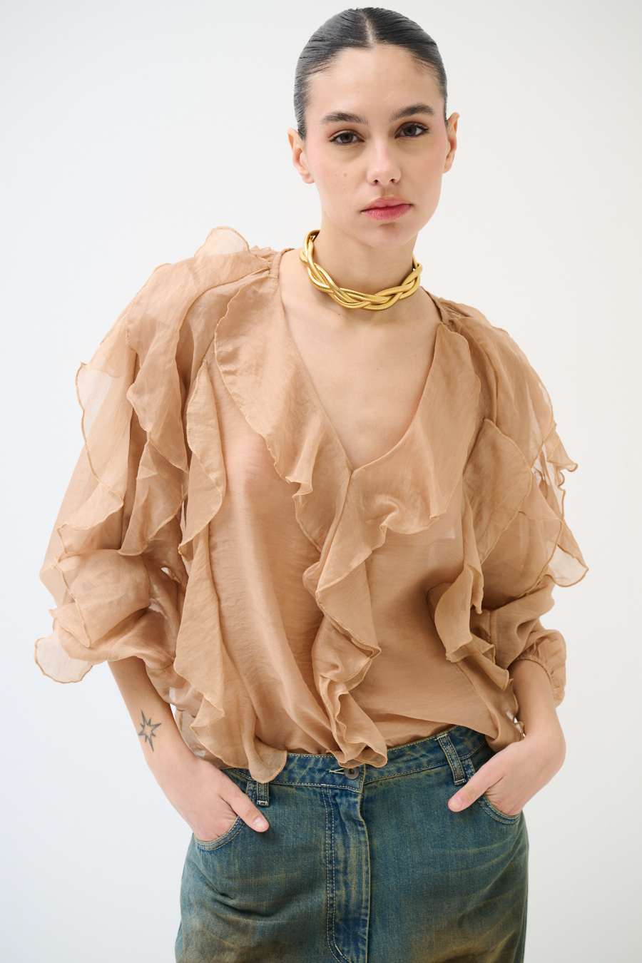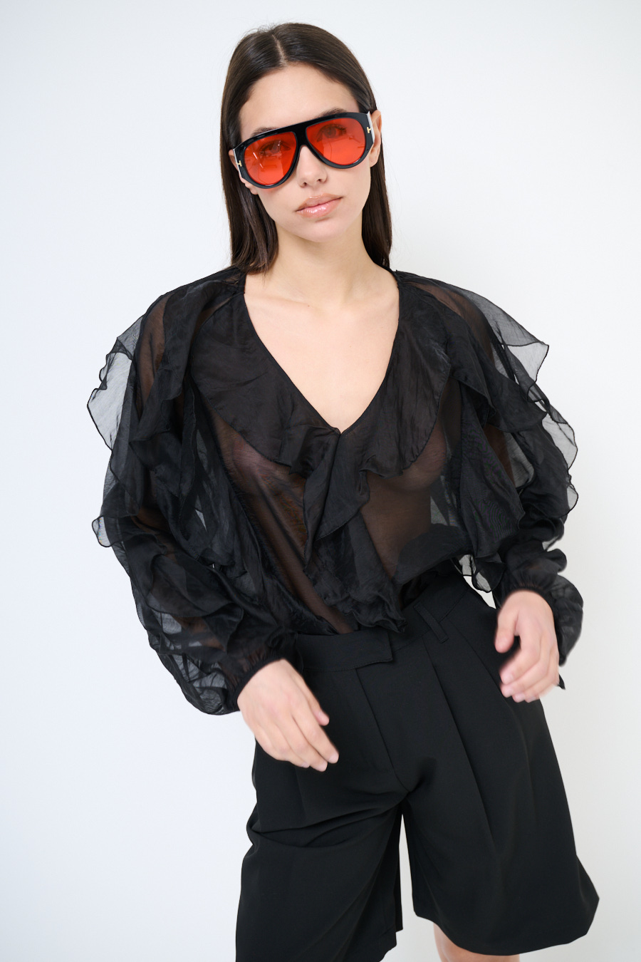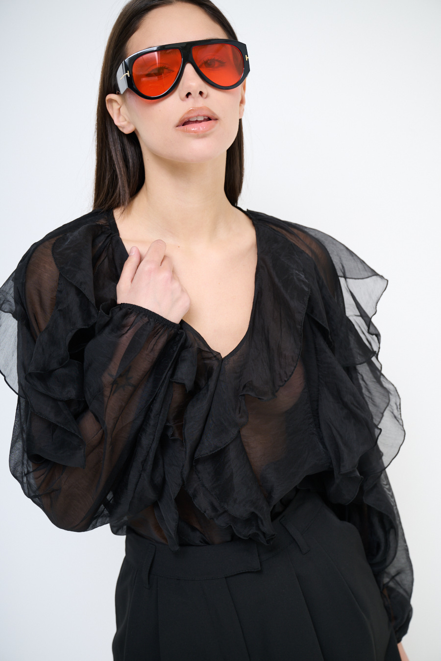 Blusa con scollo a v e jabot frontale, gale anche su manica ampia