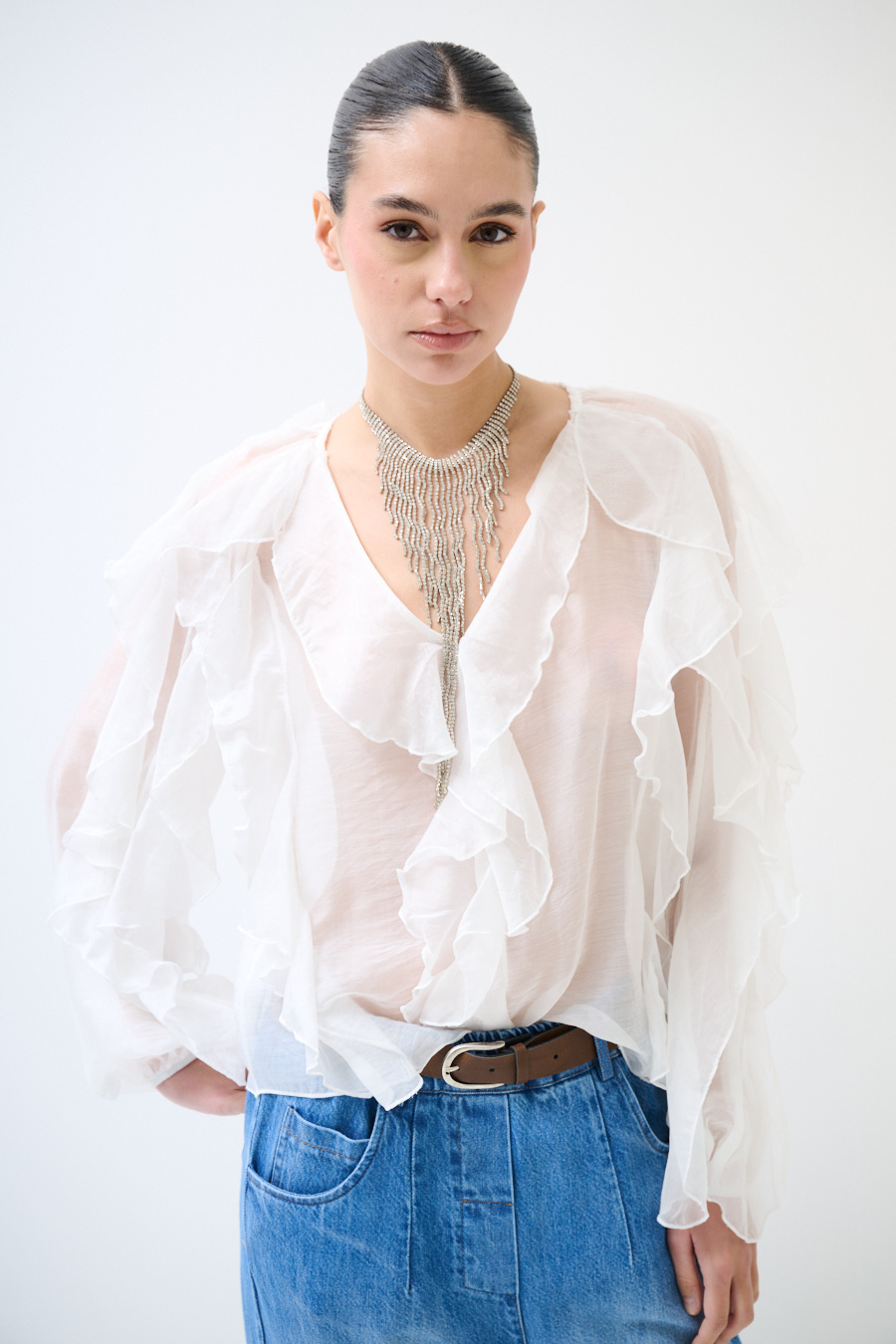 Blusa con scollo a v e jabot frontale, gale anche su manica ampia