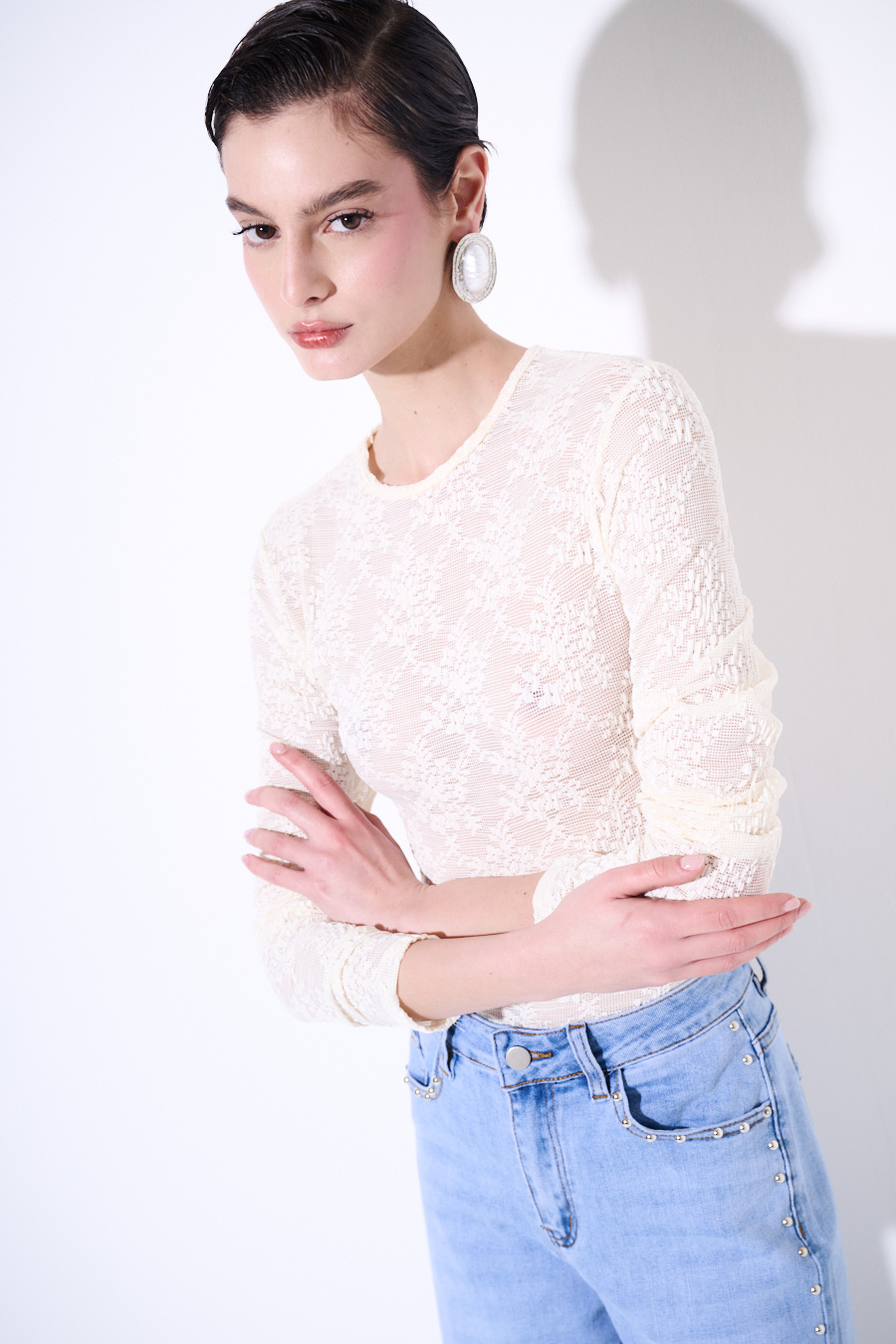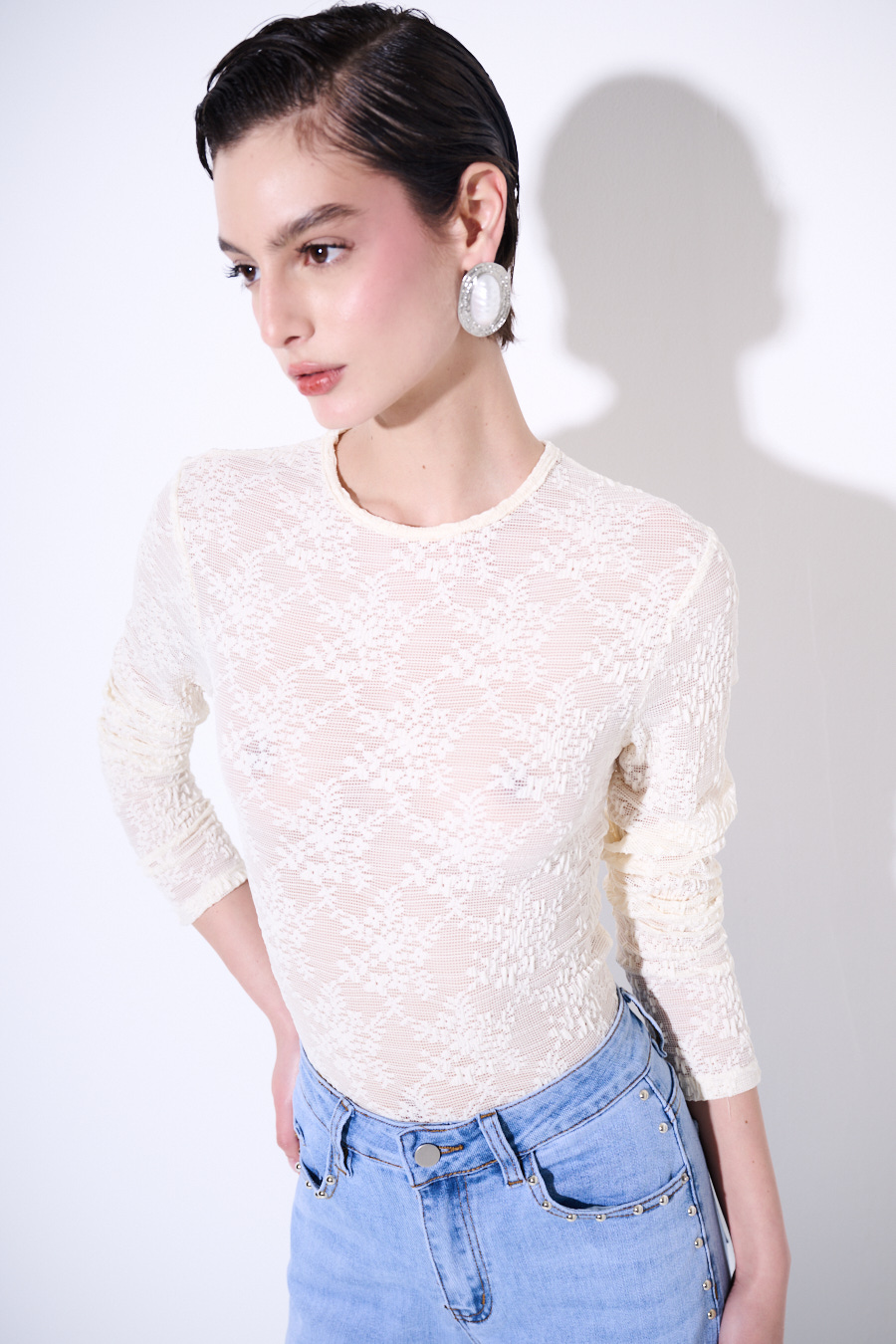 Body in pizzo in tessuto stretch con manica lunga e girocollo