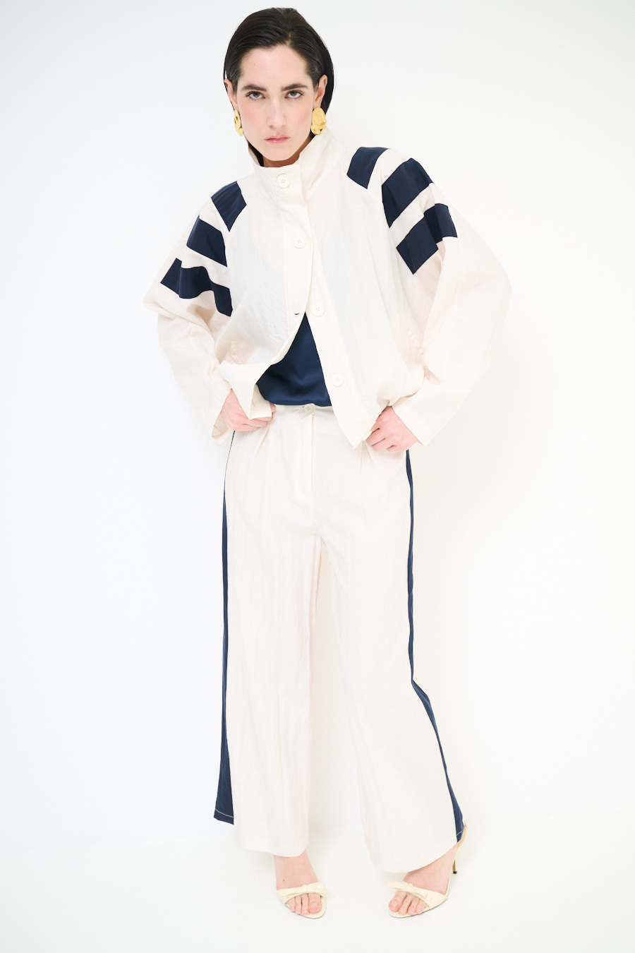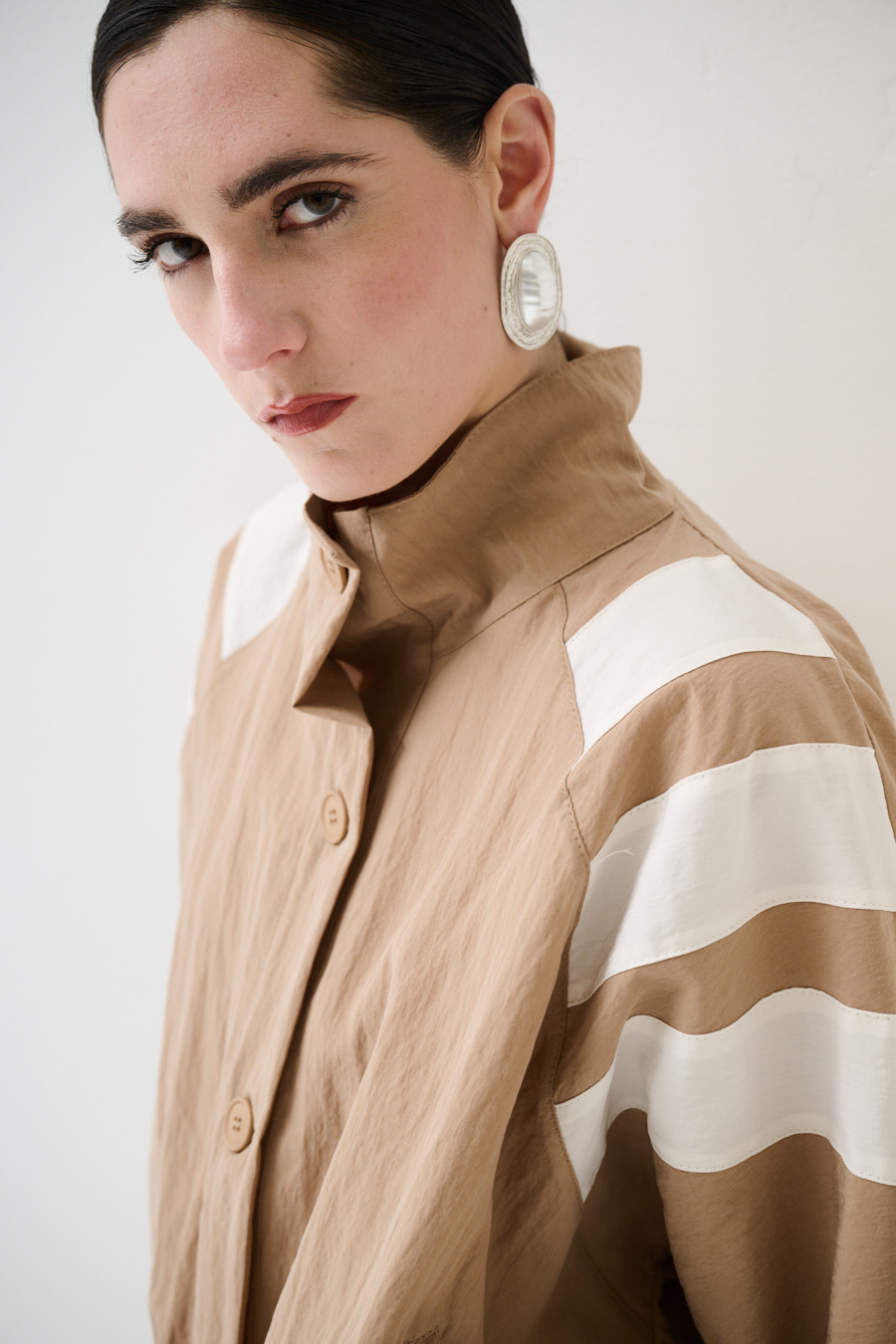 Bomber in lyocell crop arricciato sul fondo, con ampie bande a contrasto sulla spalla, con mezzo collo e abbottonatura centrale