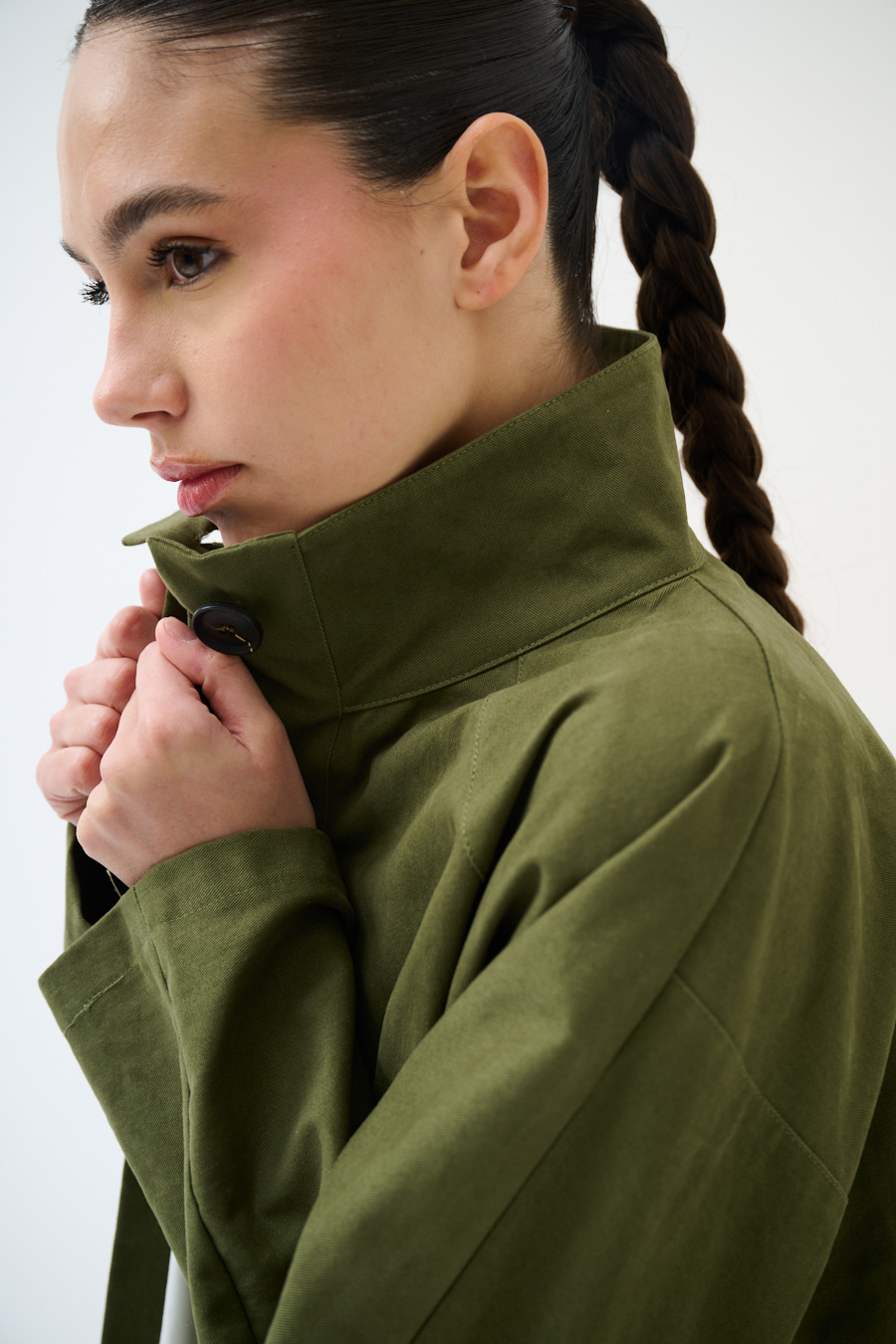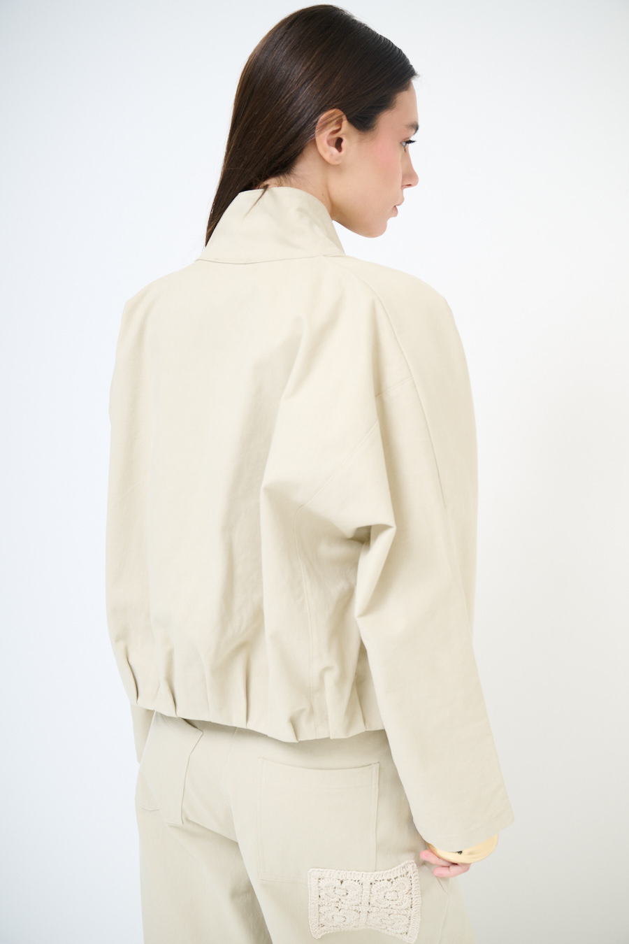 Giubbotto in gabardina con mezzo collo, abbottonatura centrale, con taschini frontali e arricciato sul fondo