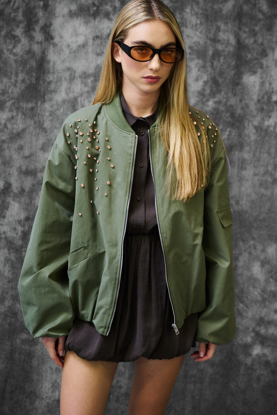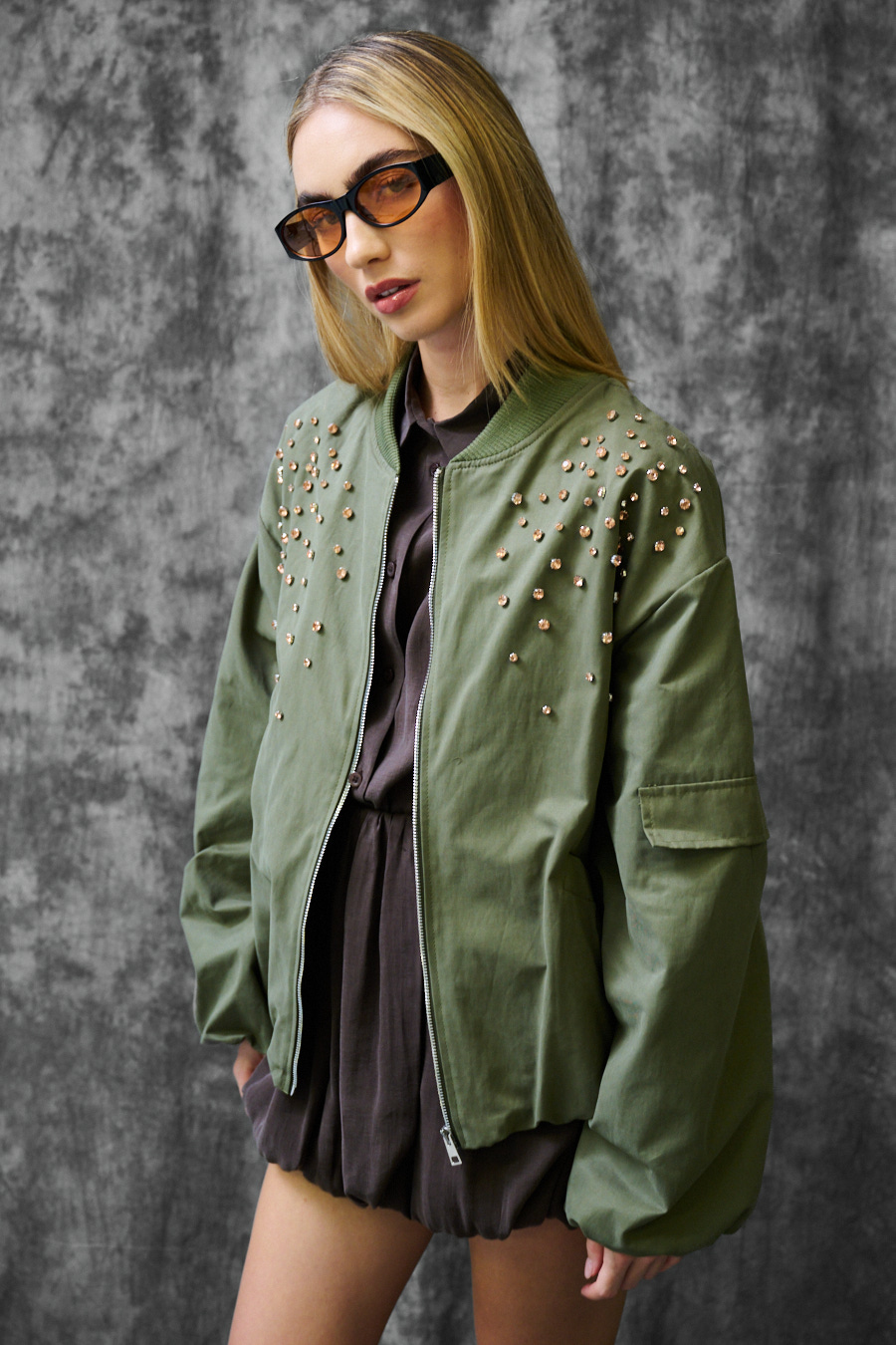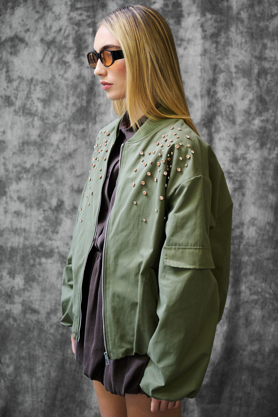 Bomber corto con ampie tasche oblique, chiusura con zip centrale e castoni gioiello sulle spalle, con fodera interna