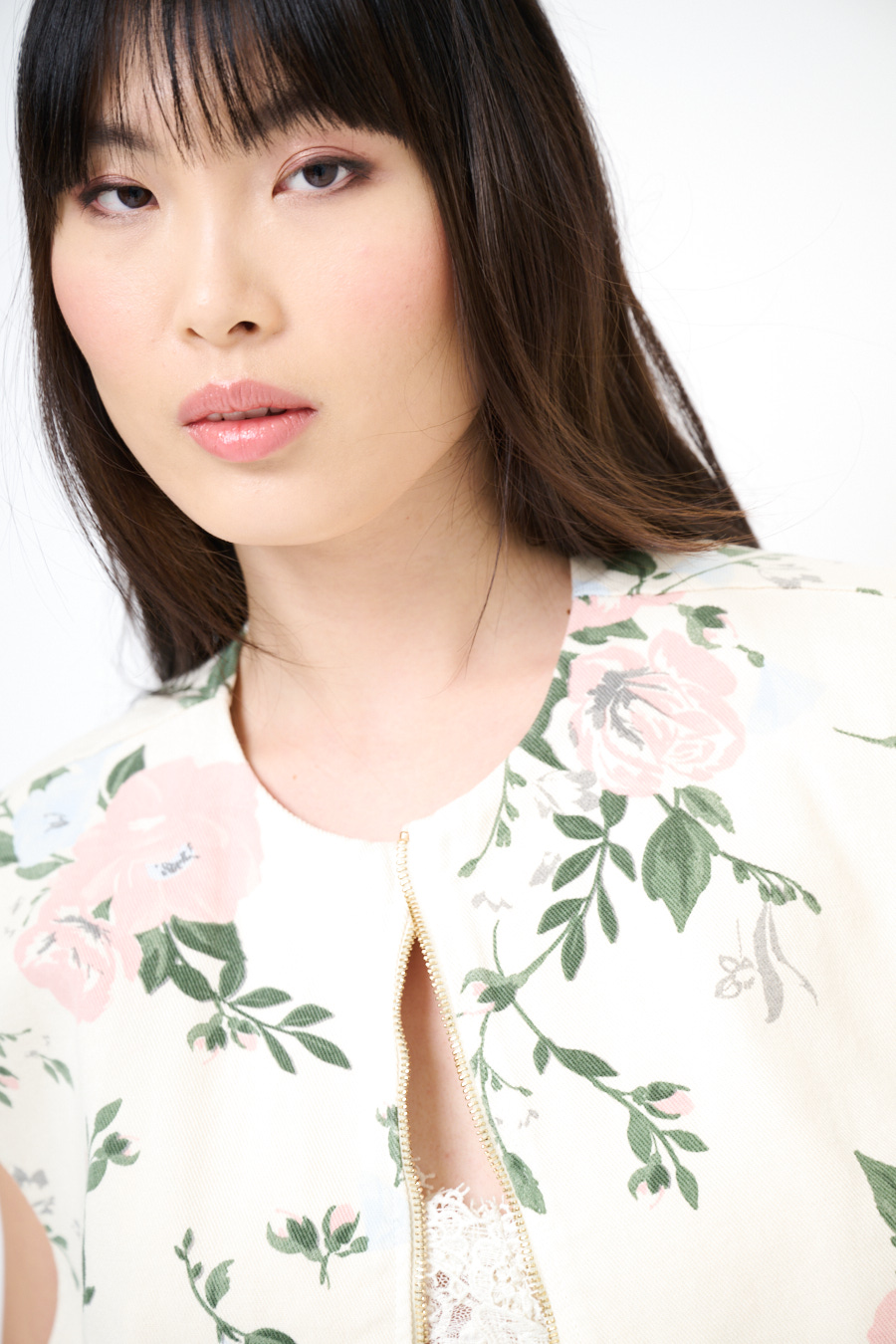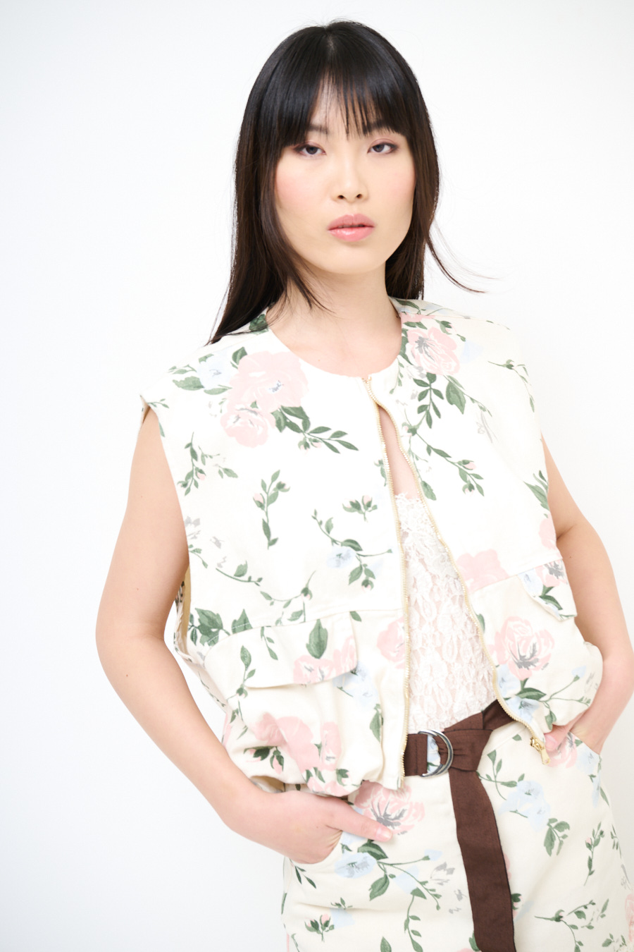 Bomber gilet in gabardina stampata floreale con zip centrale, più lungo sul retro con fodera interna