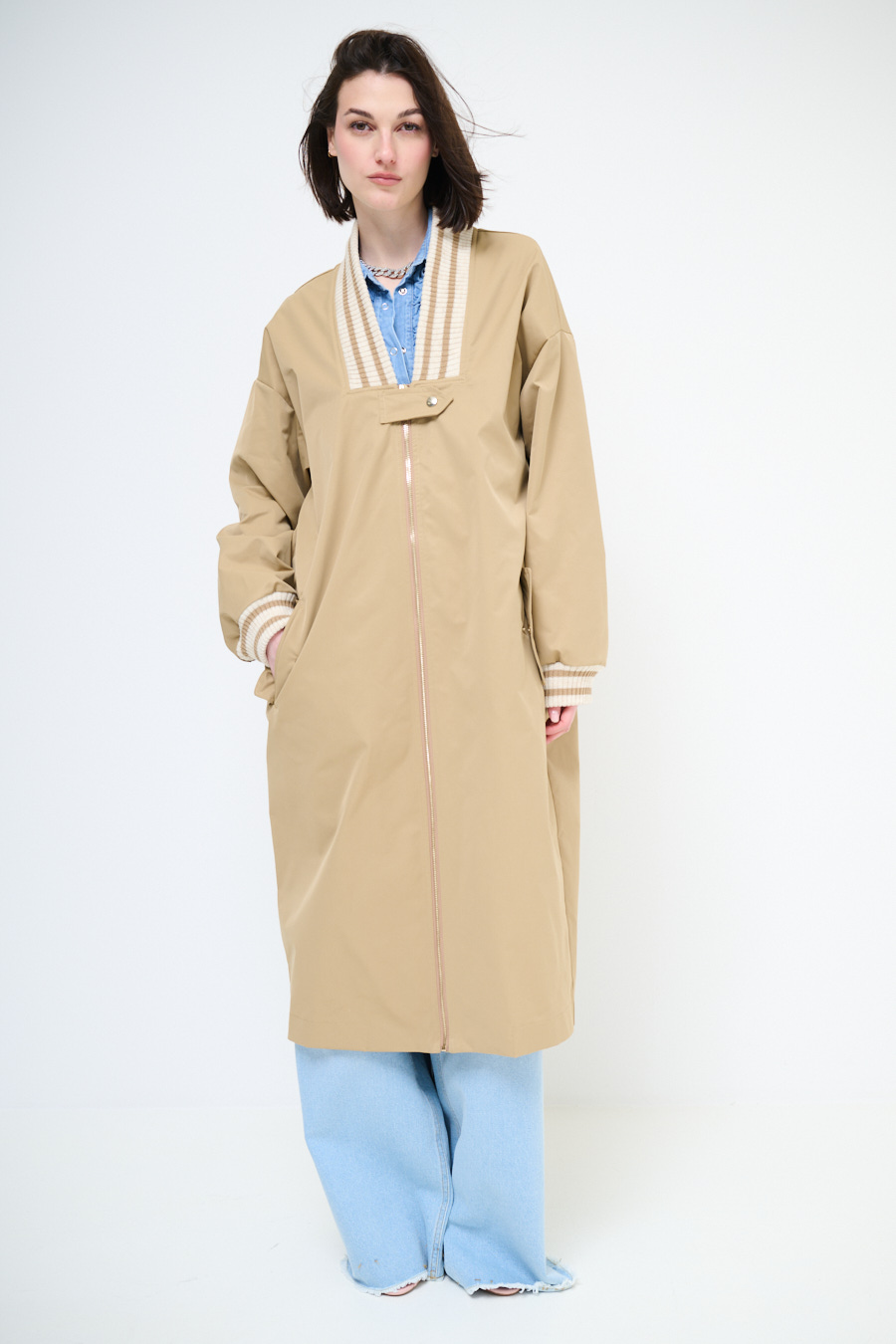 Bomber lungo con scollo e polsini in maglia a coste e righe, con zip lunga centrale, tasconi e spalla calata