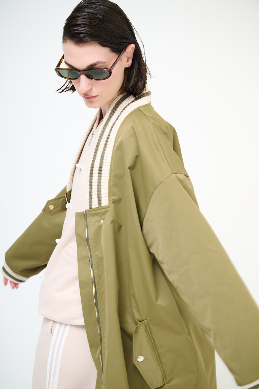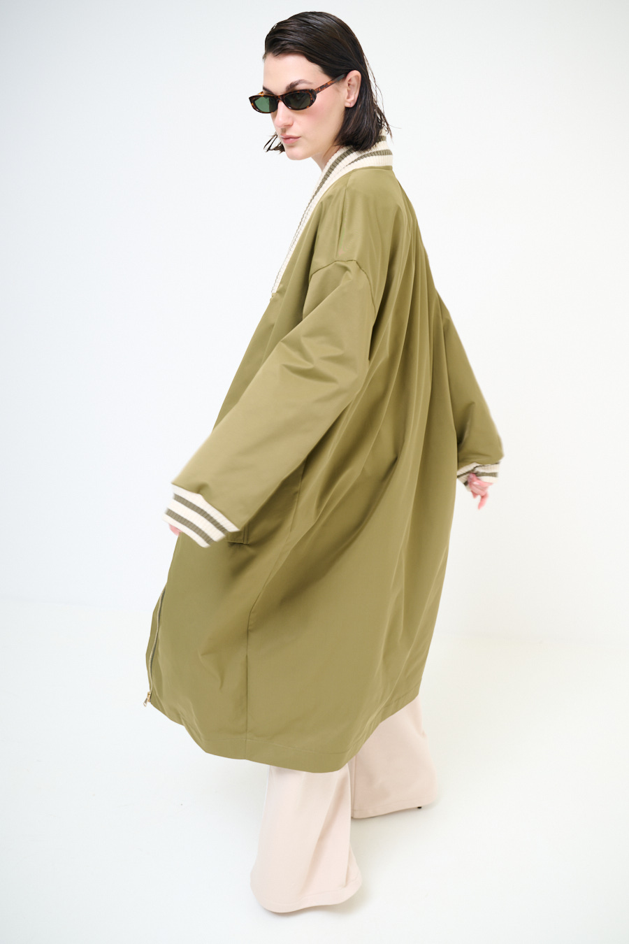 Bomber lungo con scollo e polsini in maglia a coste e righe, con zip lunga centrale, tasconi e spalla calata