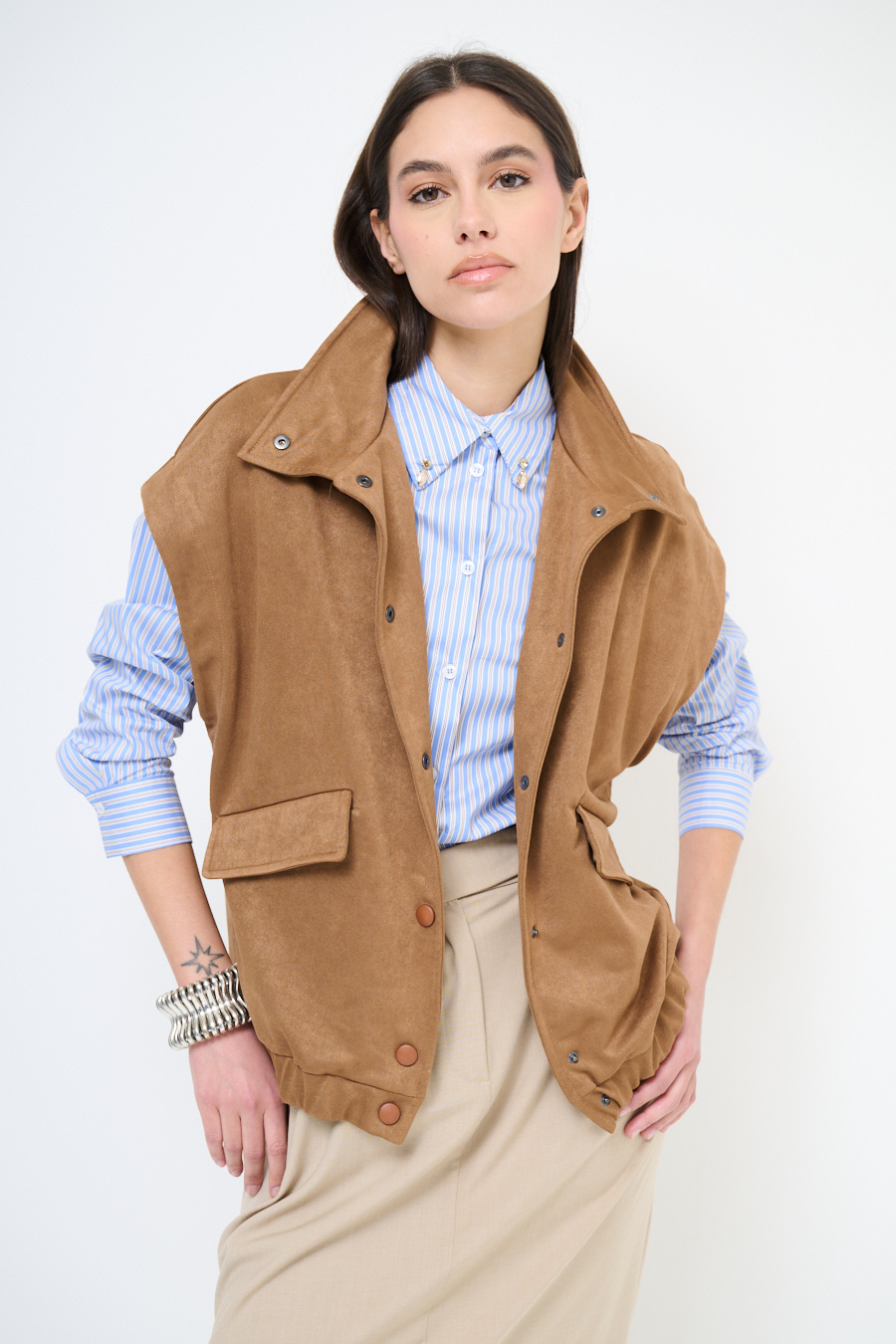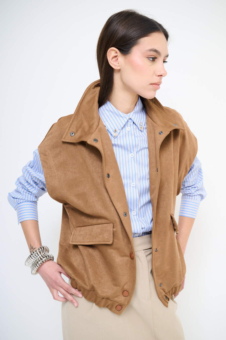 Giubbotto oversize in dainetto smanicato con taschini frontali, abbottonatura con bottoni a pressione e elasticizzato sul fondo