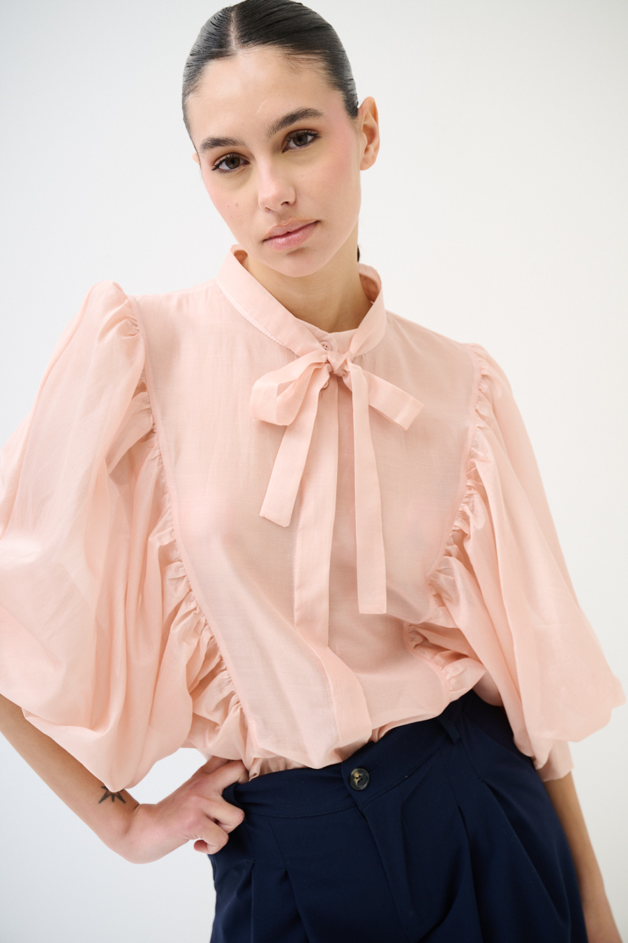 Camicia in lyocell semitrasparente con colletto a coreana con fiocco e manica a pipostrello con polsino alto a tre bottoni