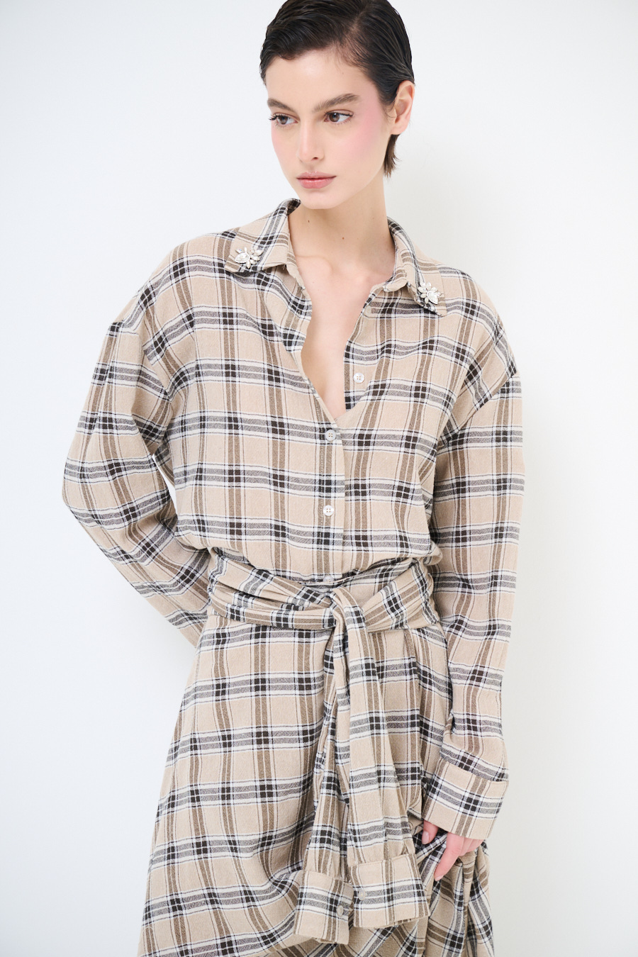Camicia a quadri oversize con dettagli gioiello applicati sul colletto, abbottonatura classica frontale