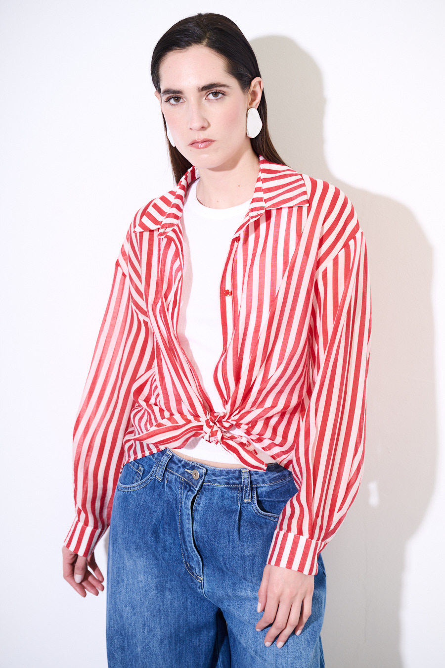 Camicia oversize a righe con manica lunga, abbottonatura centrale e nodo sul fronte