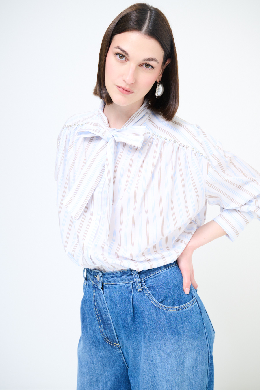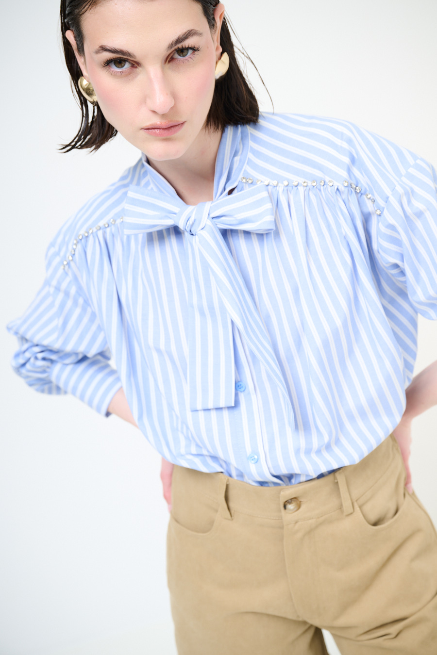 Camicia over a righe con fiocco al collo e castoni applicati sulle spalle, con polsino alto