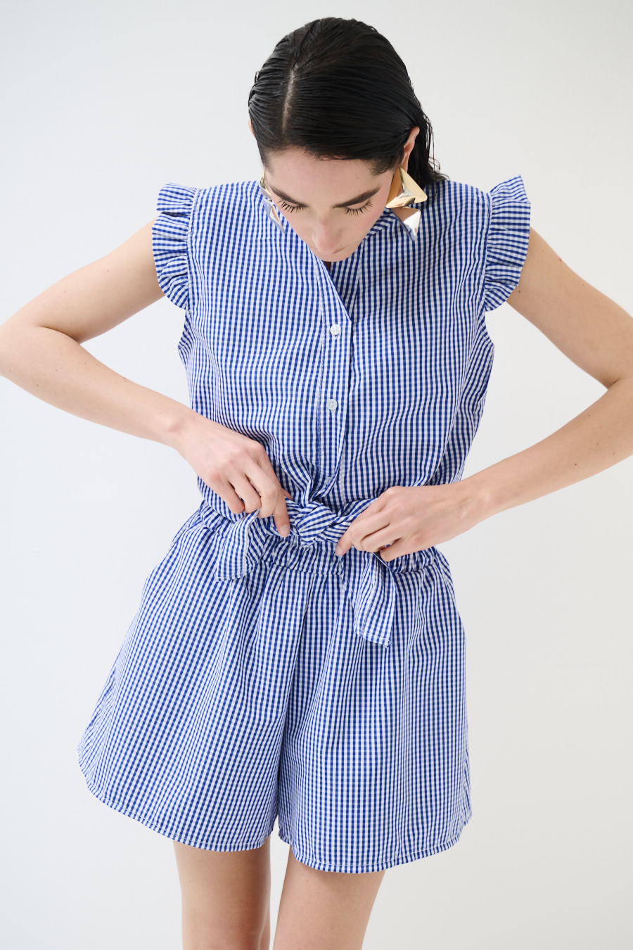 Camicia smanicata a quadretti con alette sulle spalle e collo a coreana, annodata sul fondo