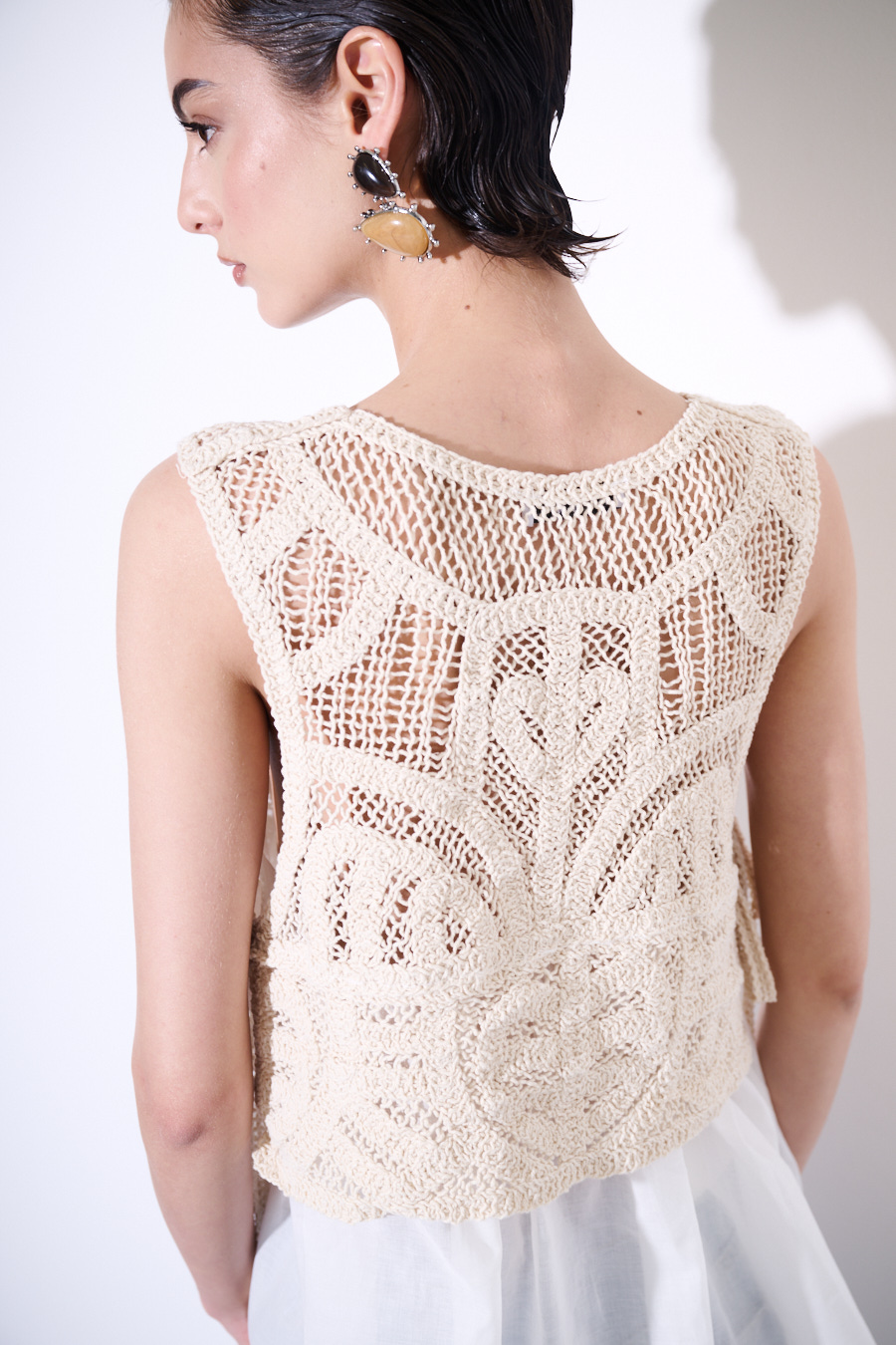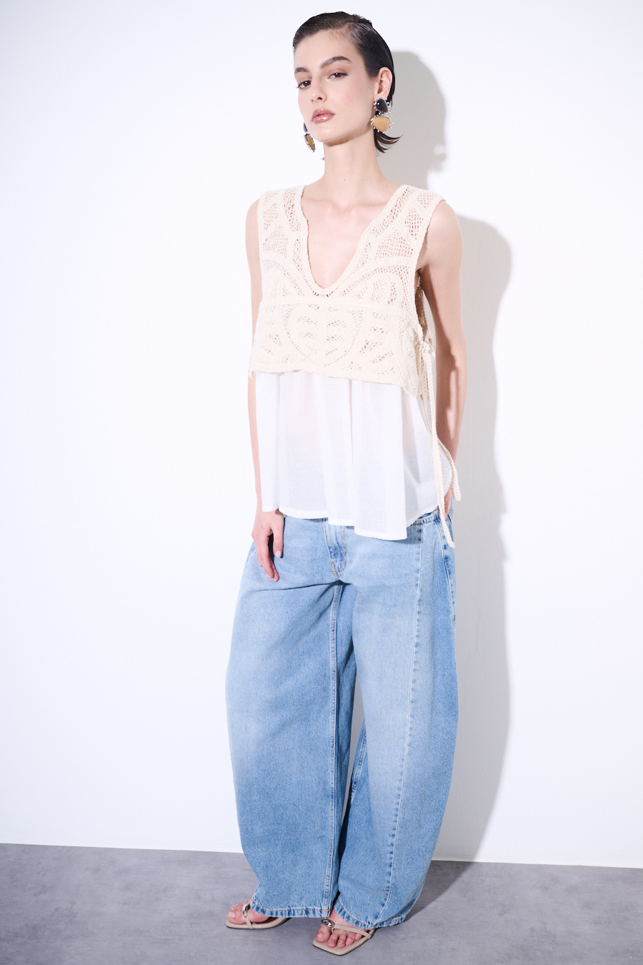 Canotta in mussola di cotone con sovrapposizione di top in macramè