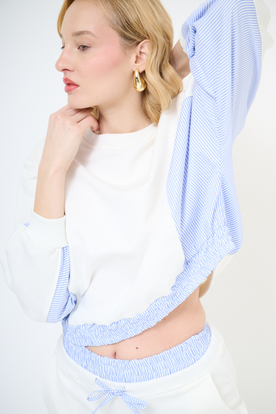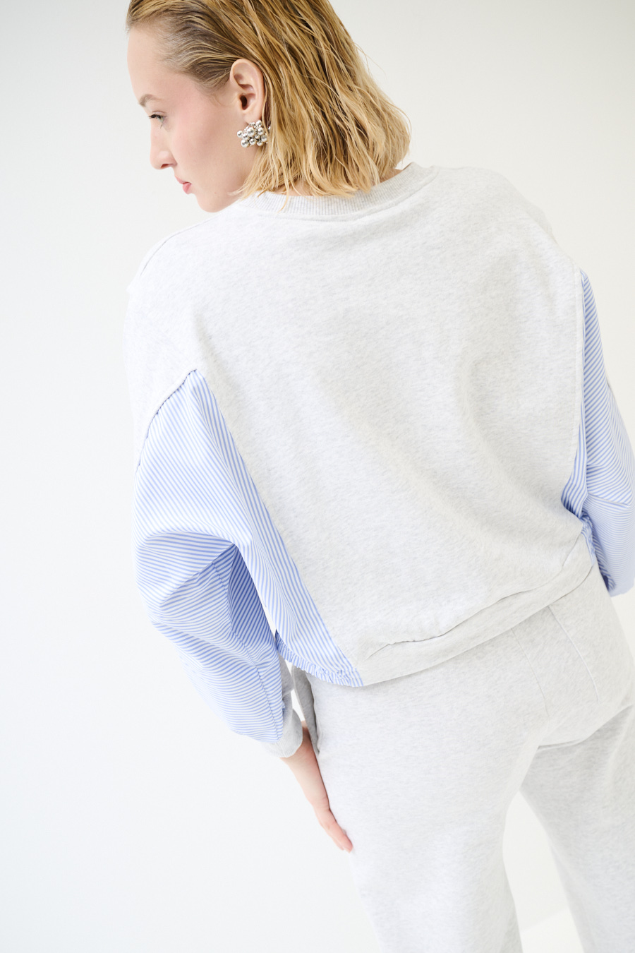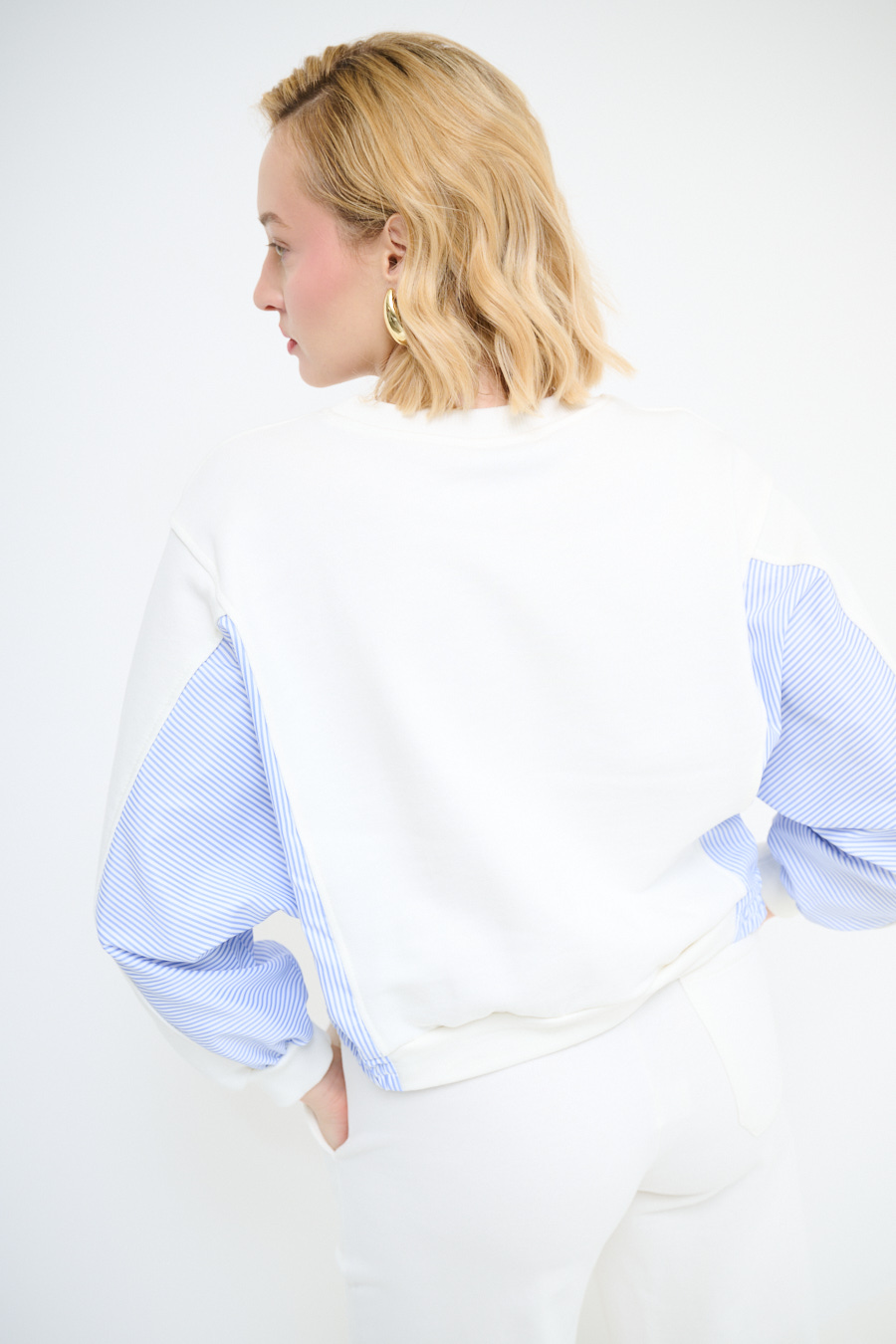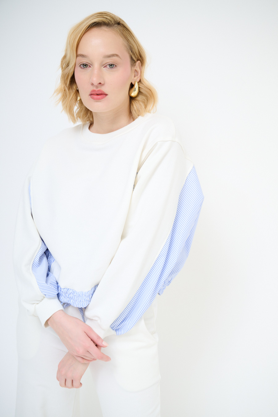 Brushed crewneck sweatshirt with striped poplin insert on the side, sleeve and elastic hem