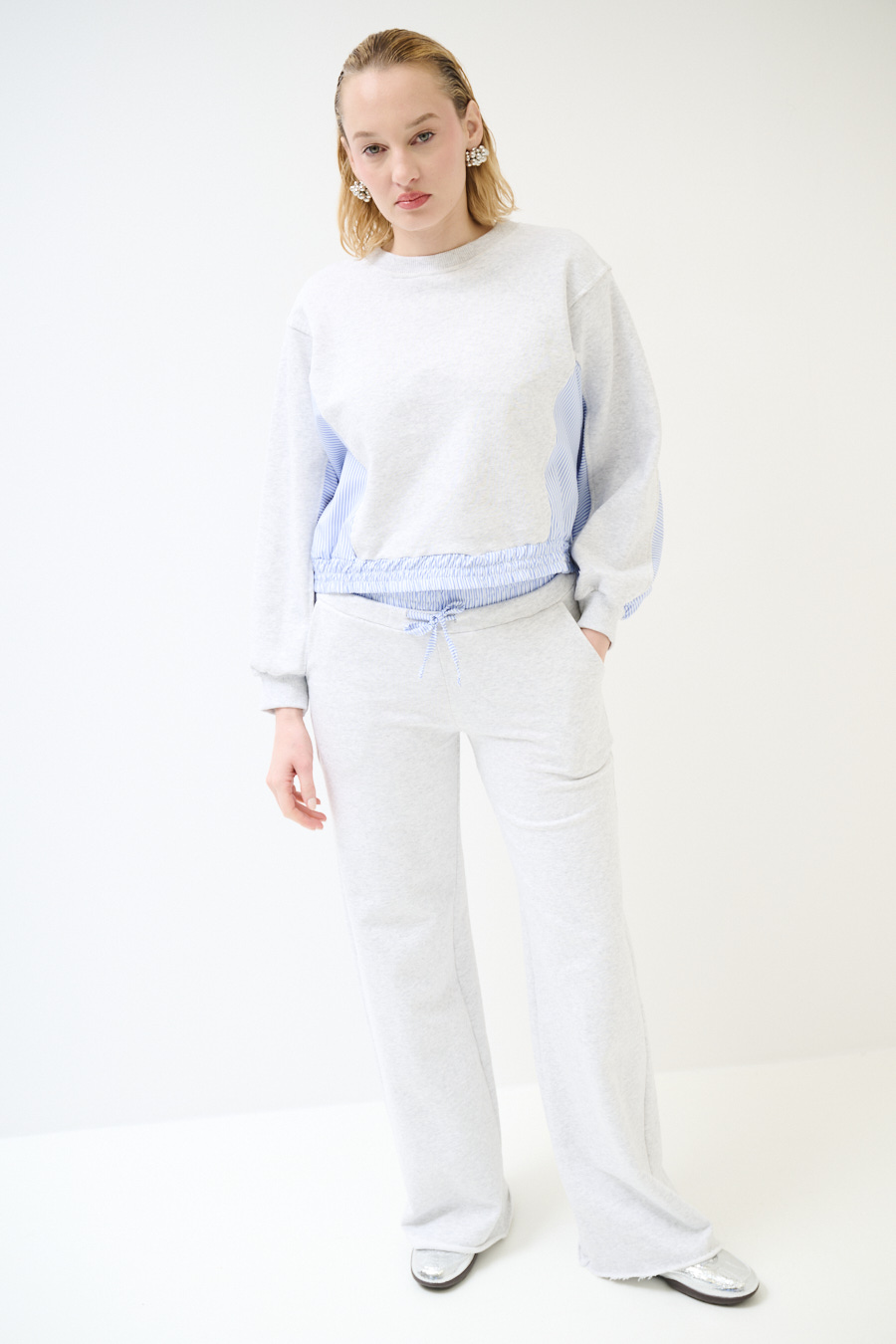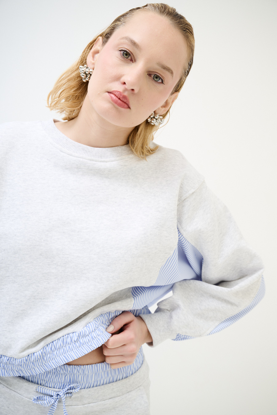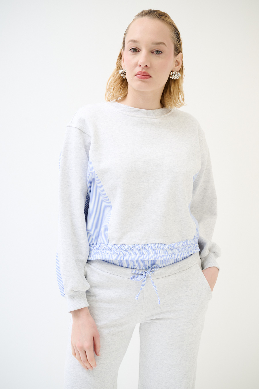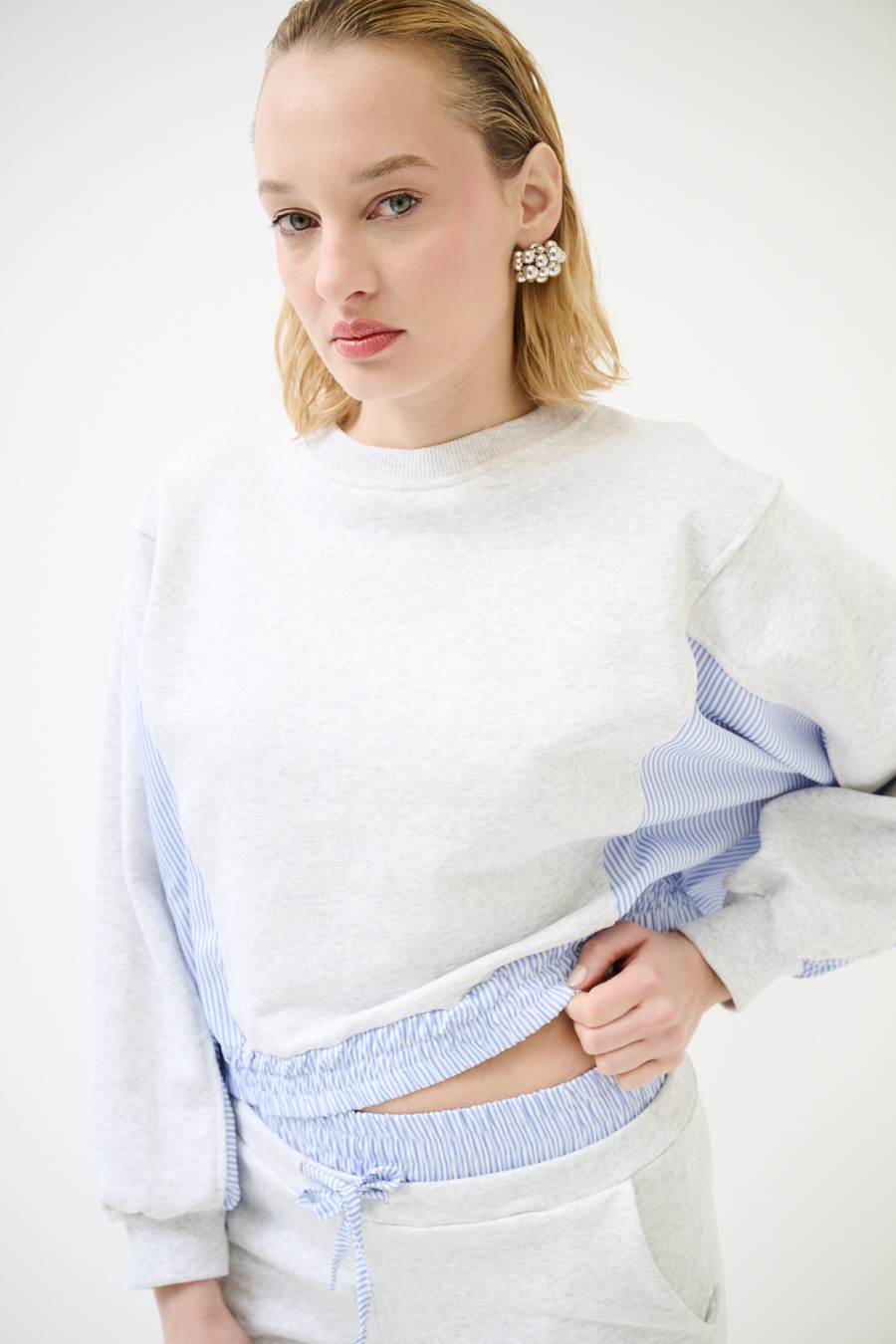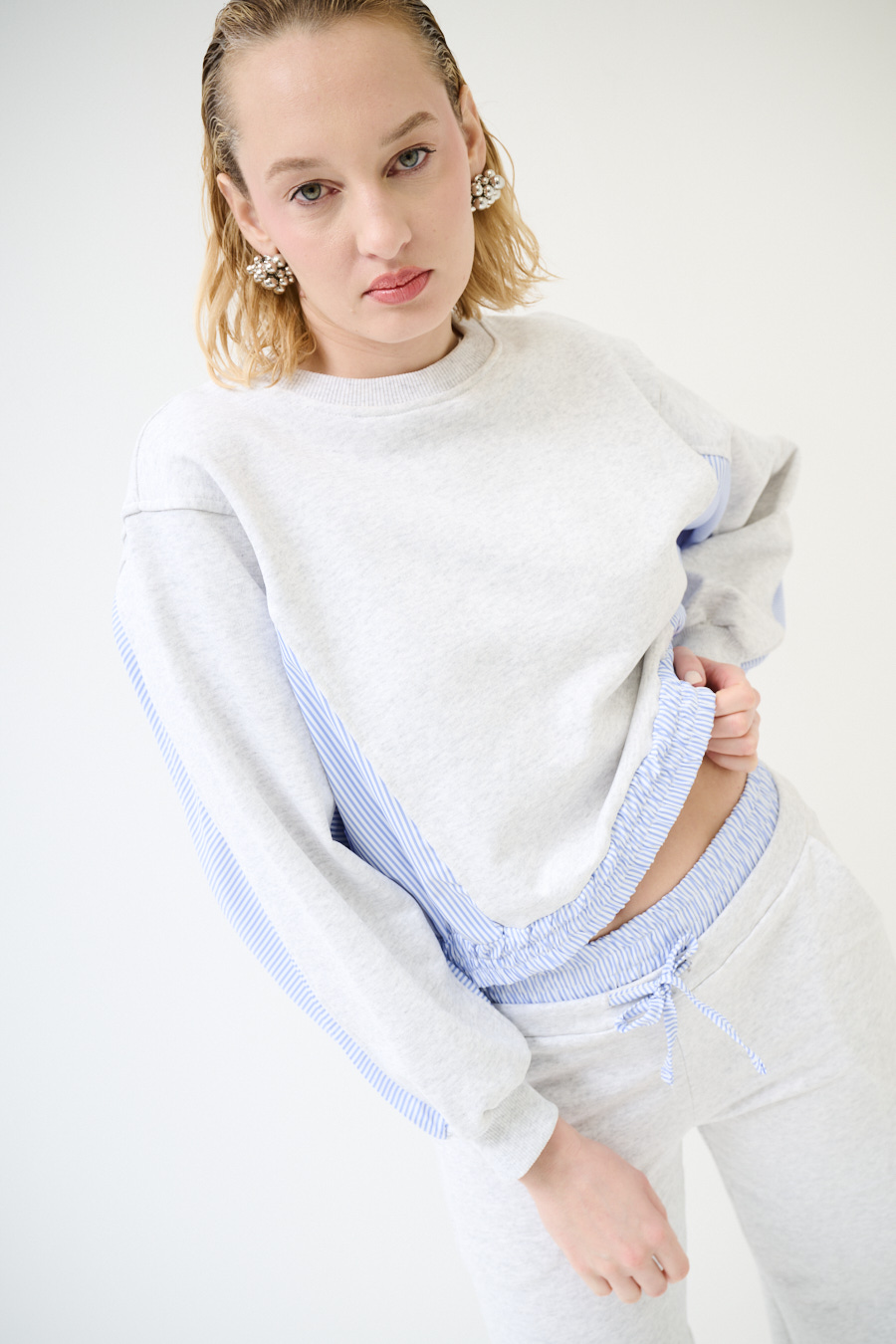 Brushed crewneck sweatshirt with striped poplin insert on the side, sleeve and elastic hem