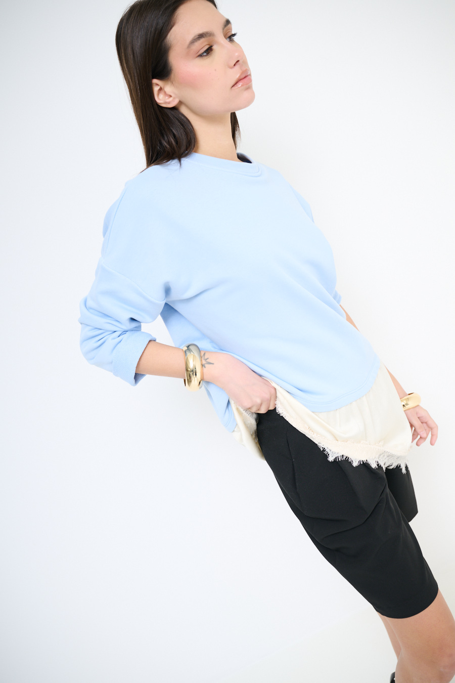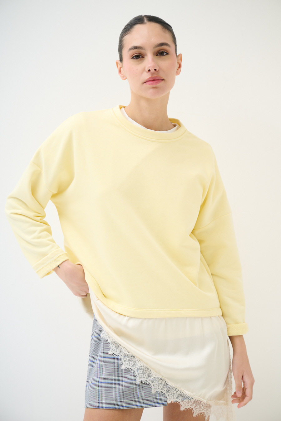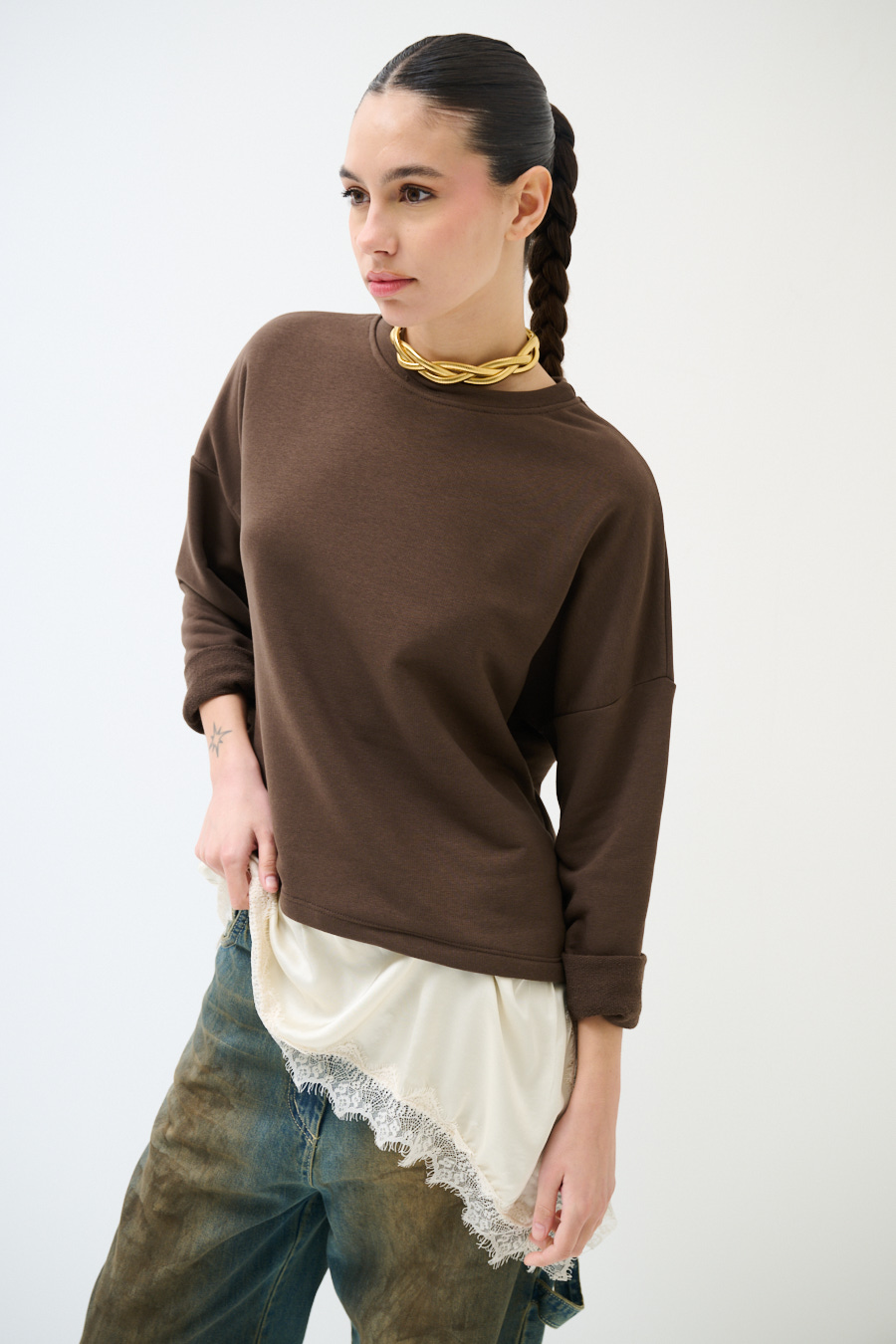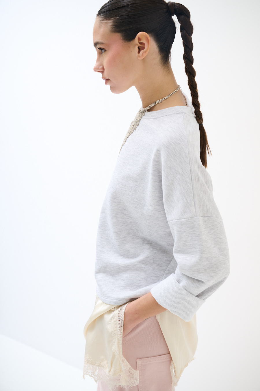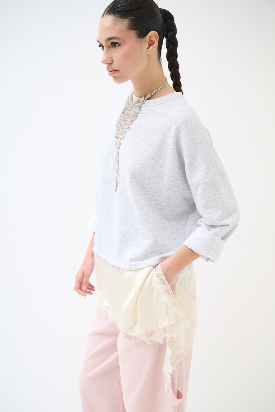 Brushed oversized sweatshirt with dropped shoulder and asymmetric satin hem with lace trim