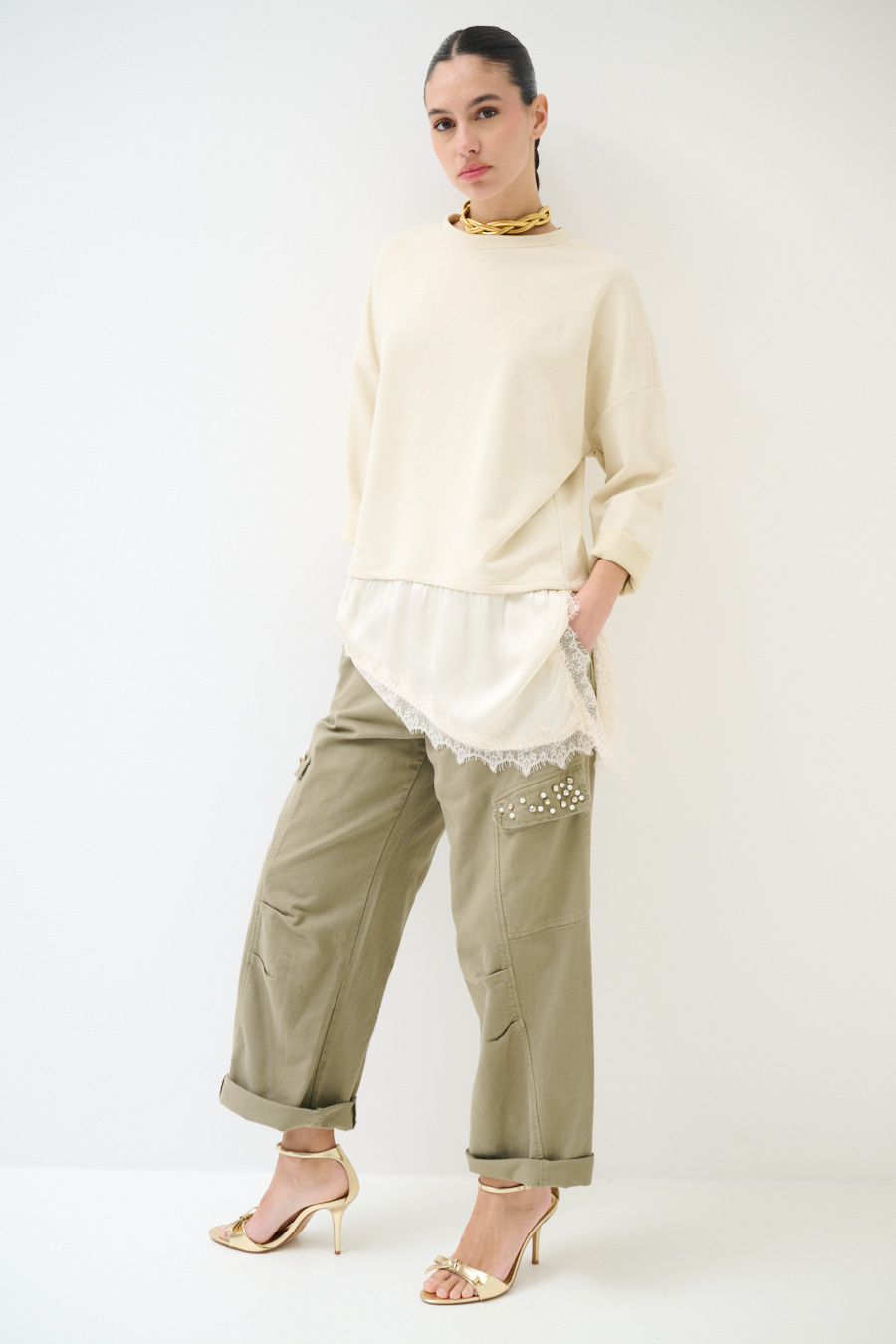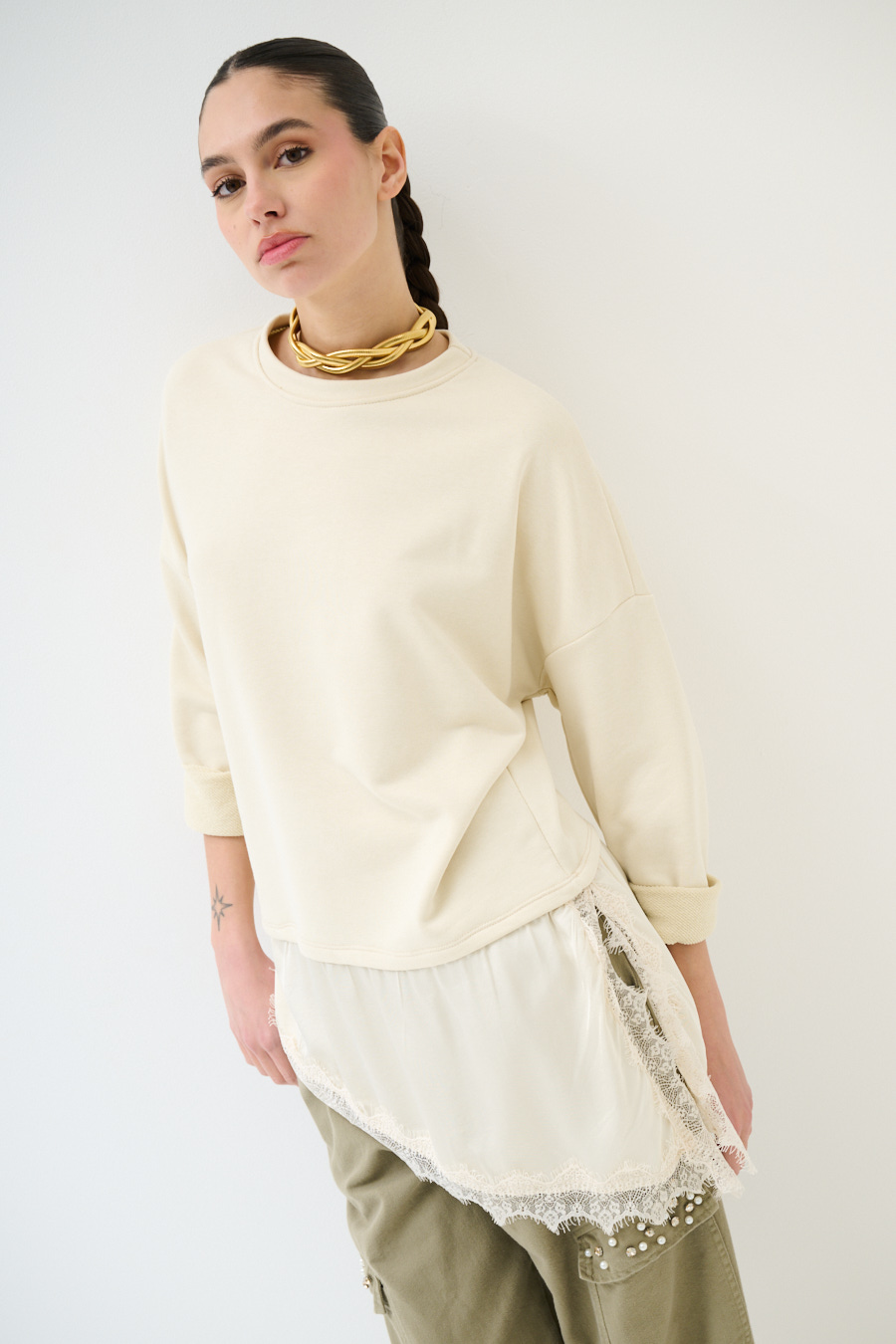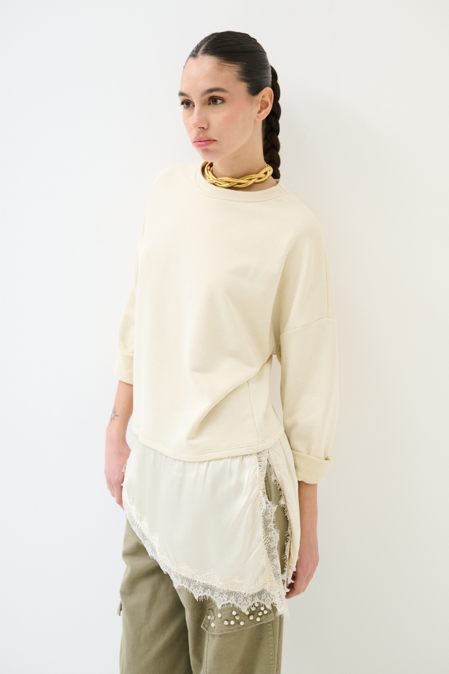 FELPA OVER CON RASO E PIZZO ASIMMETRICO