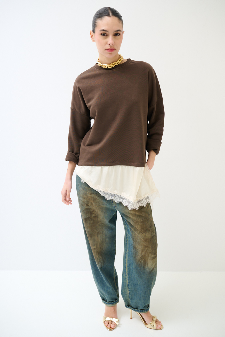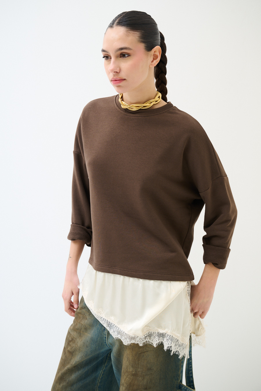 FELPA OVER CON RASO E PIZZO ASIMMETRICO MORO