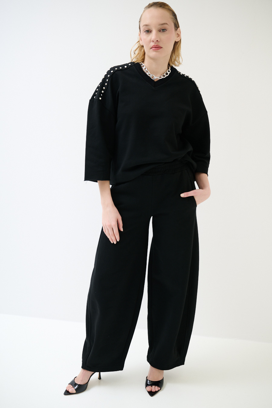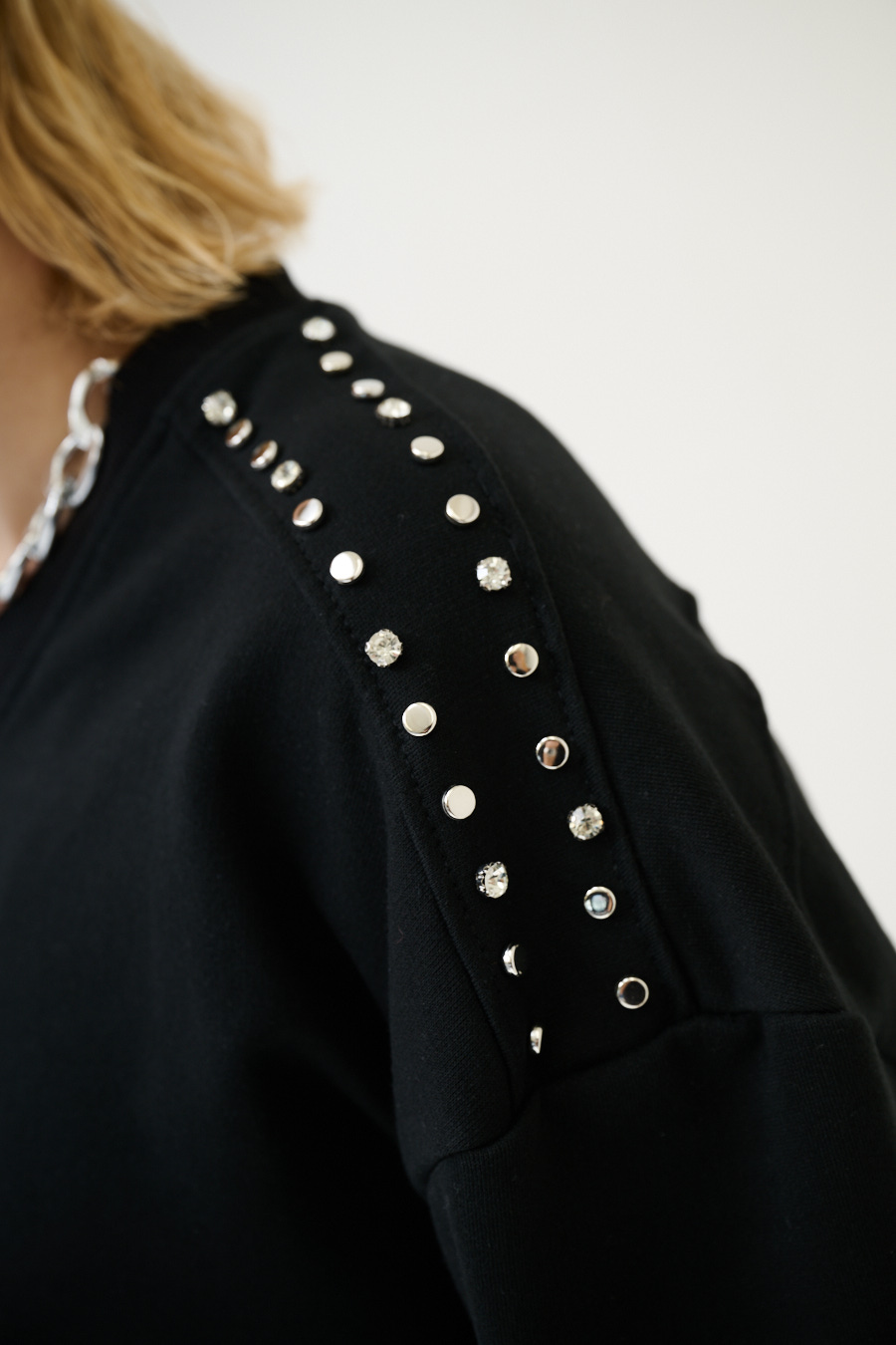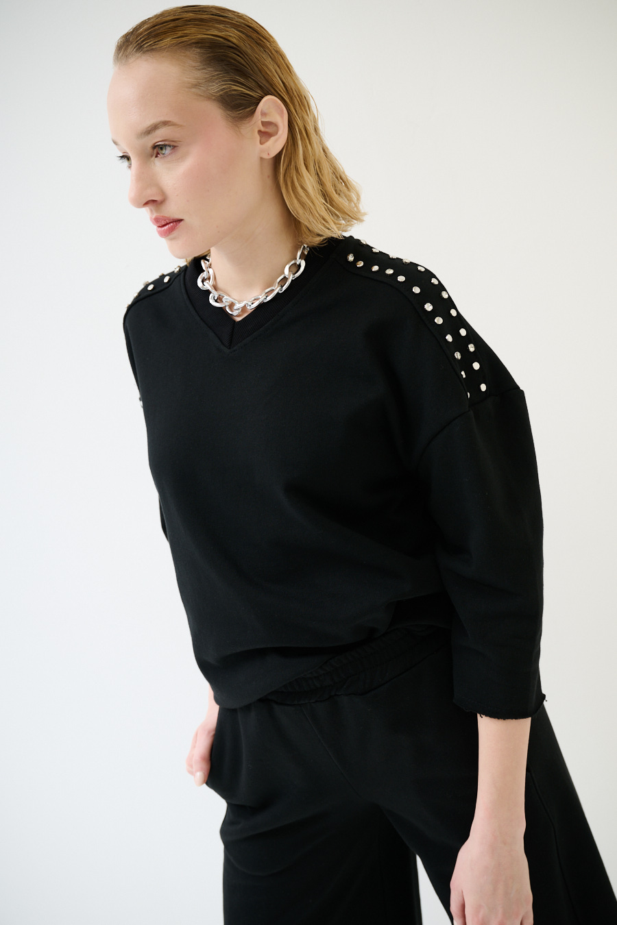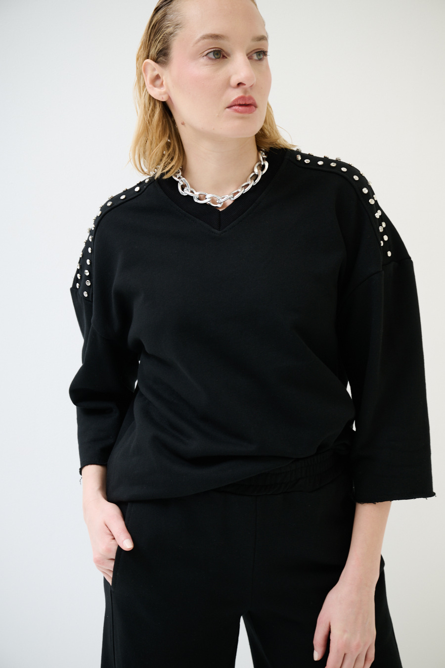 Felpa oversize garzata a mezza manica con scollo a v e applicazione borchie e strass sulle spalle. A taglio vivo su maniche e fondo