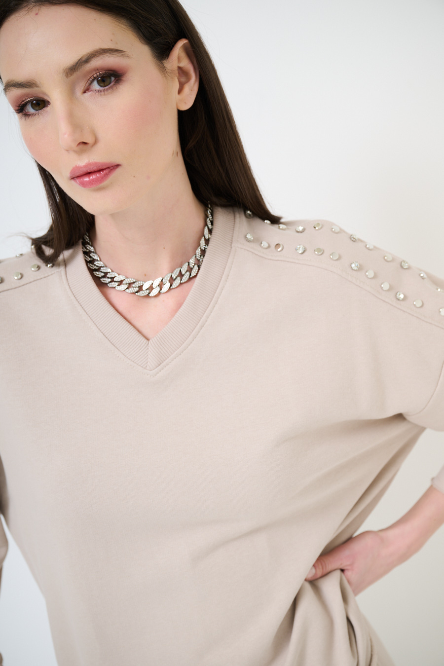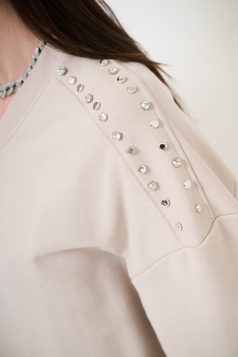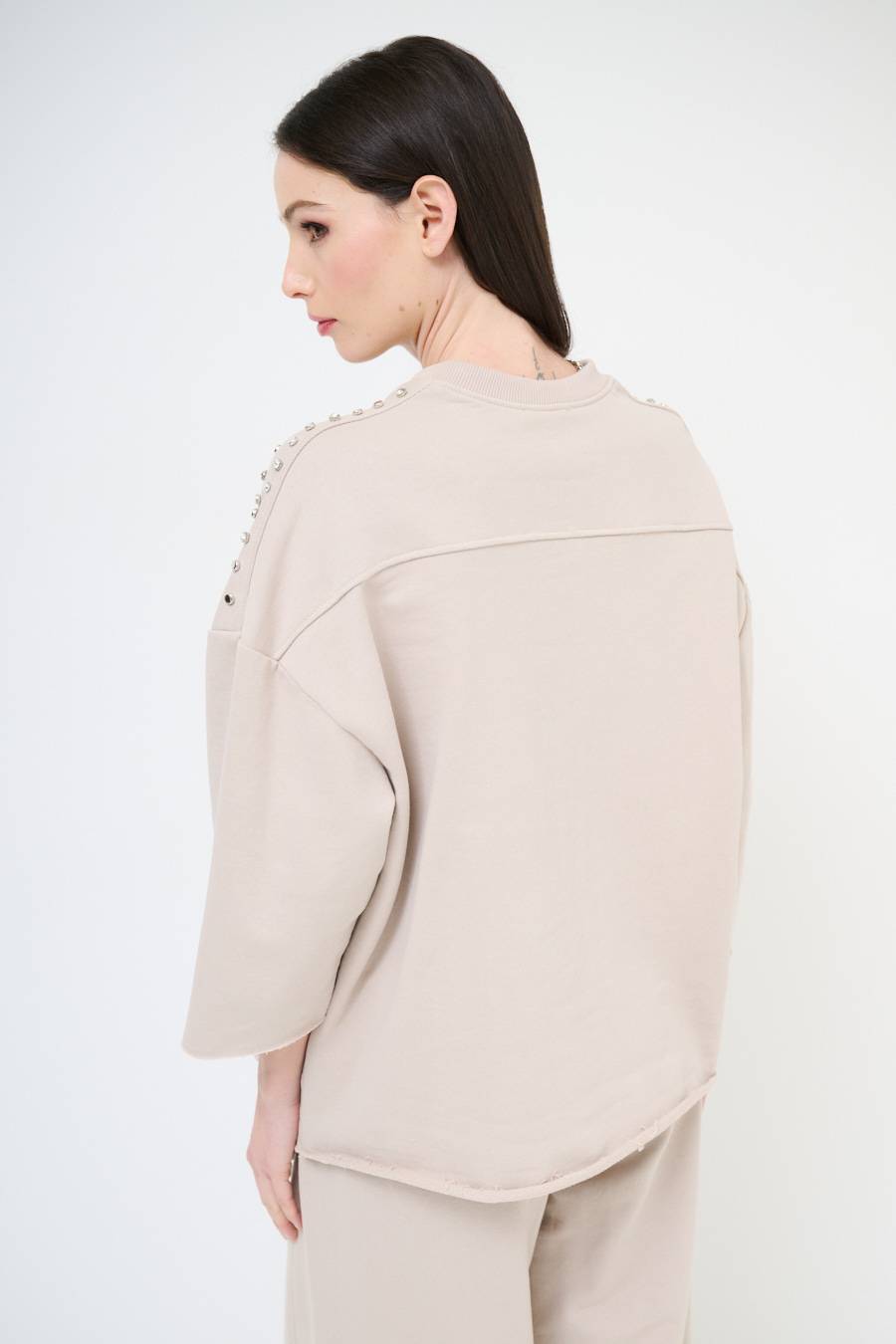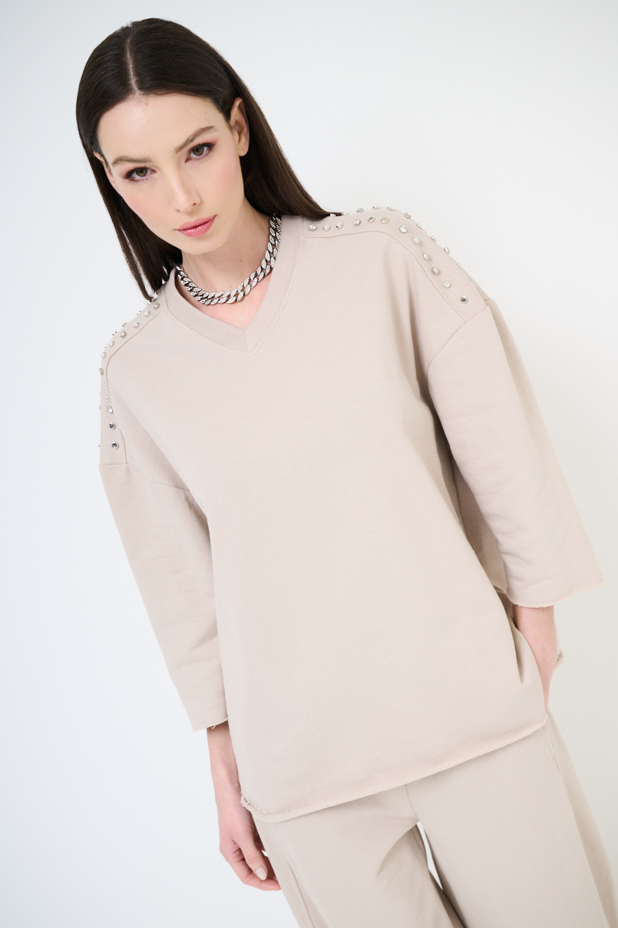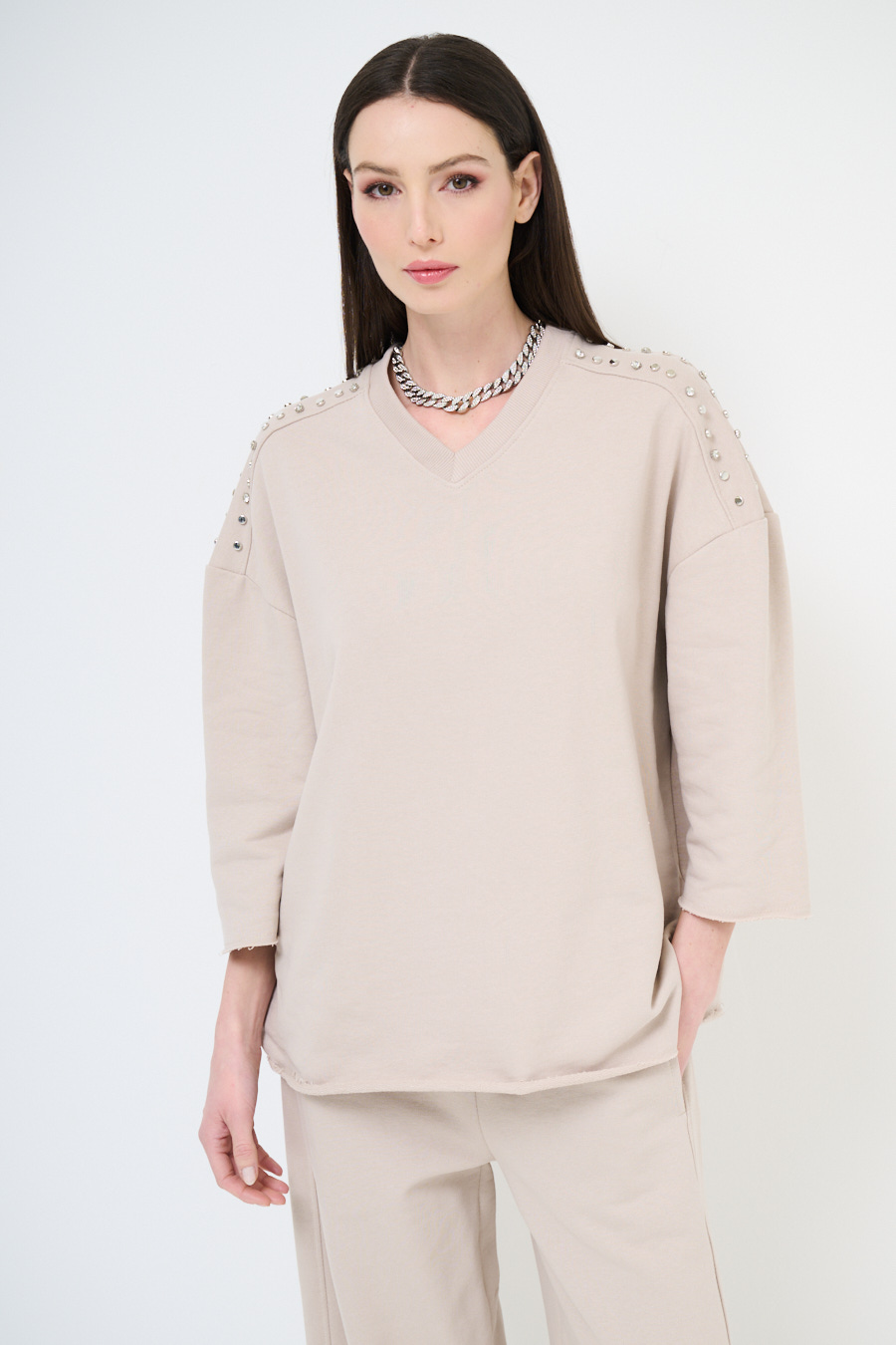 Felpa oversize garzata a mezza manica con scollo a v e applicazione borchie e strass sulle spalle. A taglio vivo su maniche e fondo