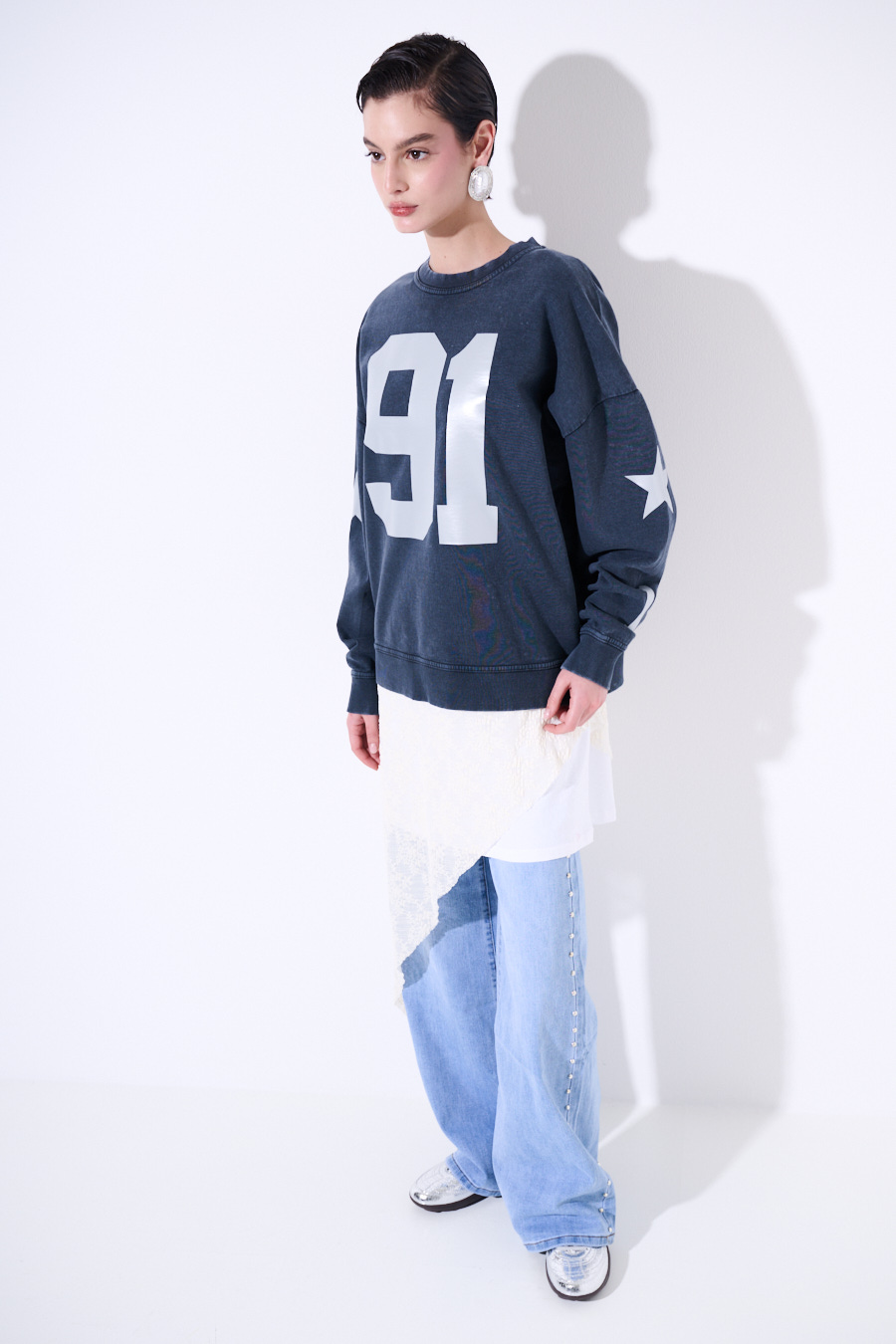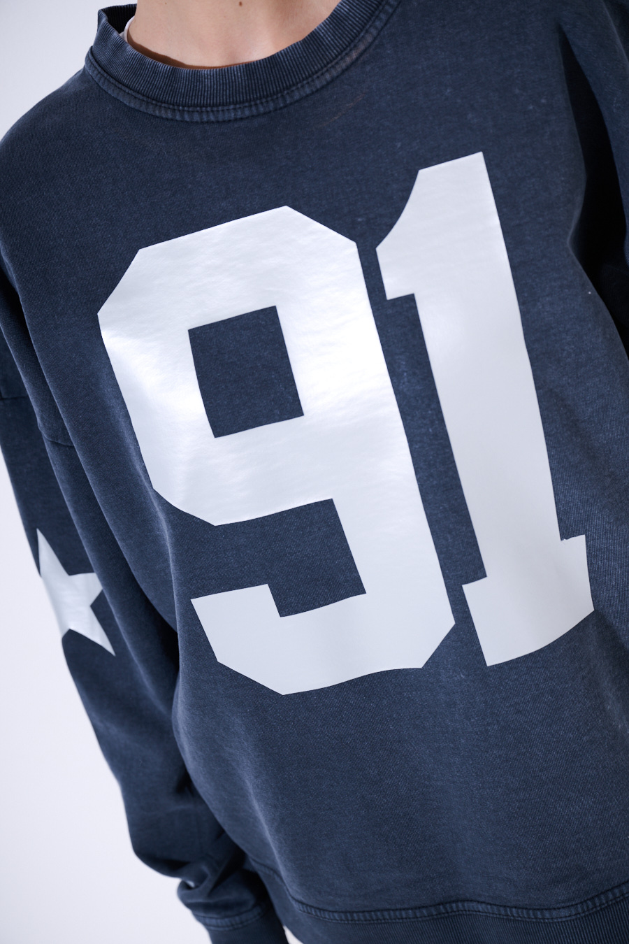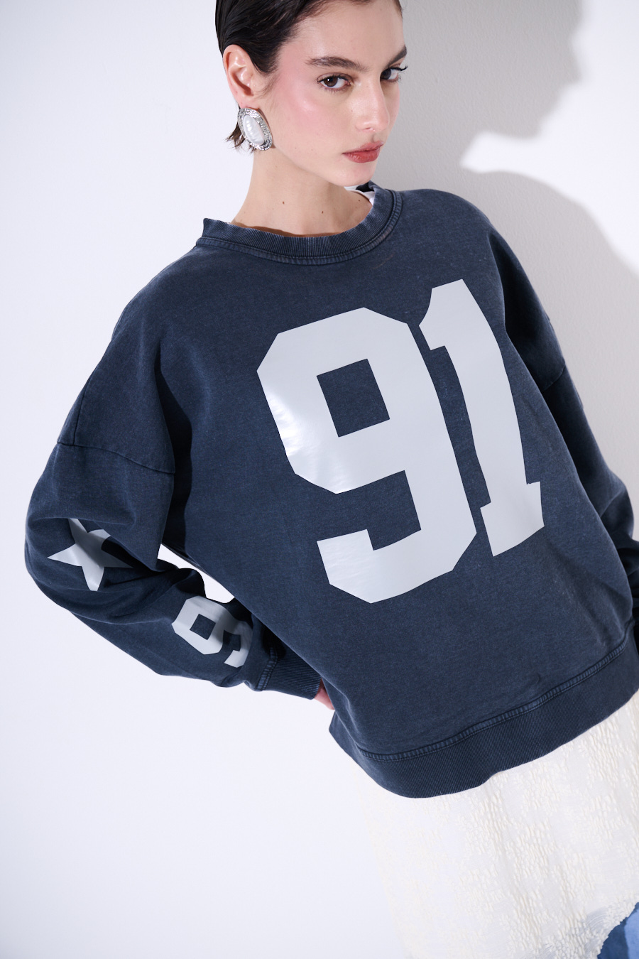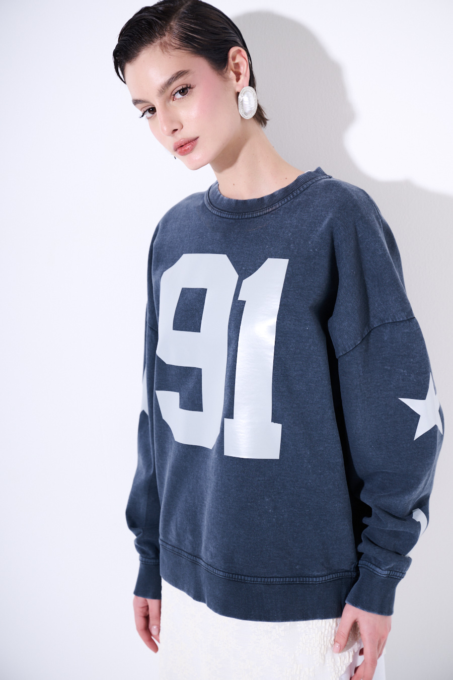 Felpa oversize effetto slavato con stampa numero 91 e stelle sulle manica. Stampa con effetto rifrangente